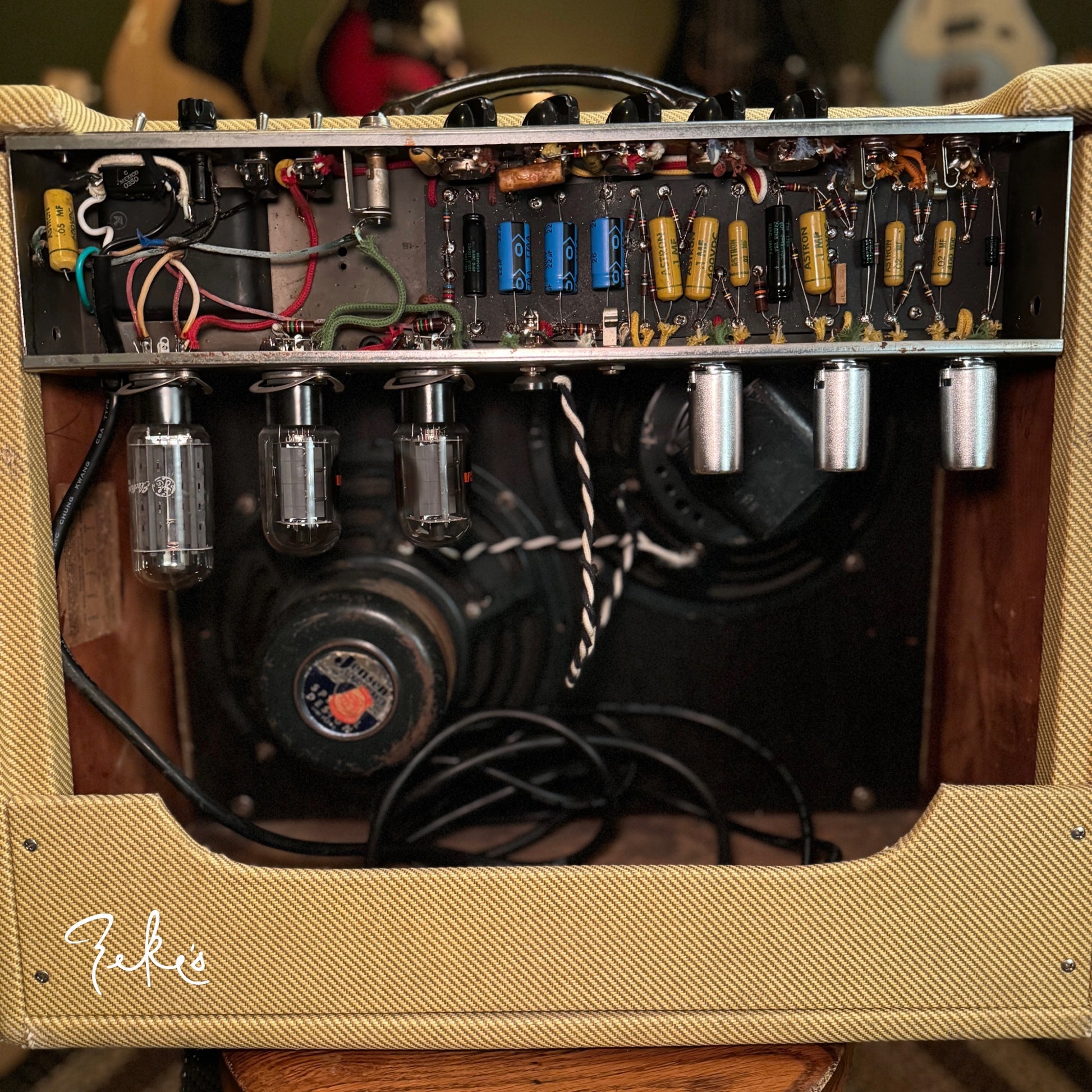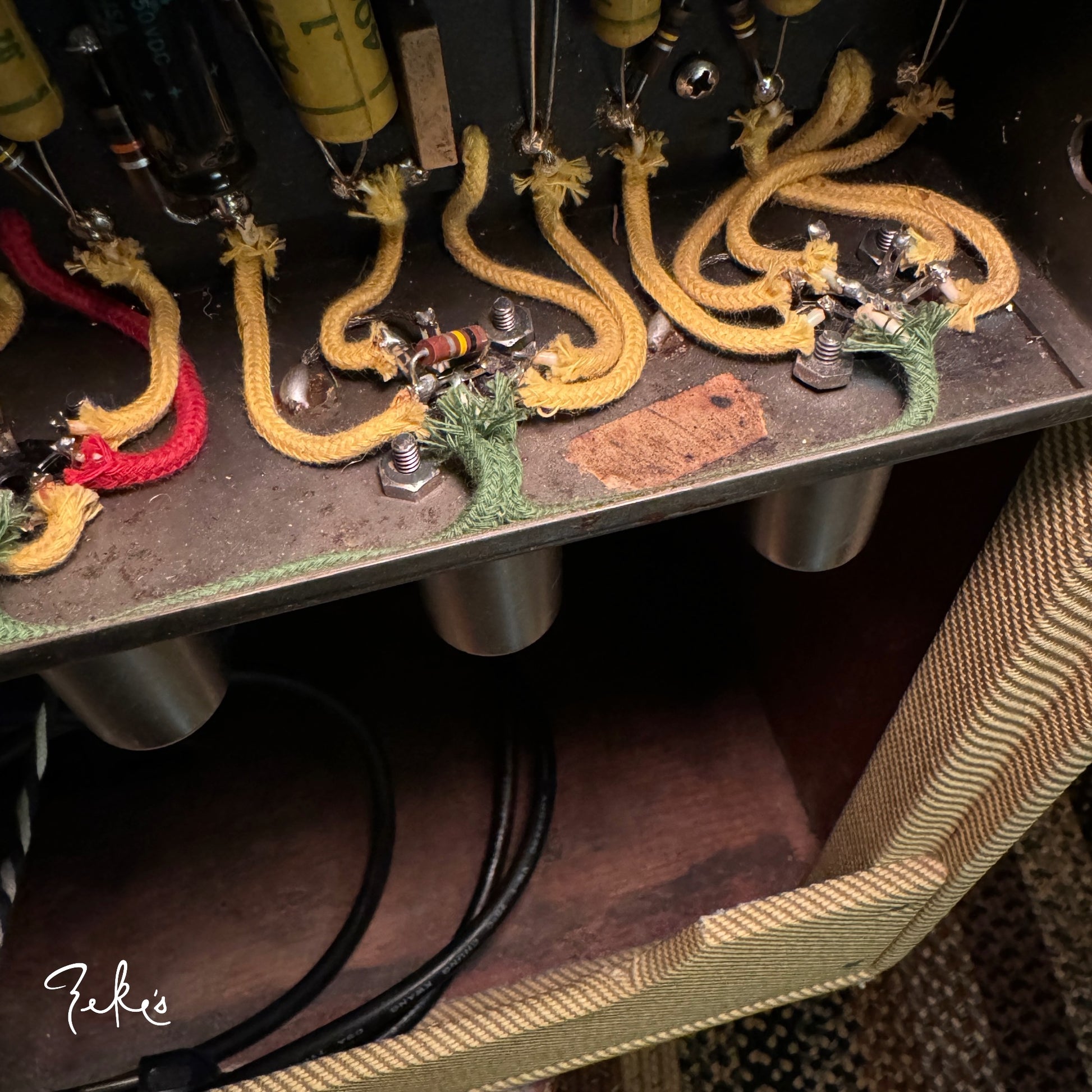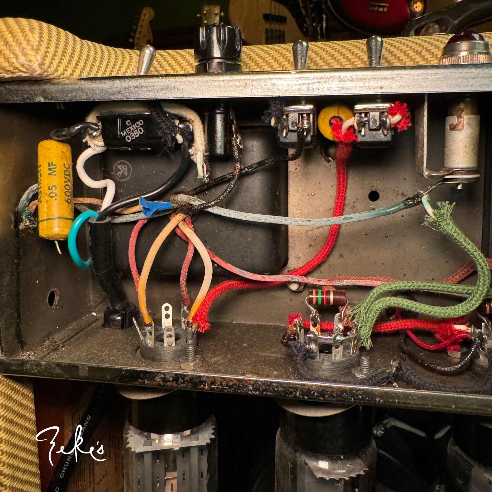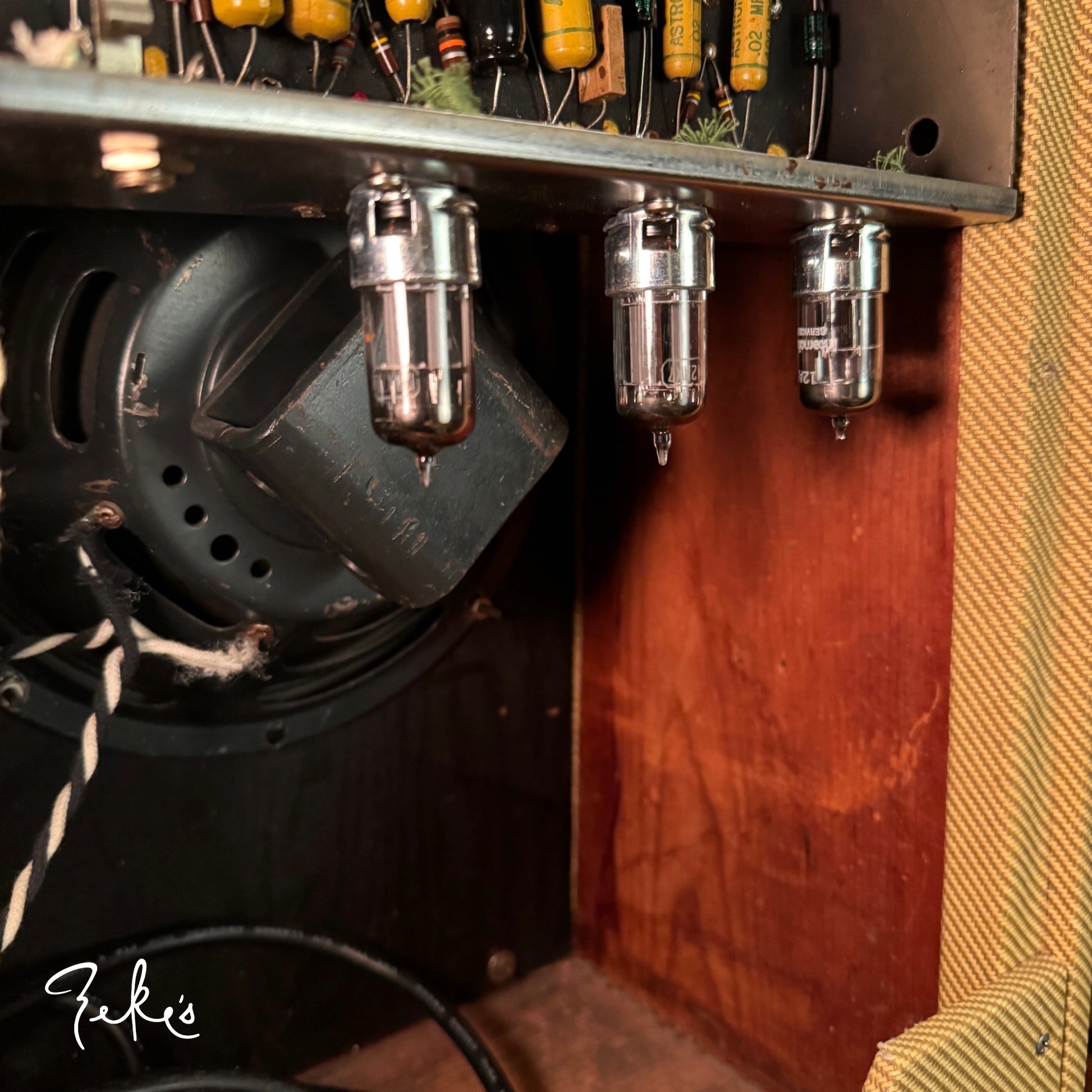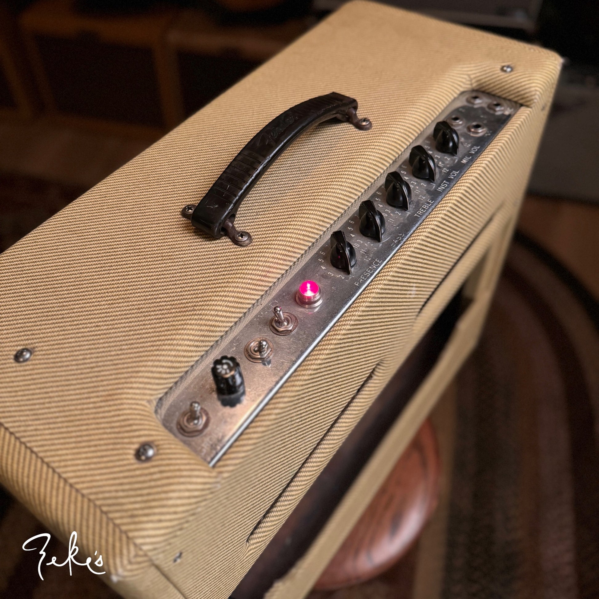Zeke’s Guitars & Mercantile is happy to have this great-sounding Tweed Super. The tweed has been professionally replaced. Basic maintenance and some caps, tube sockets, etc have been replaced as typically needed. It has vintage tubes which still function and sound great. Another great example of late 50s tweed tone.