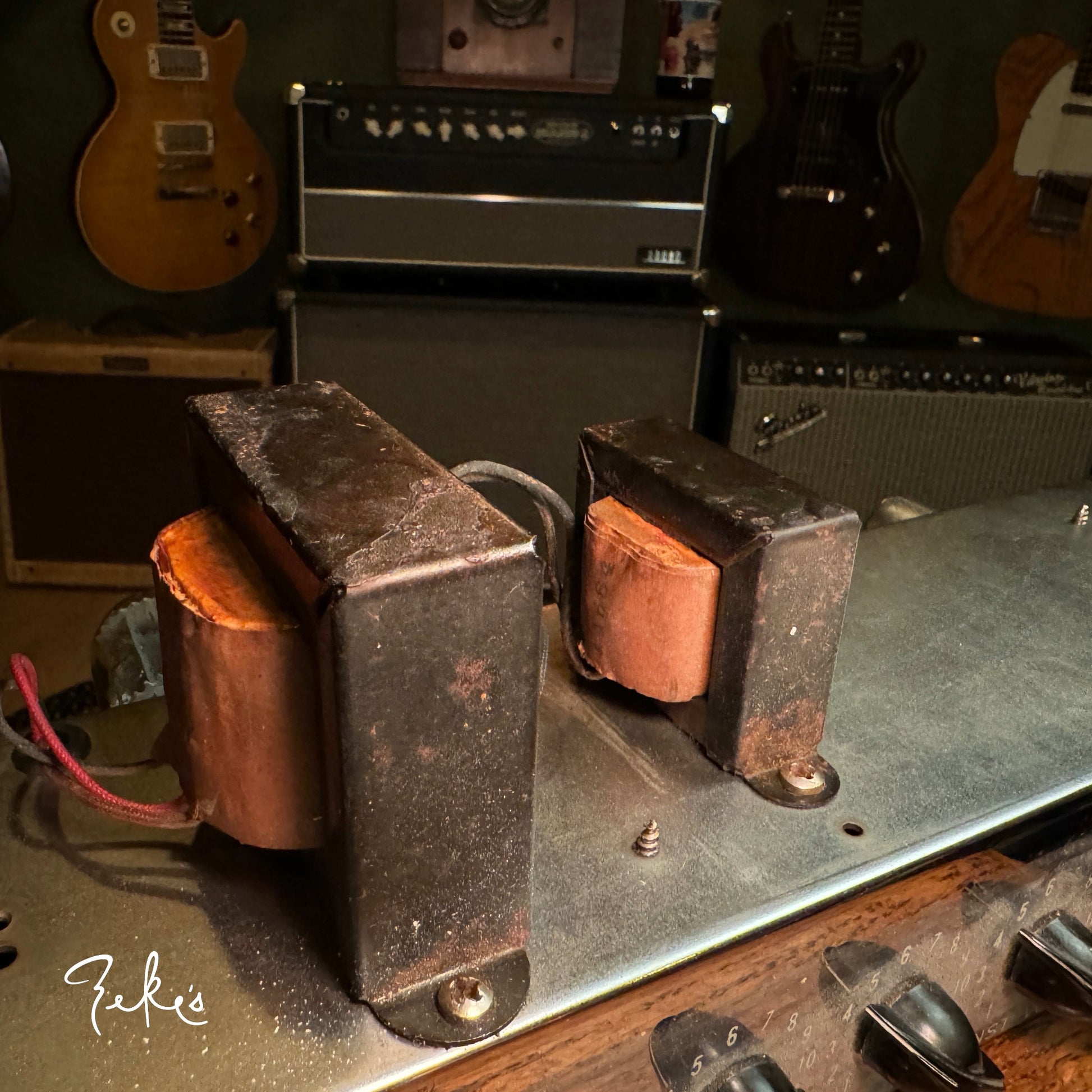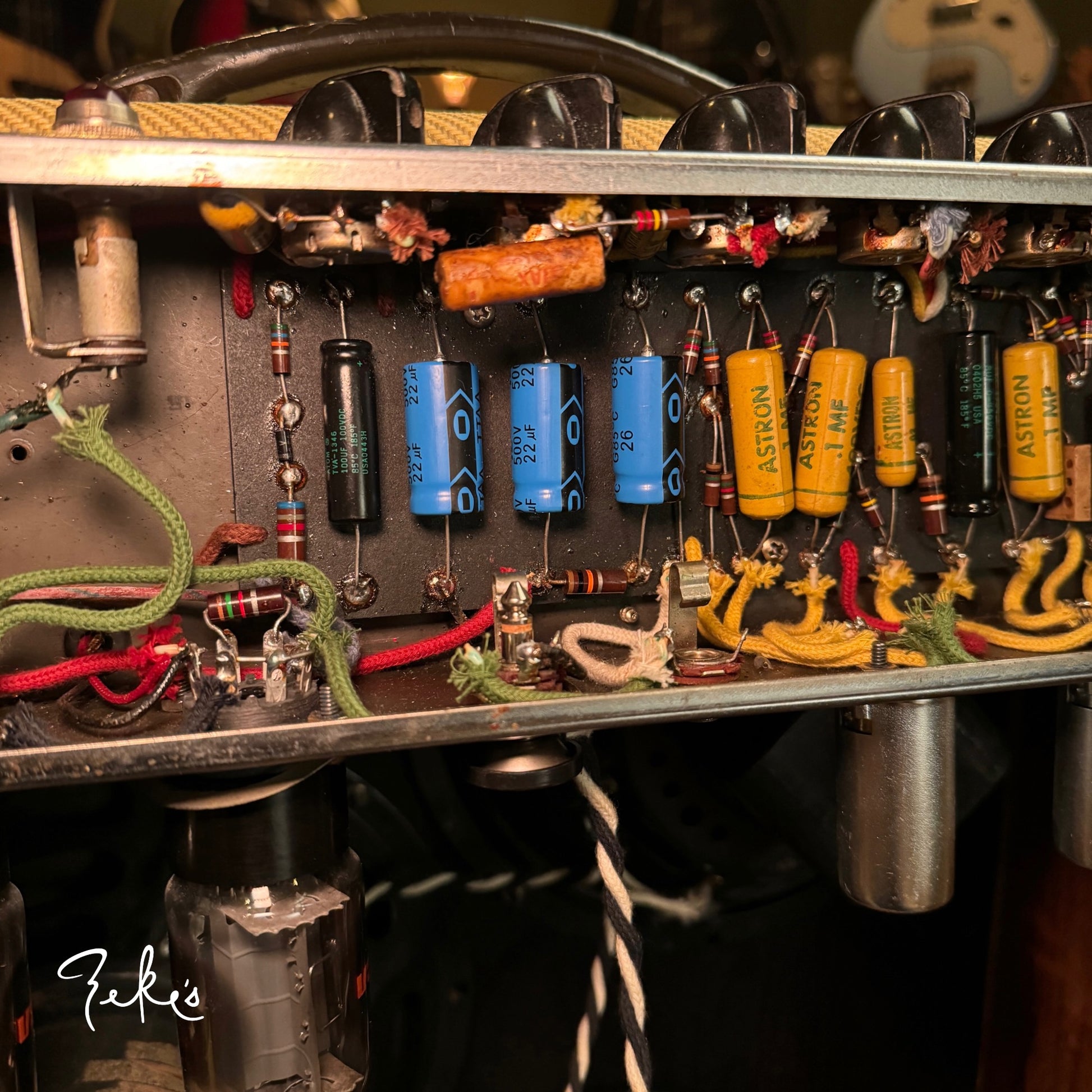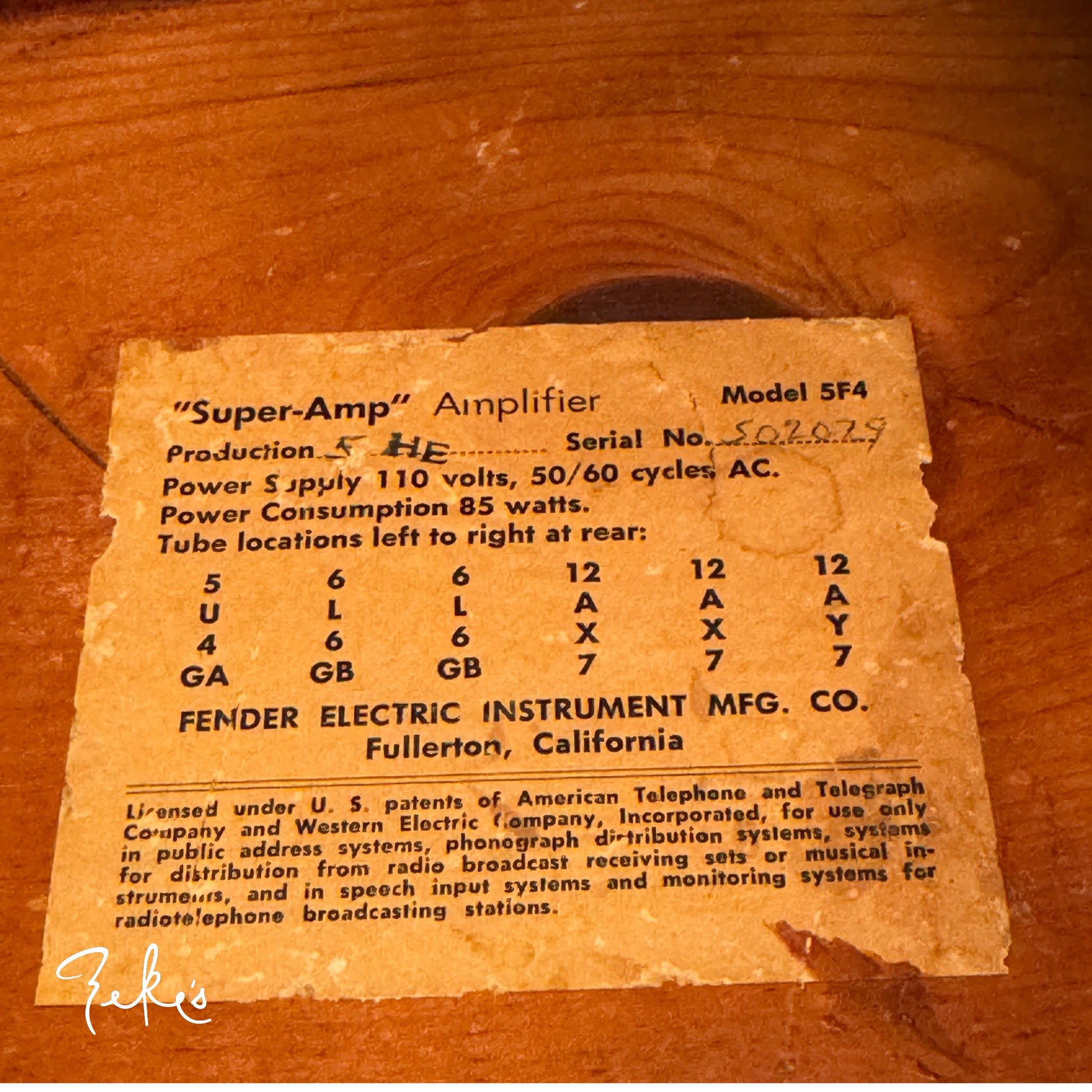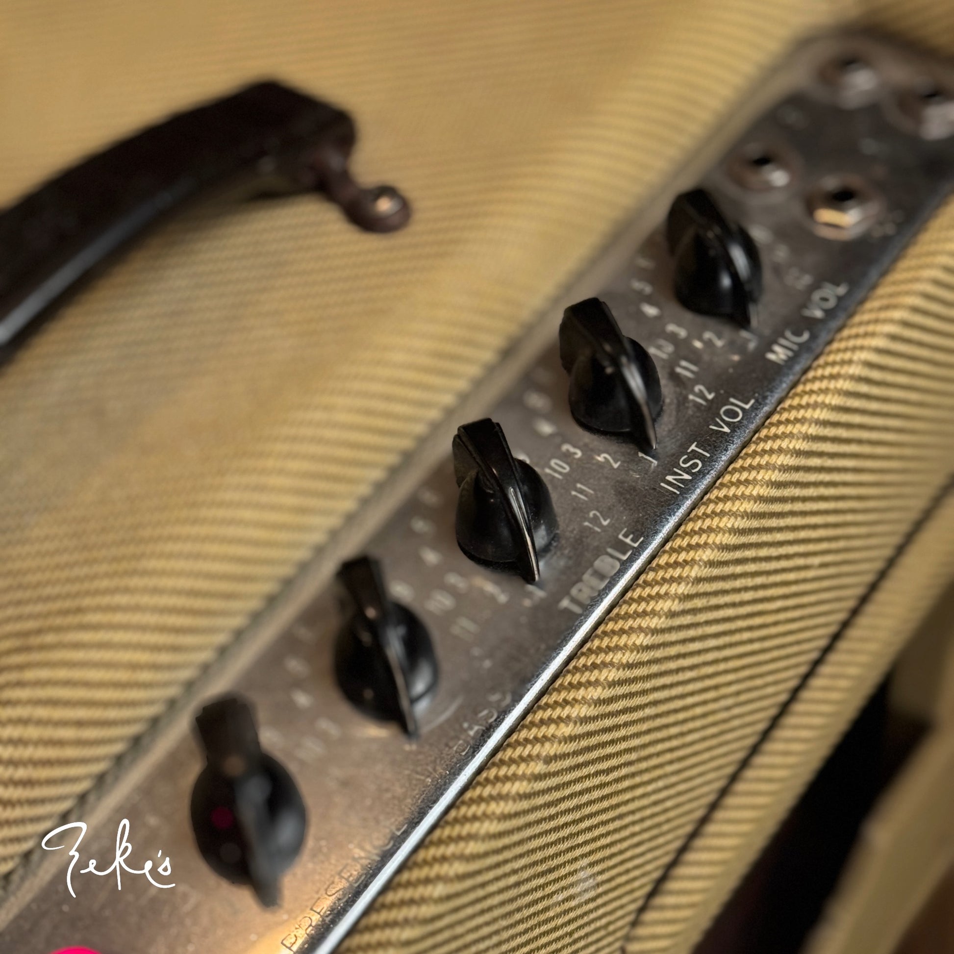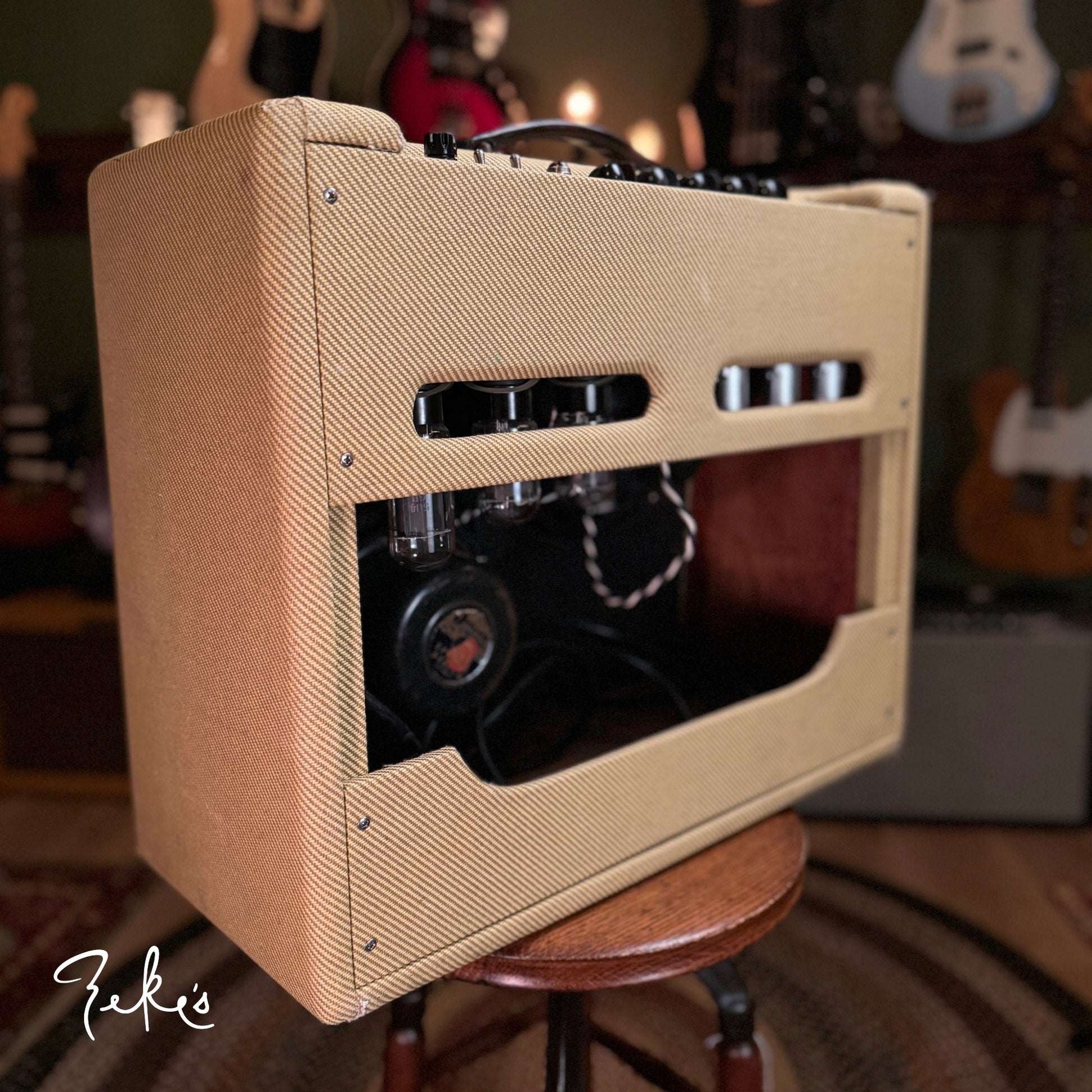 Zeke’s Guitars & Mercantile is happy to have this great-sounding Tweed Super. The tweed has been professionally replaced. Basic maintenance and some caps, tube sockets, etc have been replaced as typically needed. It has vintage tubes which still function and sound great. Another great example of late 50s tweed tone.