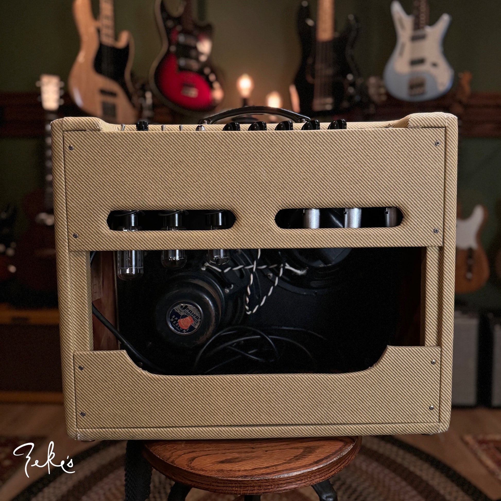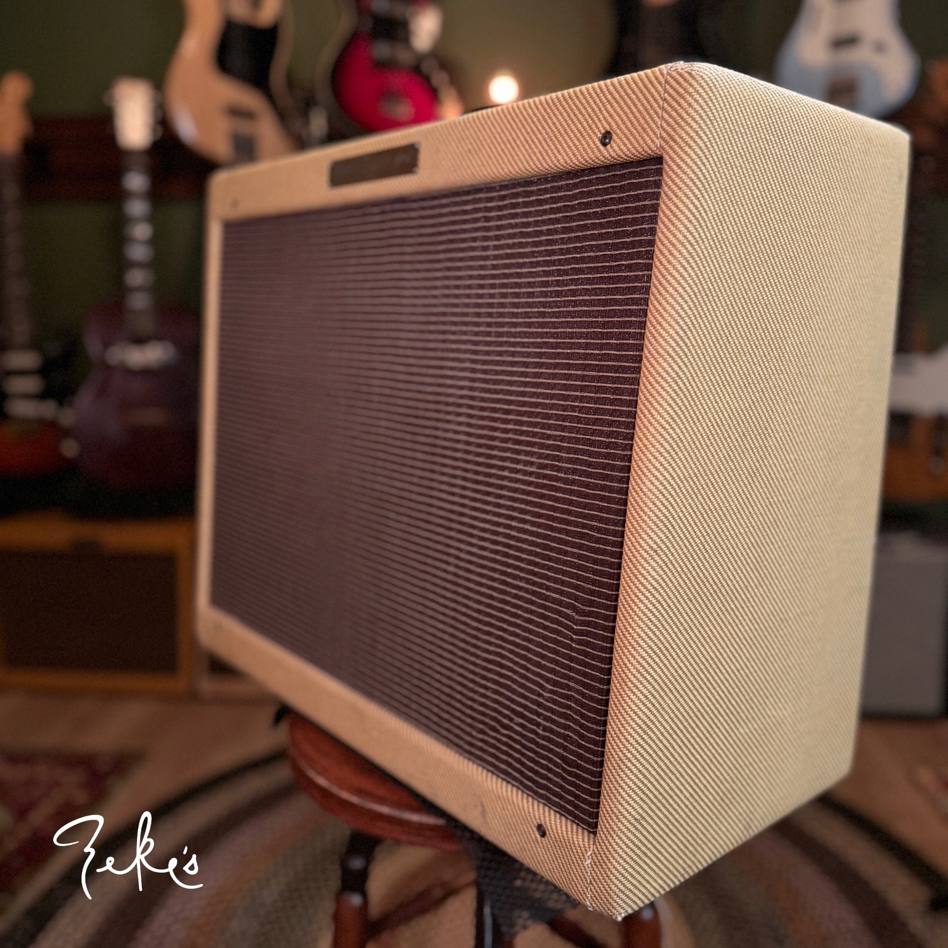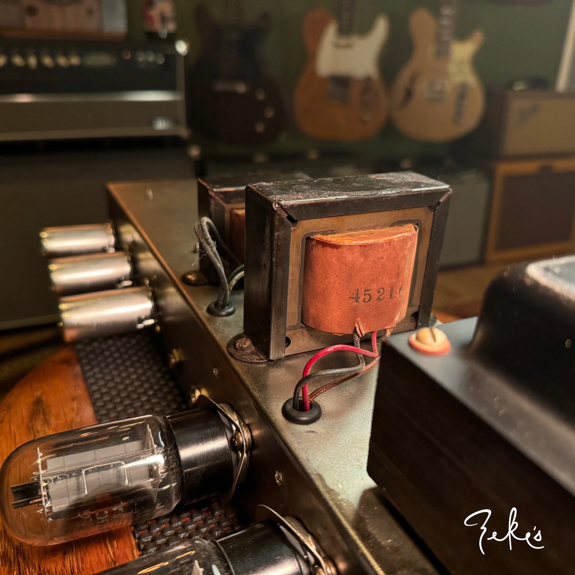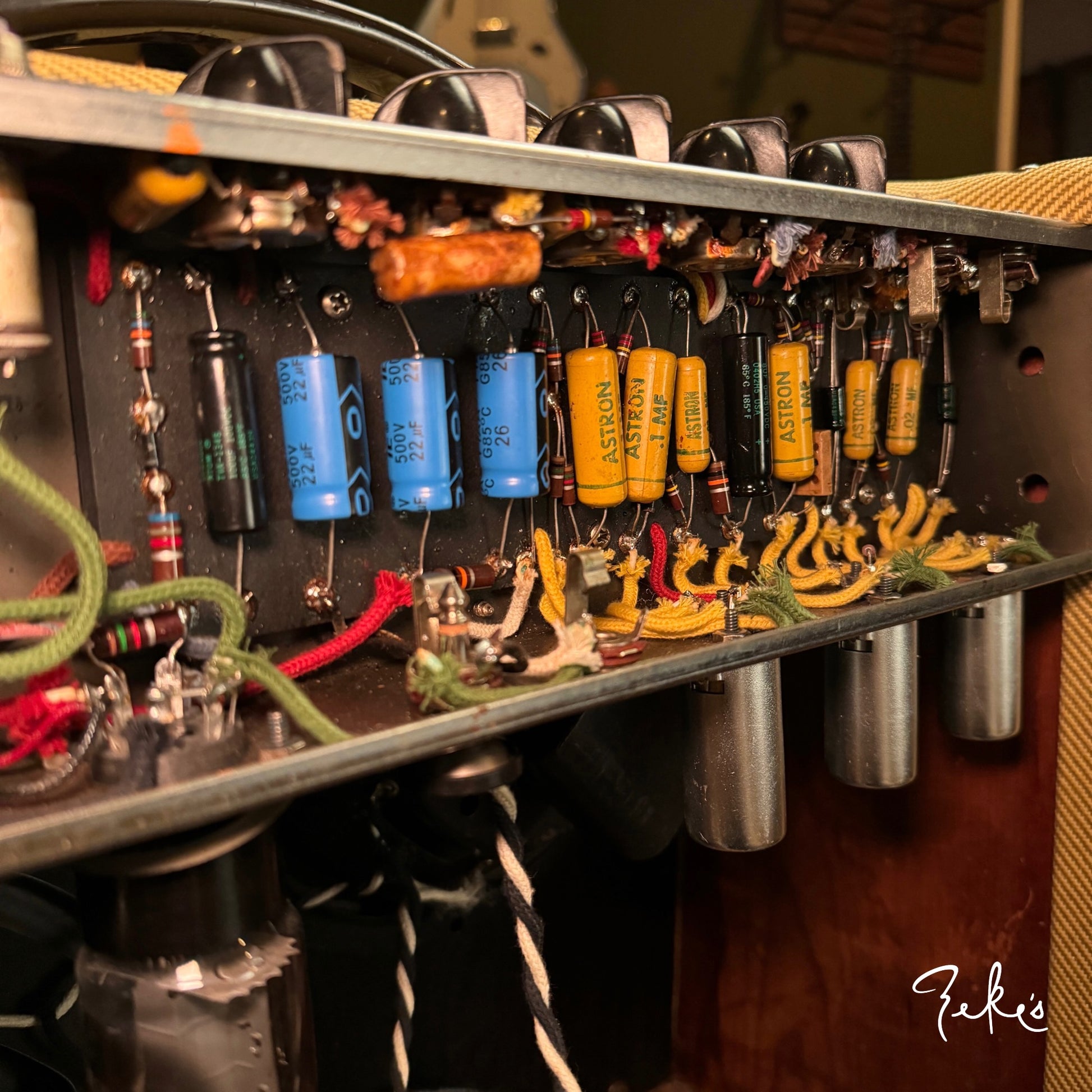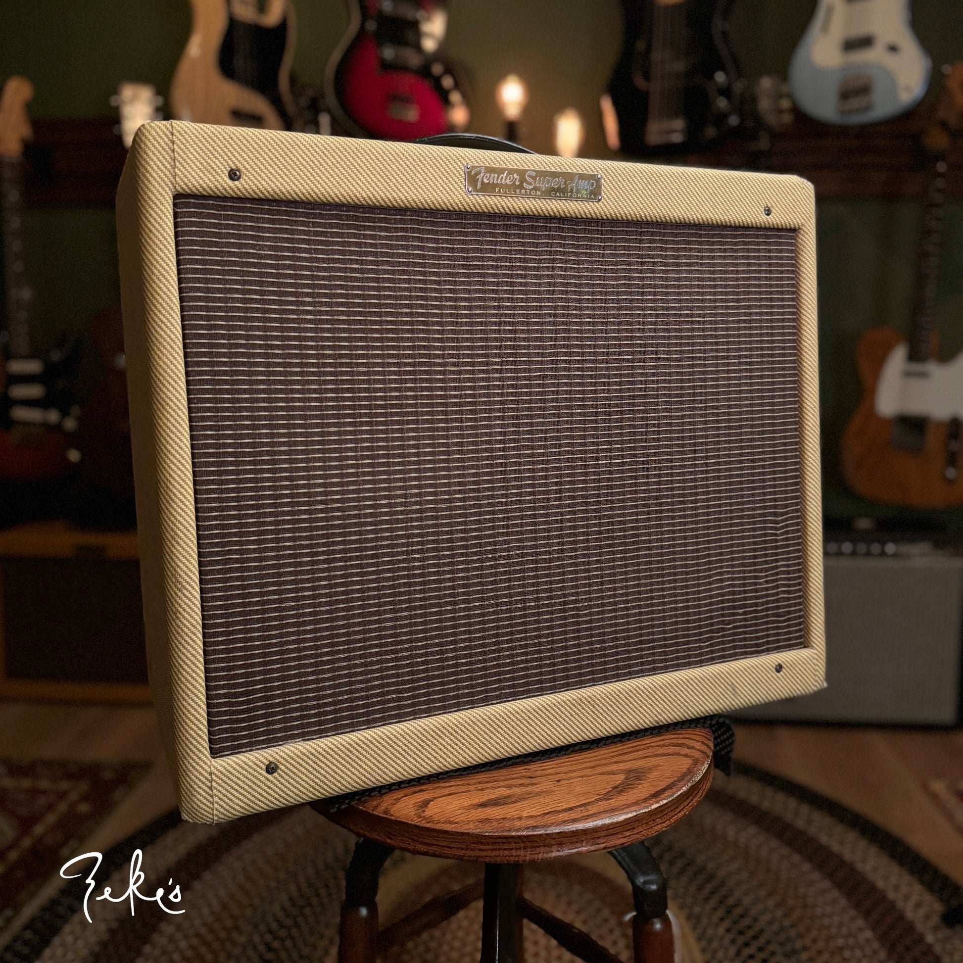 Zeke’s Guitars & Mercantile is happy to have this great-sounding Tweed Super. The tweed has been professionally replaced. Basic maintenance and some caps, tube sockets, etc have been replaced as typically needed. It has vintage tubes which still function and sound great. Another great example of late 50s tweed tone.