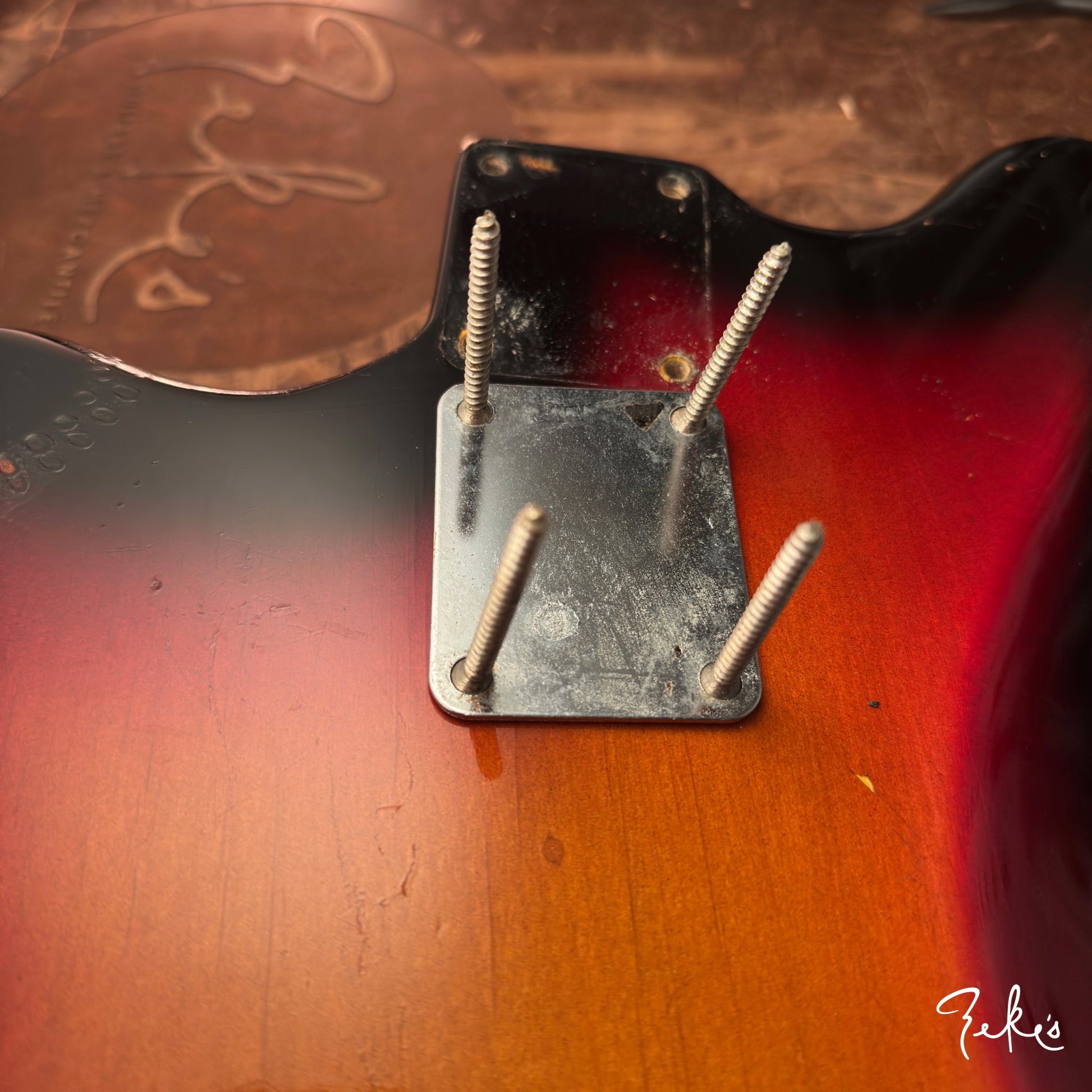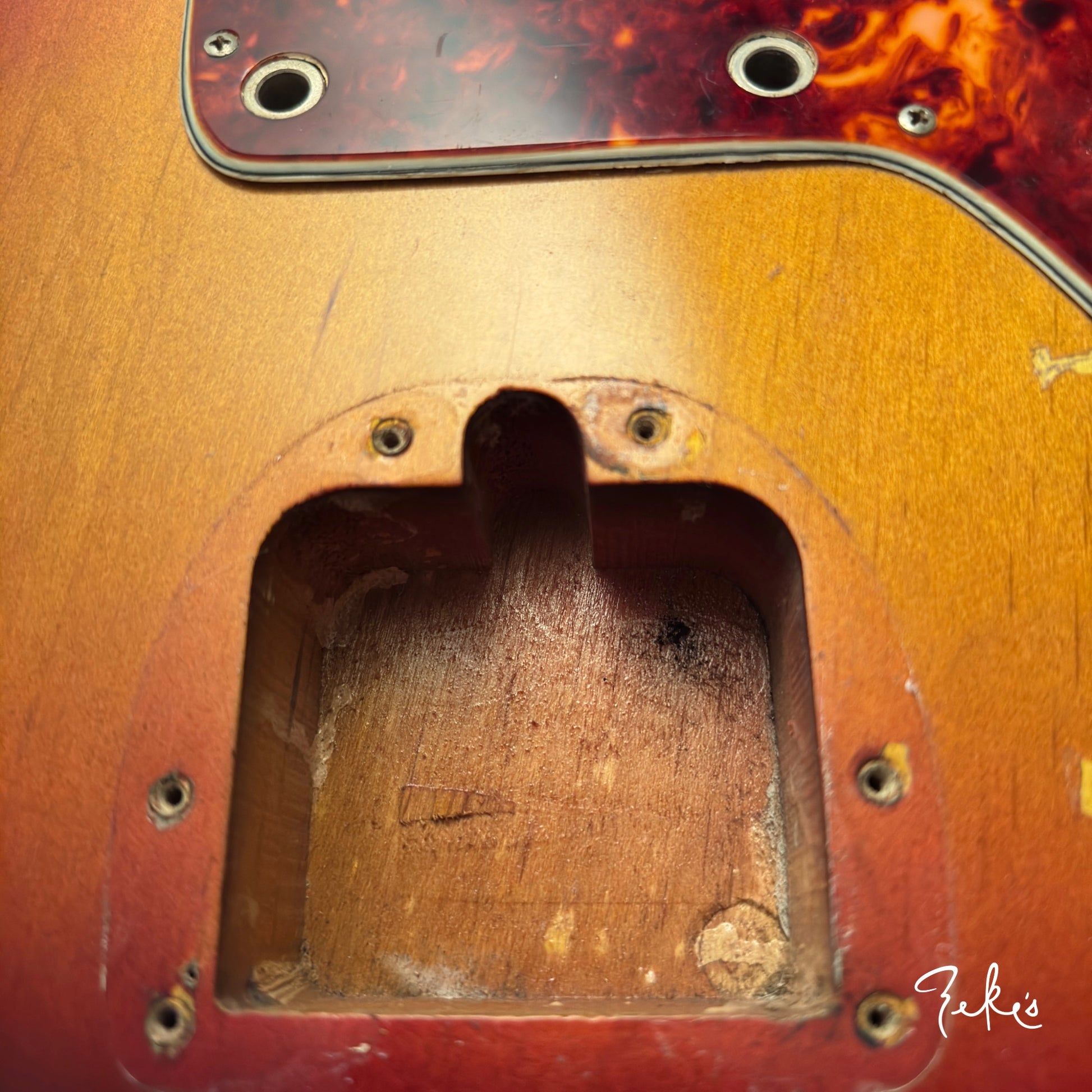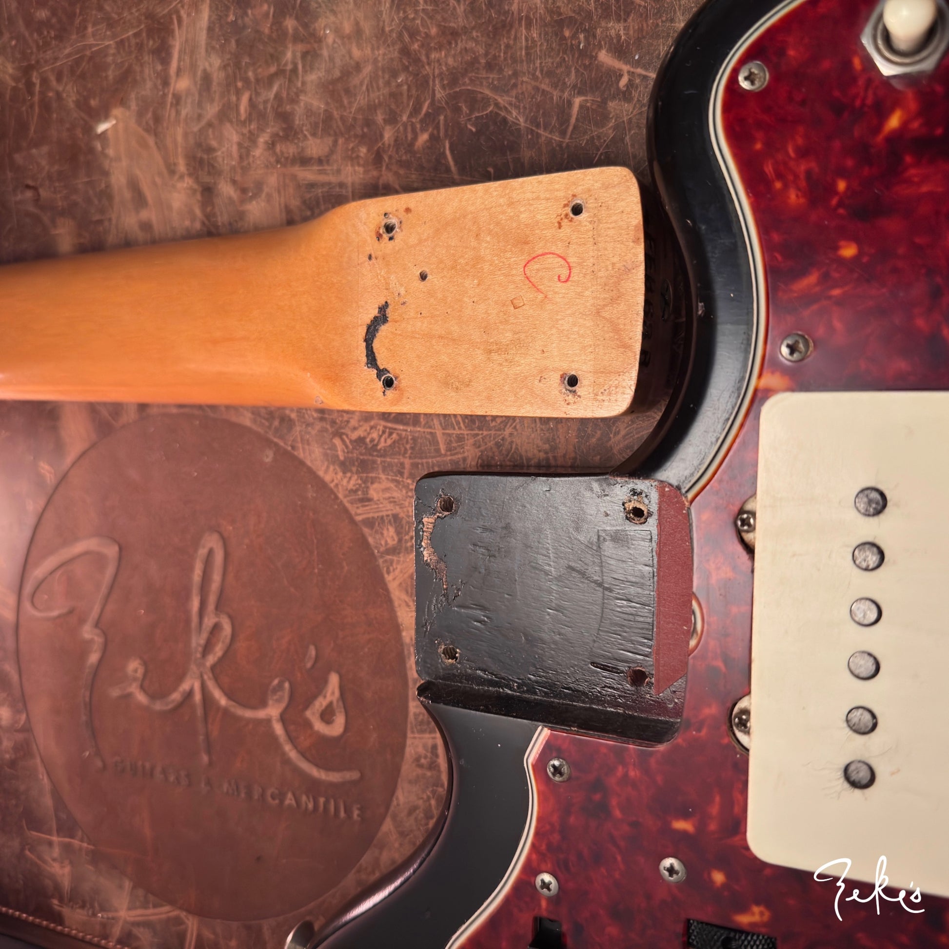 Obviously there is real honest wear on the body. There is even the common coiley cable scar on the back of the upper cutaway from being left in the case. You can see the stain in the case as well. Remember kids, always wrap your cables up neatly.