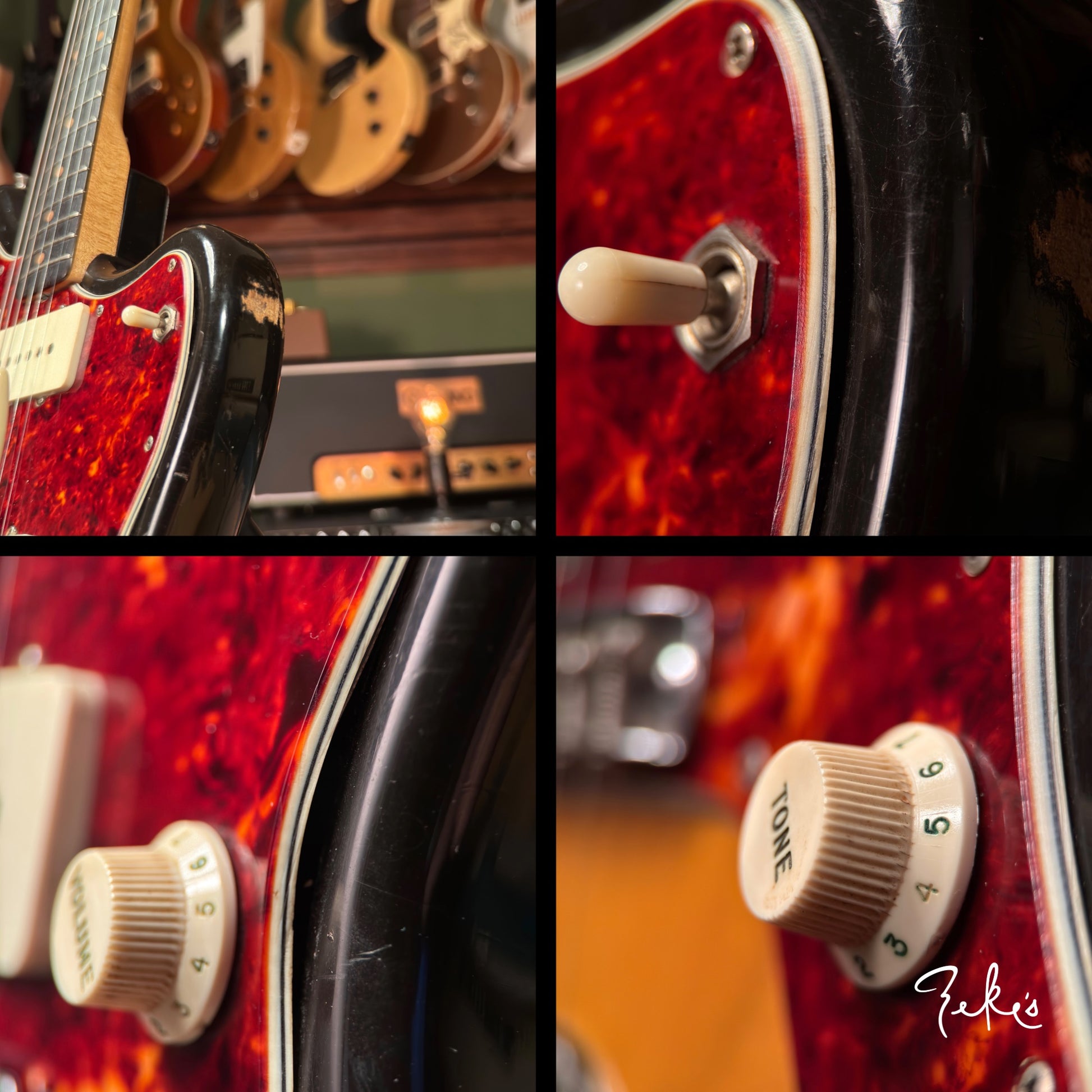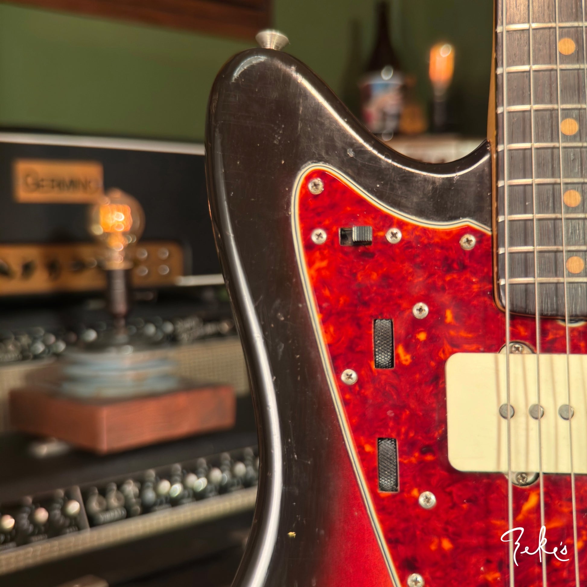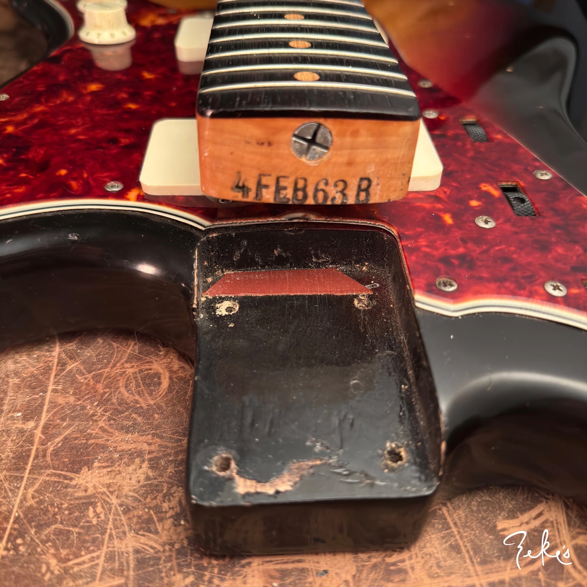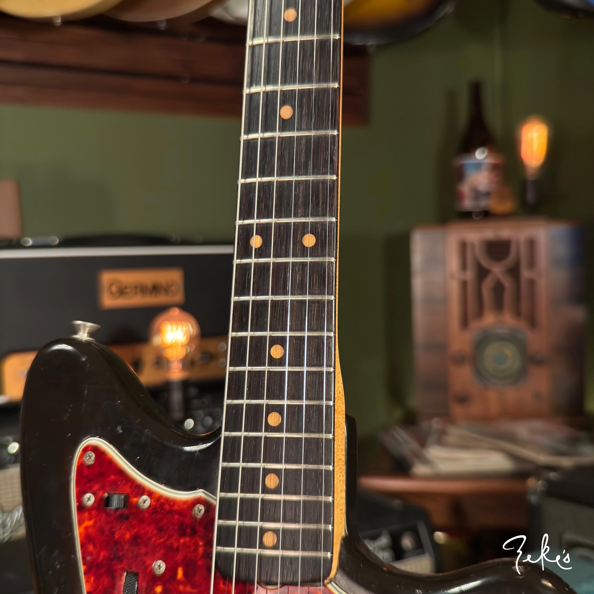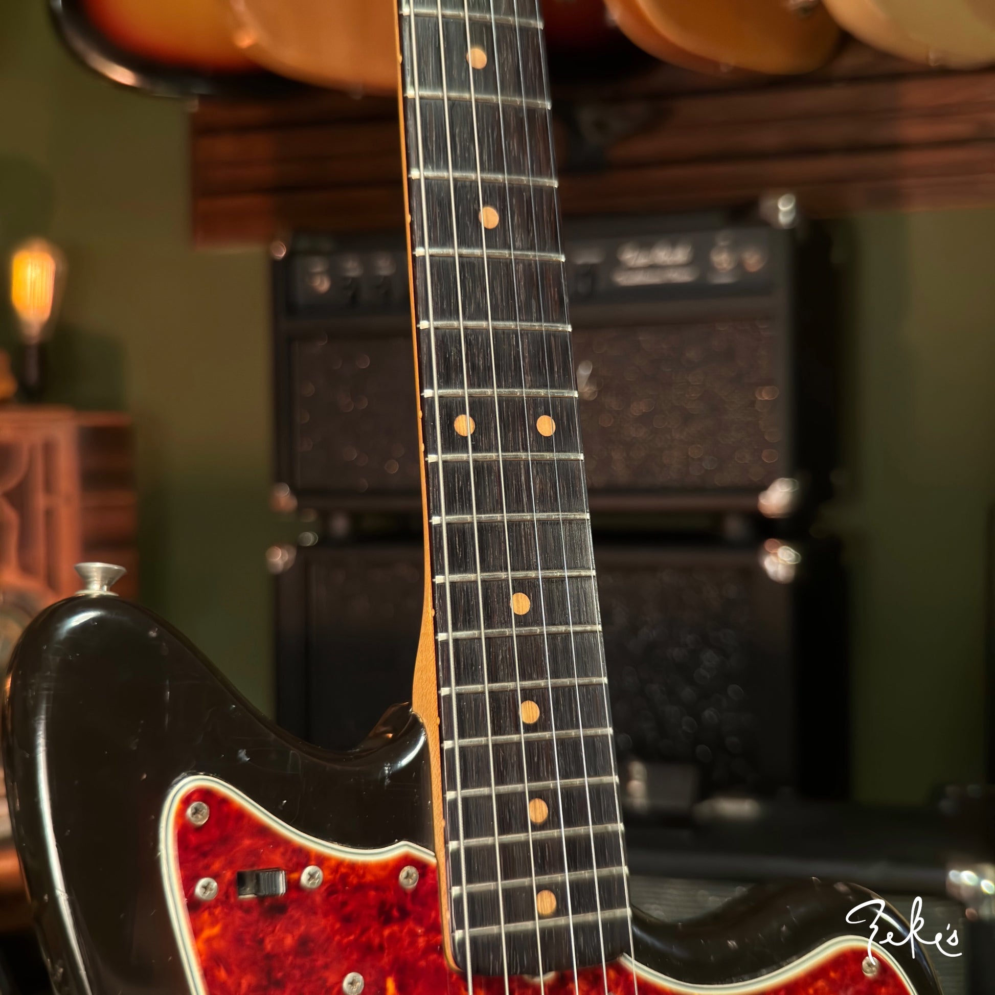 This extremely vibey Fender Jazzmaster from 1963 is a treat to have in the shop. It is completely original and sounds so good. The pickups have a strong and clear sound and we love the 2nd position tones! We love the neck contour and starts from a typical slim early sixties to pretty chunky profile. The neck is in great shape and is set pretty straight with a slight relief. The Brazilian board and clay inlays are in great shape.