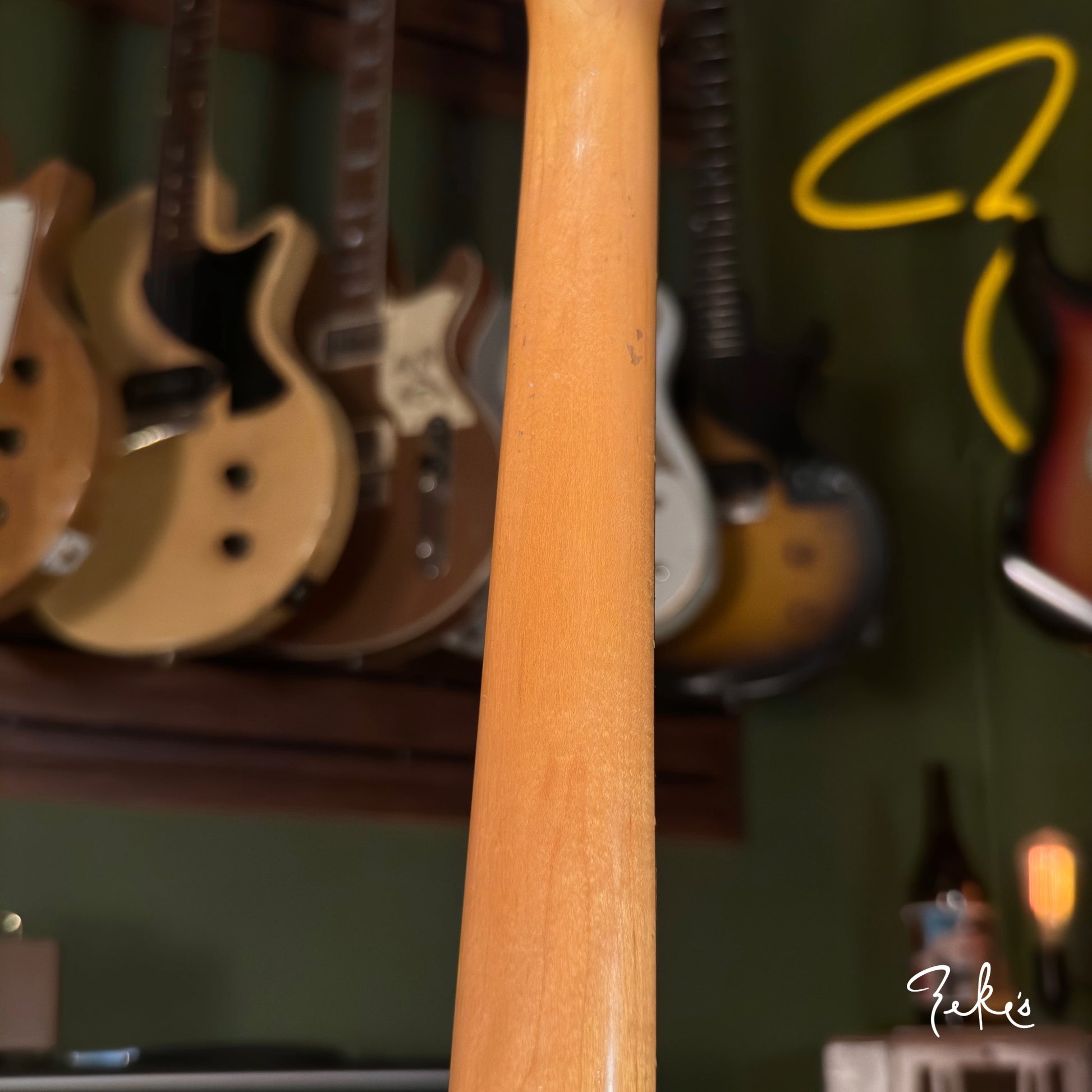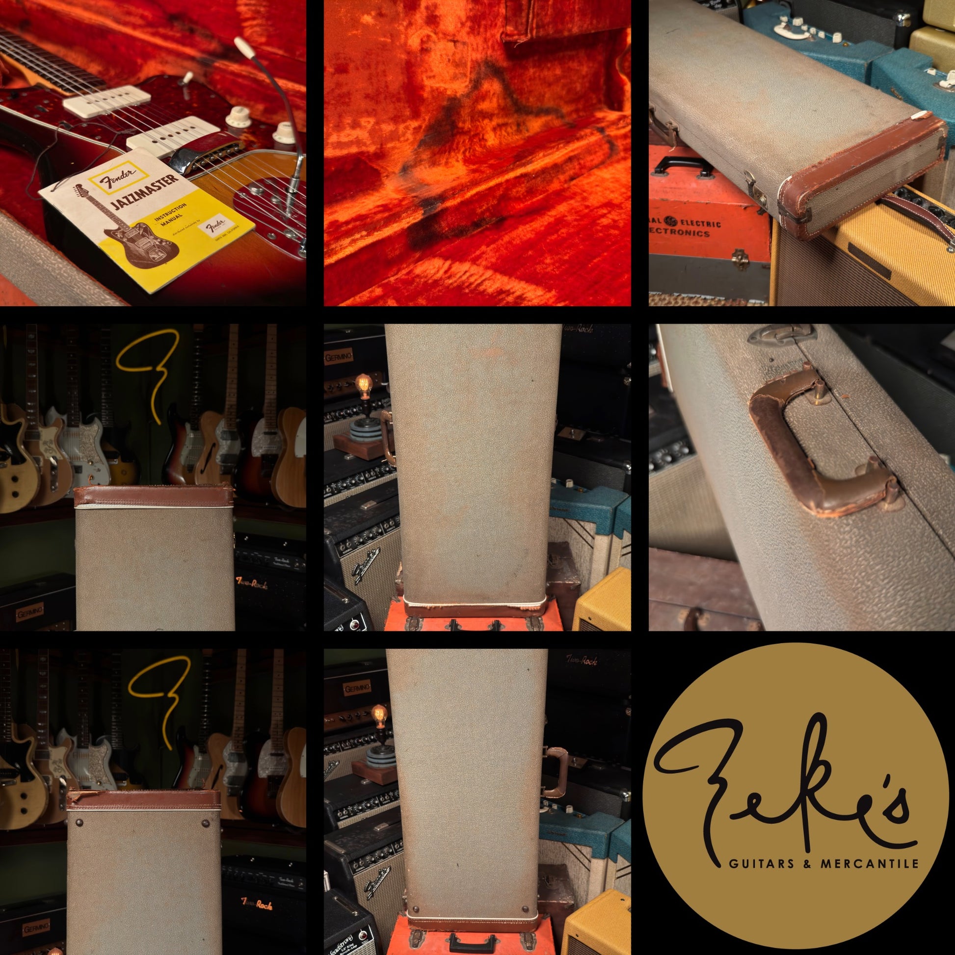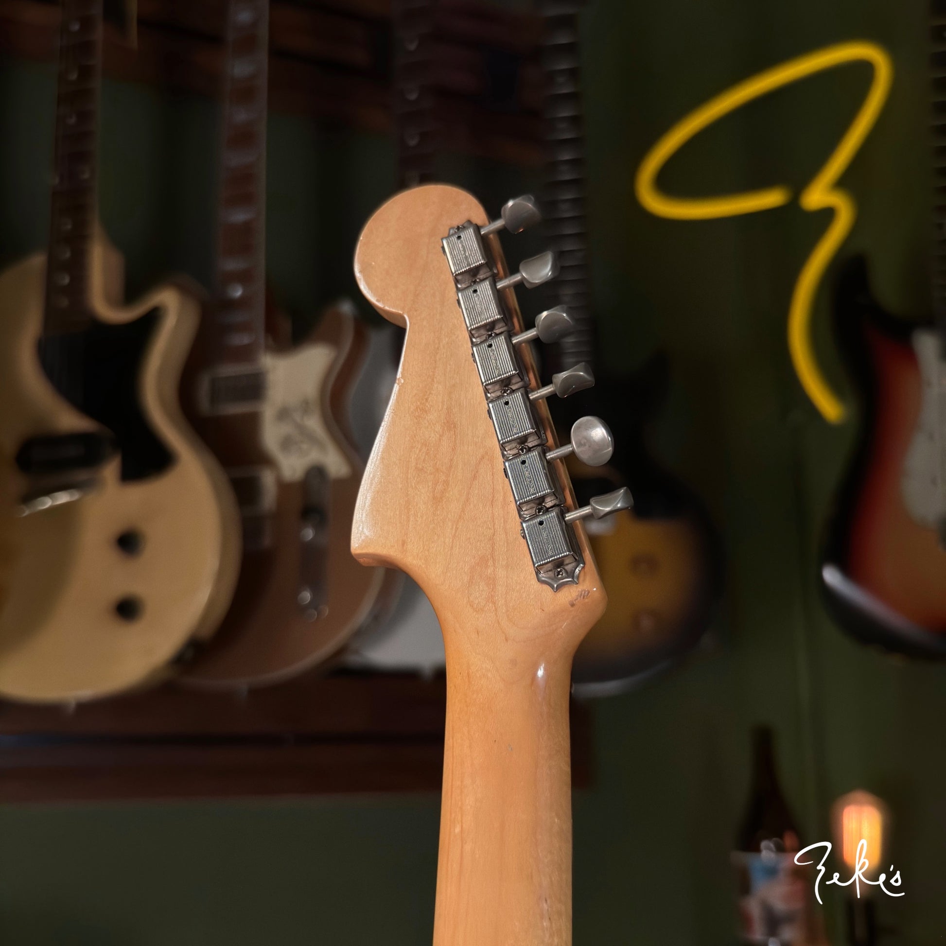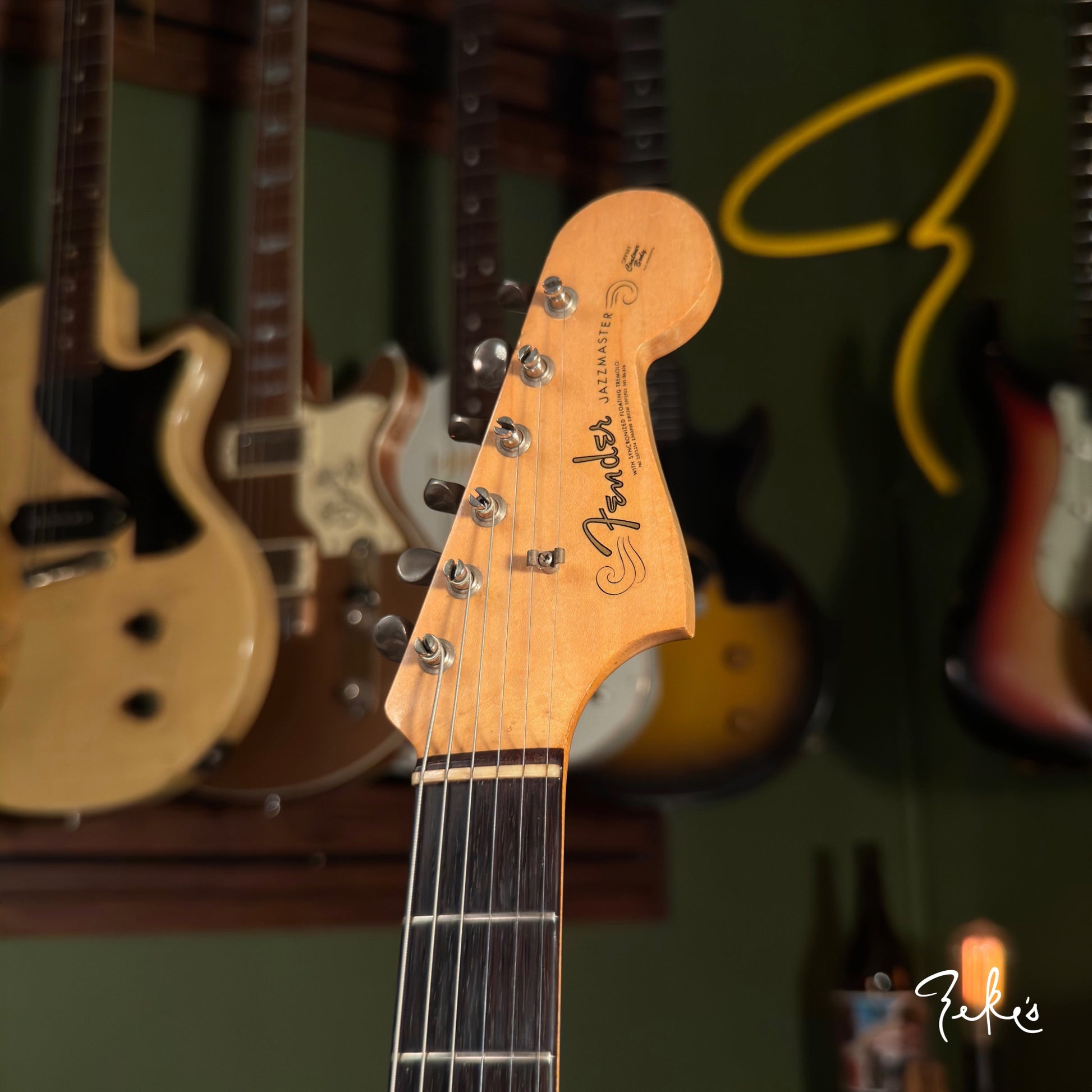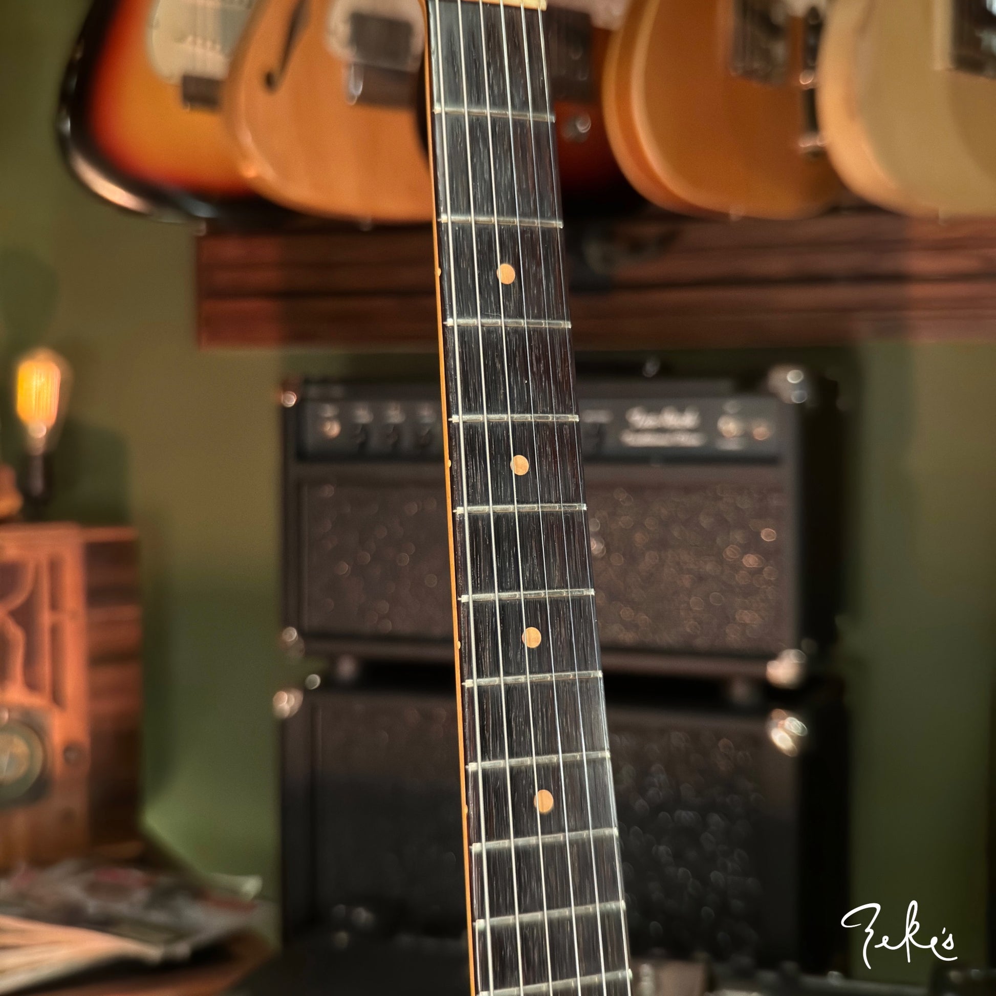 This extremely vibey Fender Jazzmaster from 1963 is a treat to have in the shop. It is completely original and sounds so good. The pickups have a strong and clear sound and we love the 2nd position tones! We love the neck contour and starts from a typical slim early sixties to pretty chunky profile. The neck is in great shape and is set pretty straight with a slight relief. The Brazilian board and clay inlays are in great shape.