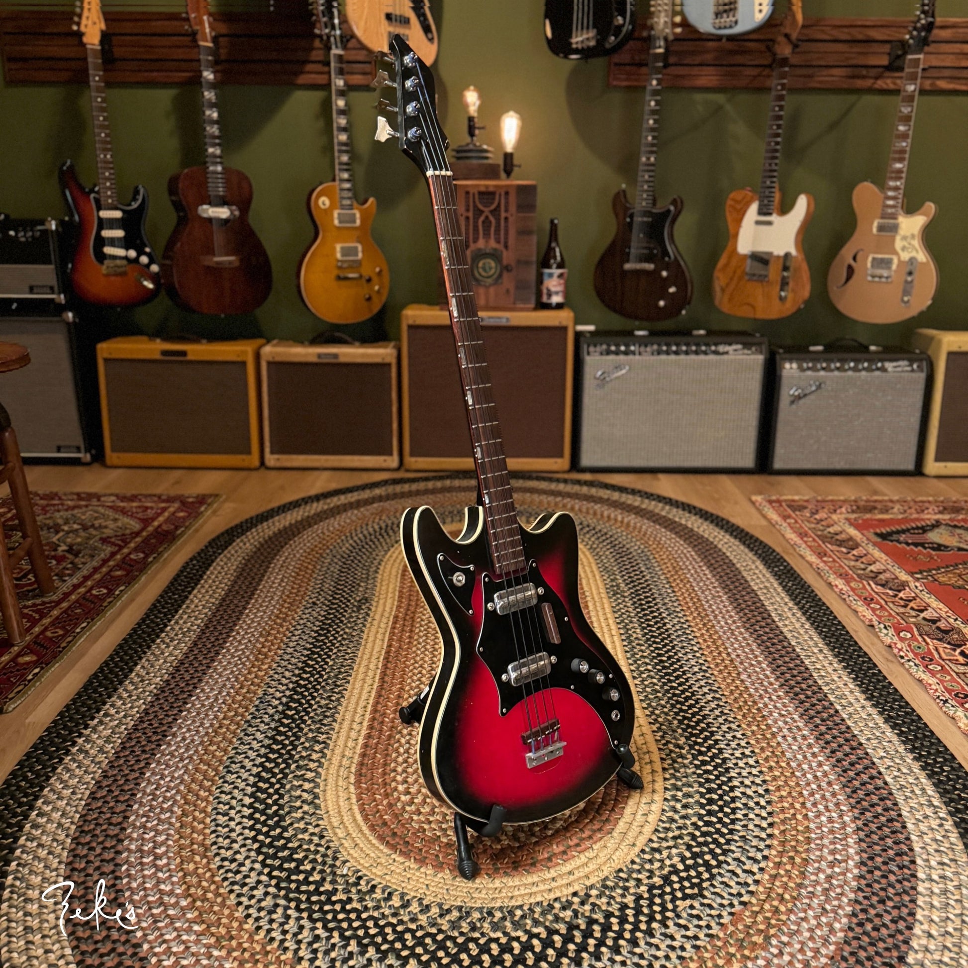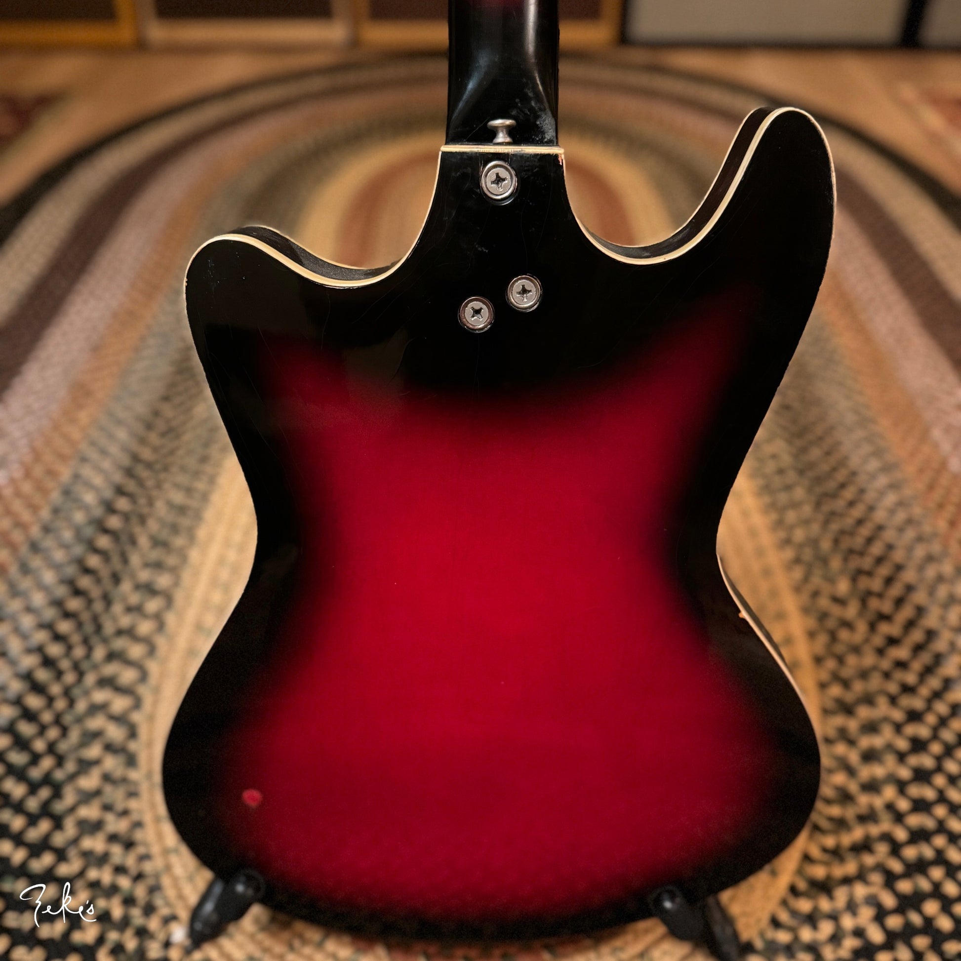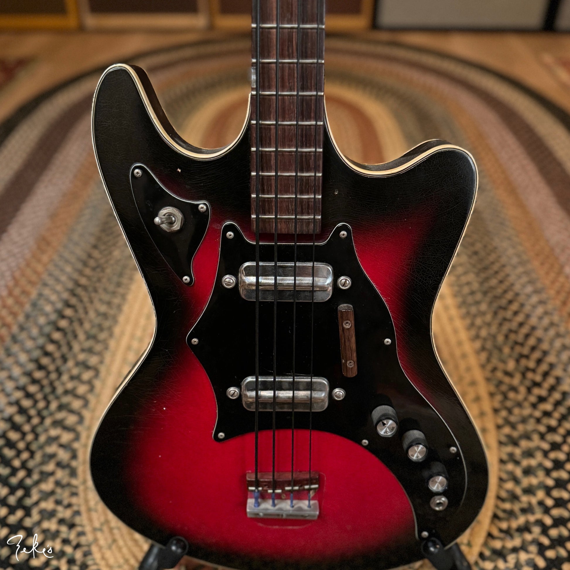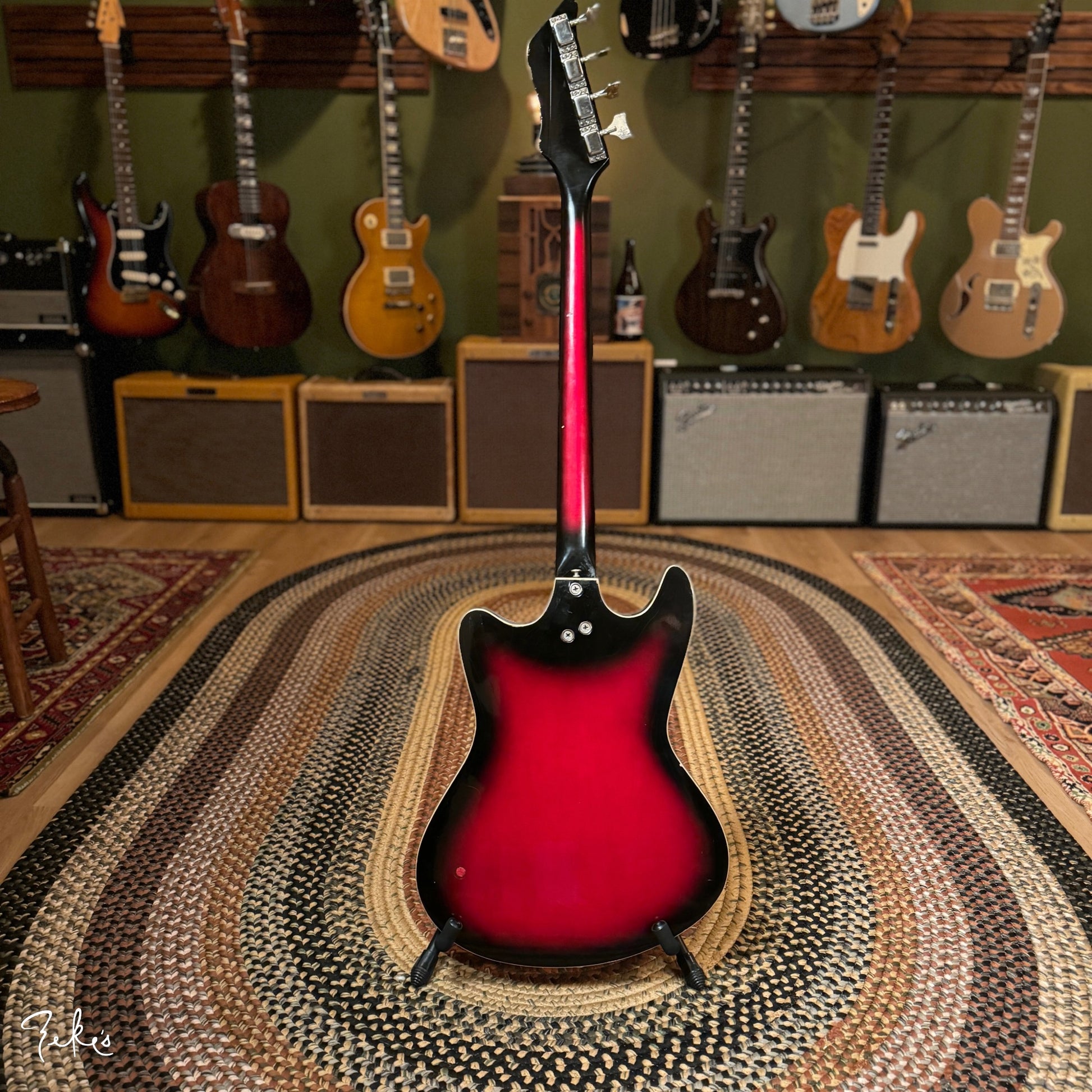 This is one funky little bass right here. “Would ya look at that. Just look at it!” This color sunburst is not very common with these basses. Manufactured by Kay and branded “True Tone” for Western Auto stores. Imagine going to buy auto parts and also coming home with one of these…yes please. Despite how cool these look, they often have their own set of playability and tuning issues…but not the one here at Zeke’s.