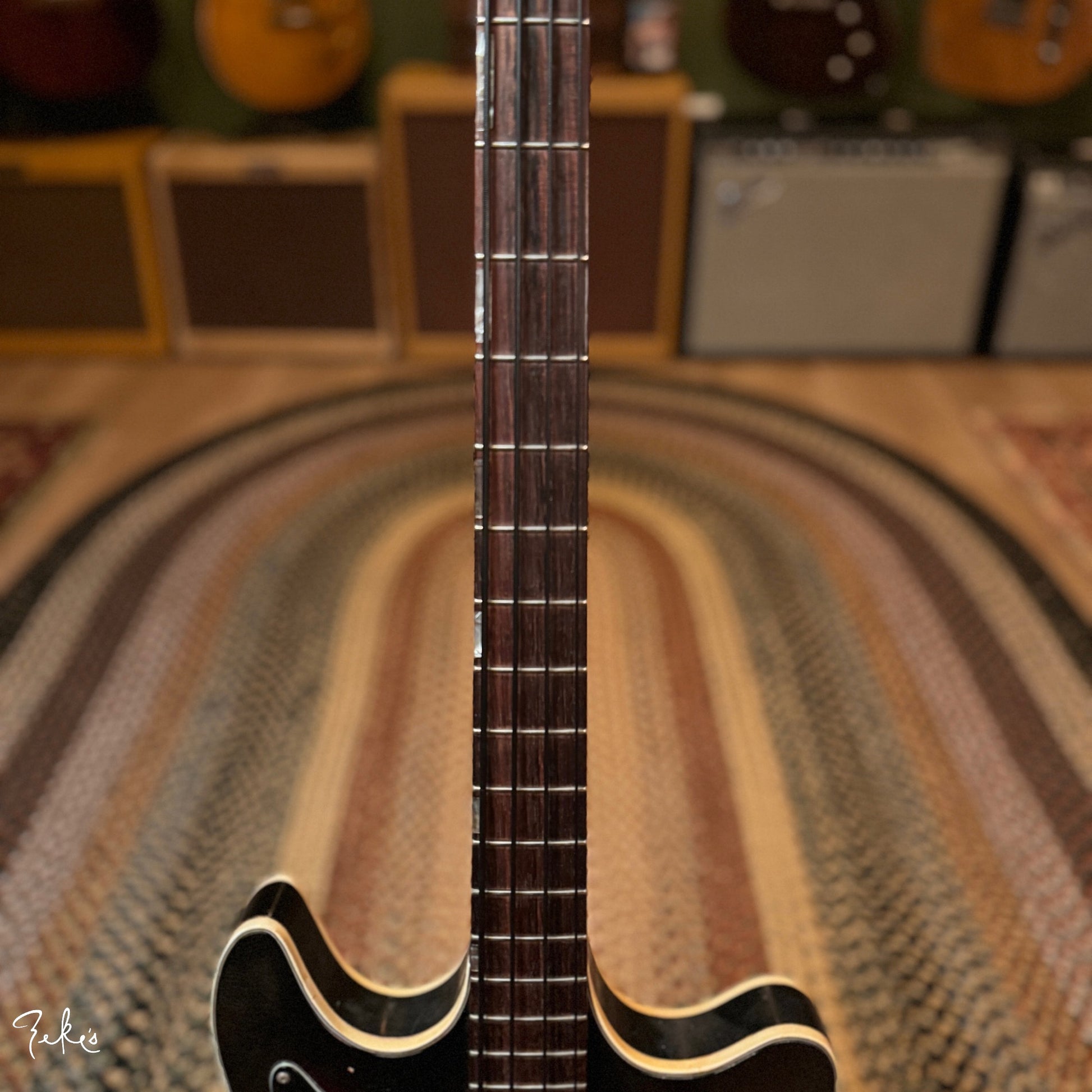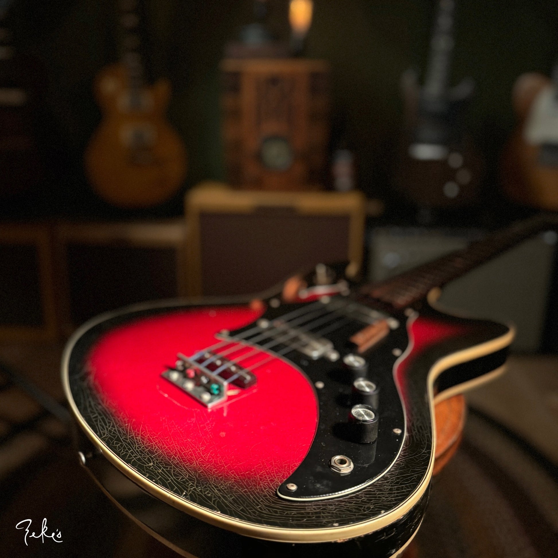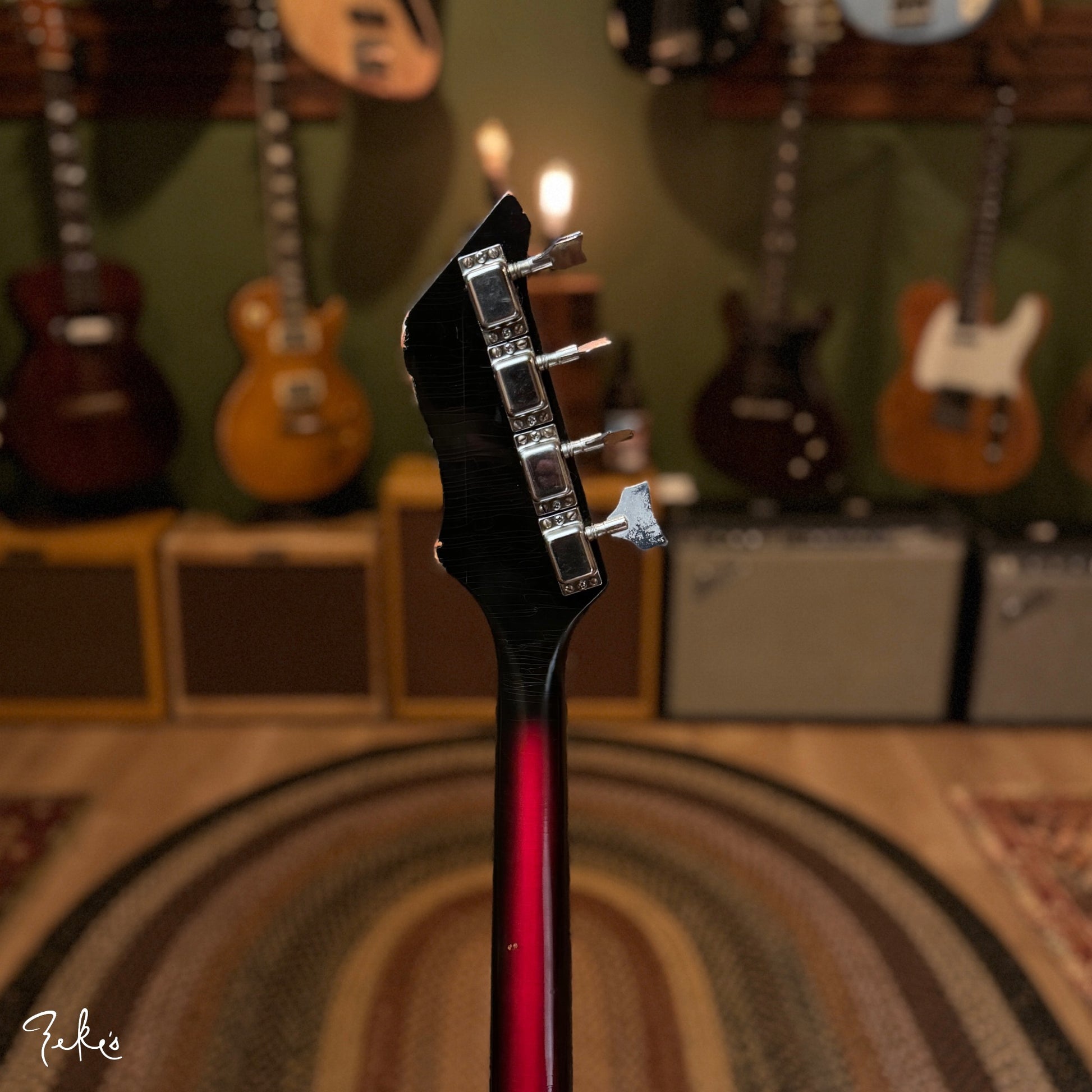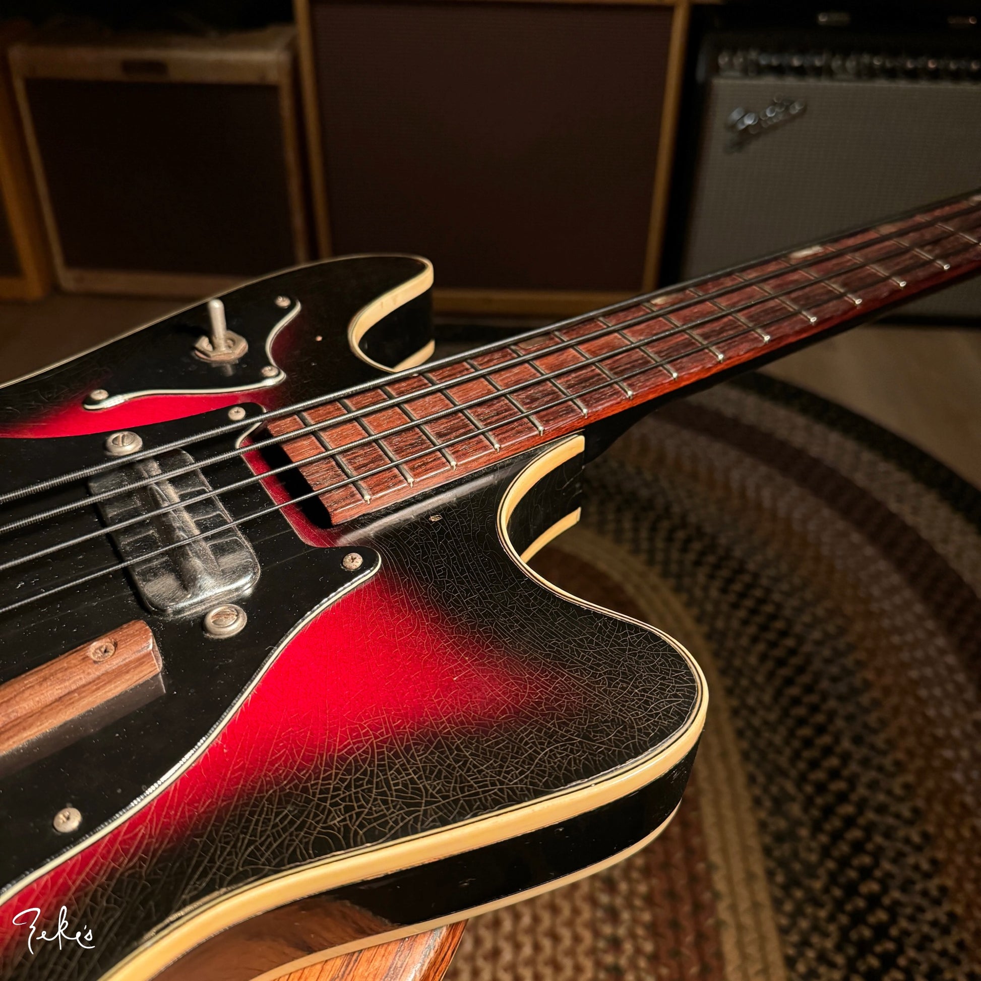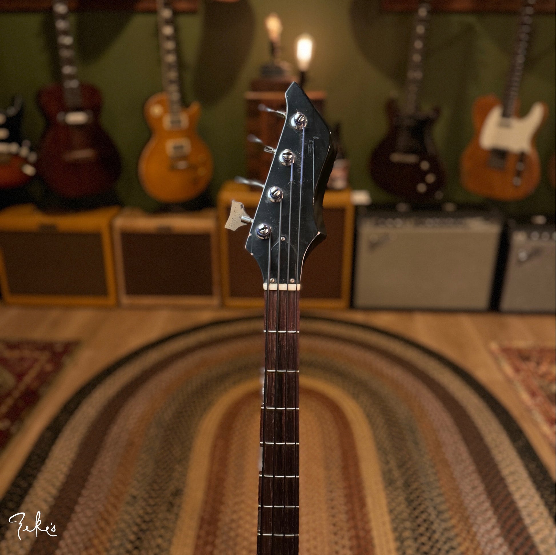This is one funky little bass right here. “Would ya look at that. Just look at it!” This color sunburst is not very common with these basses. Manufactured by Kay and branded “True Tone” for Western Auto stores. Imagine going to buy auto parts and also coming home with one of these…yes please. Despite how cool these look, they often have their own set of playability and tuning issues…but not the one here at Zeke’s.