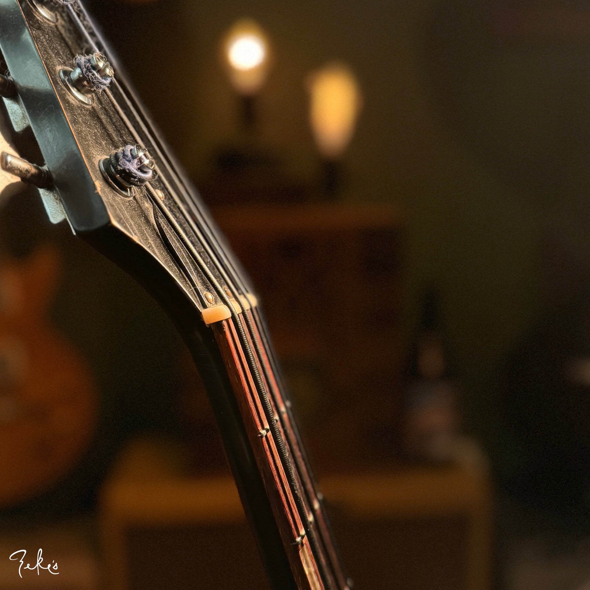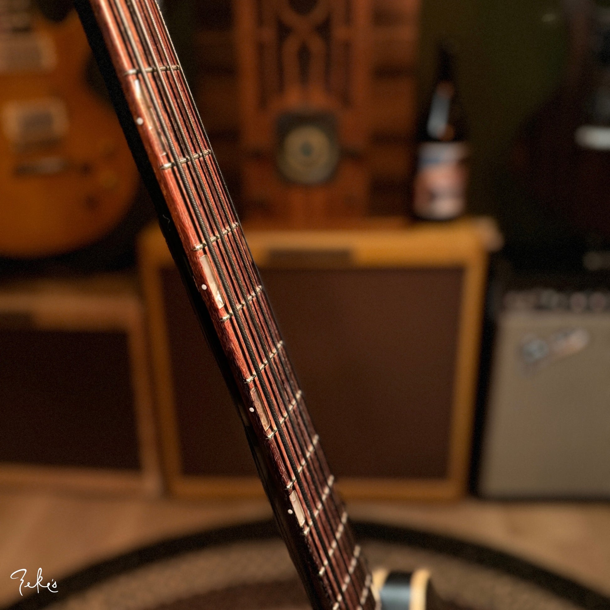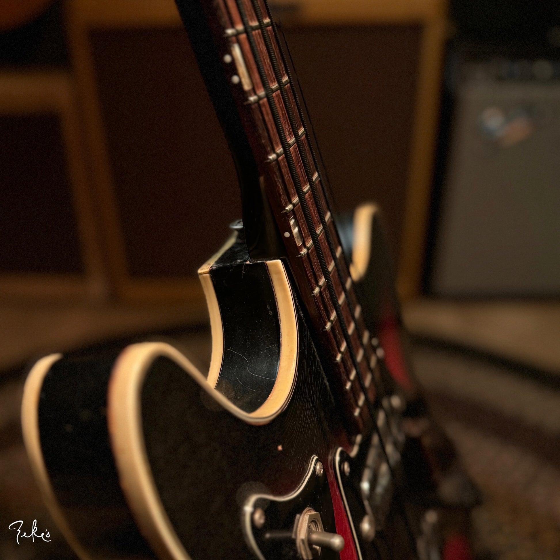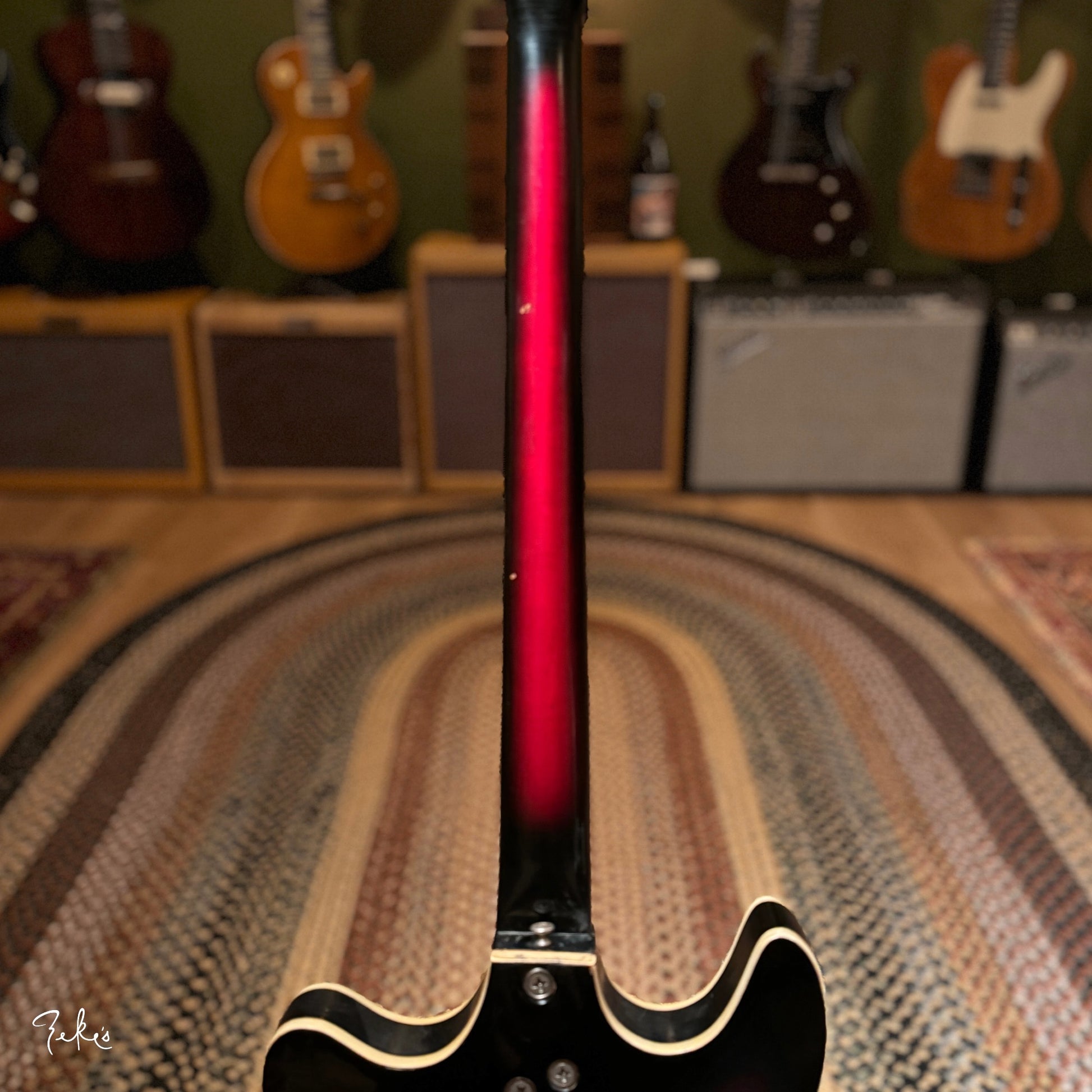 This is one funky little bass right here. “Would ya look at that. Just look at it!” This color sunburst is not very common with these basses. Manufactured by Kay and branded “True Tone” for Western Auto stores. Imagine going to buy auto parts and also coming home with one of these…yes please. Despite how cool these look, they often have their own set of playability and tuning issues…but not the one here at Zeke’s.