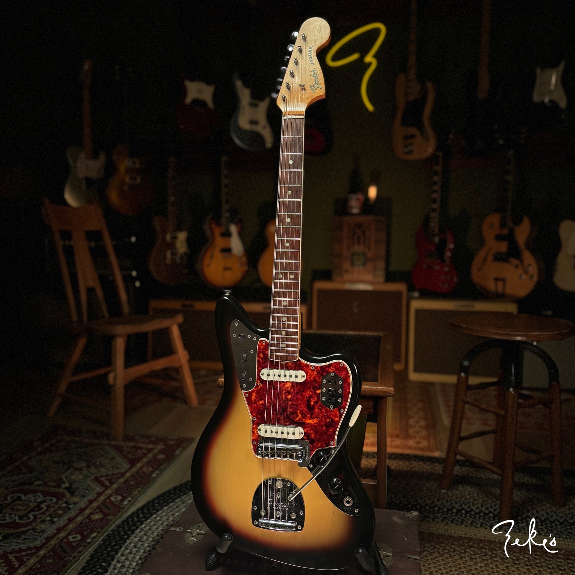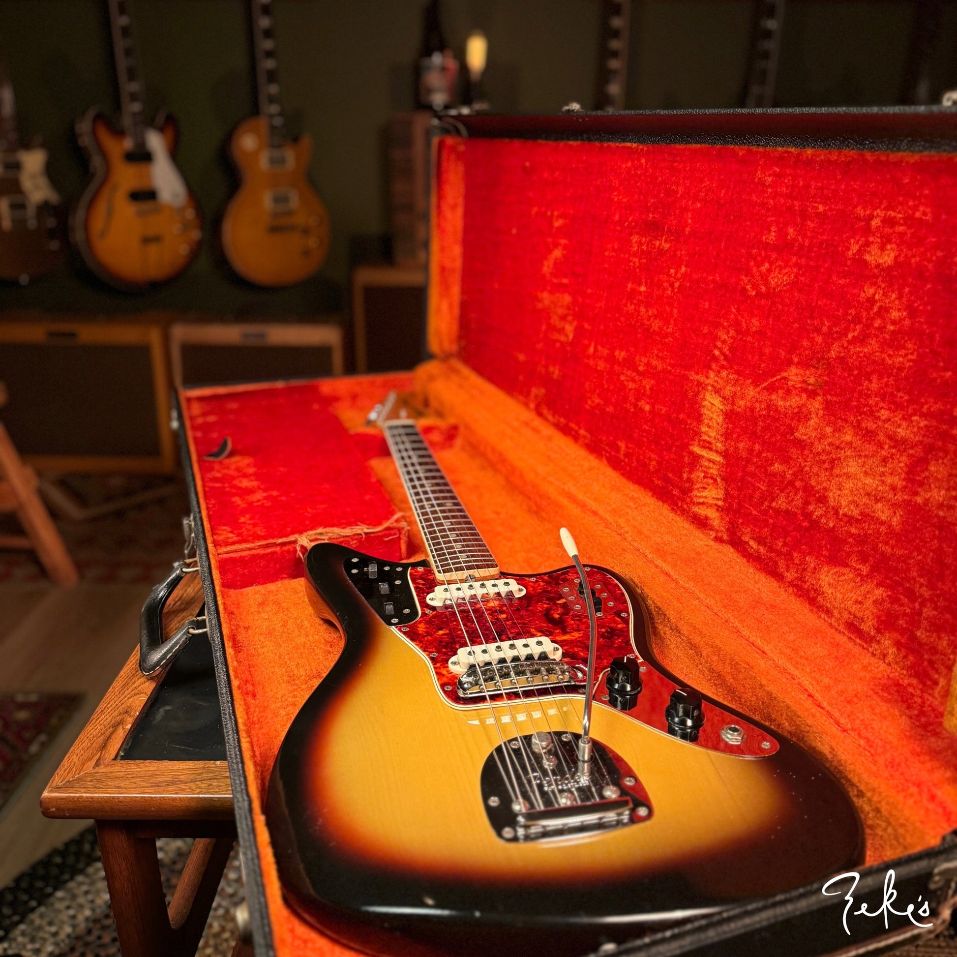 This extremely clean Fender Jaguar from 1966 is such a cool guitar. Along with the much preferred by many Vibrato system, (sorry cousin Strat), and the really unique rhythm circuit and electronics, the Jaguar was way ahead of its time. Even though they weren't too well received until years later, these days they are gettin the love they deserve.