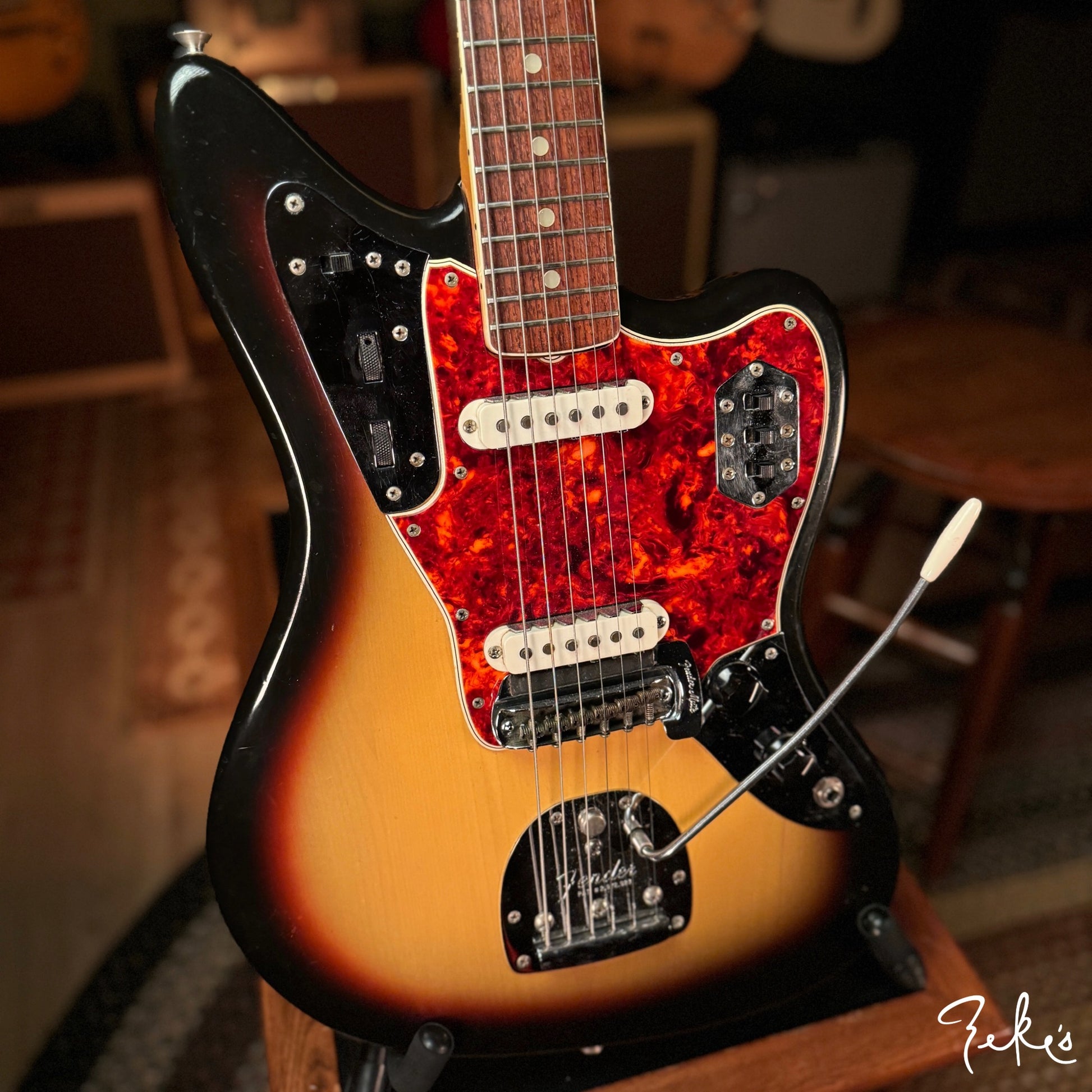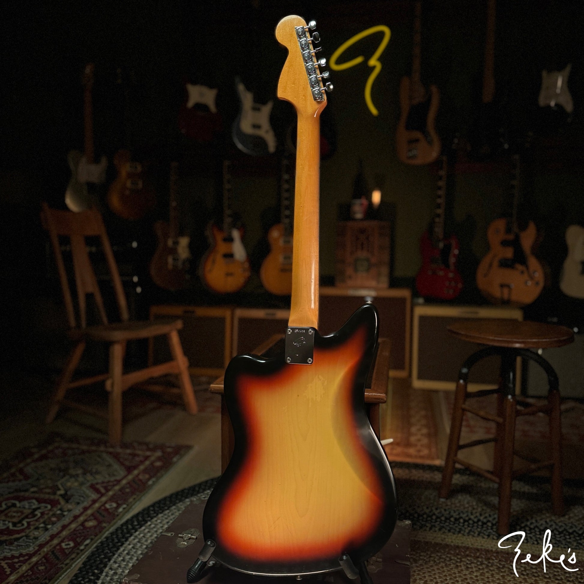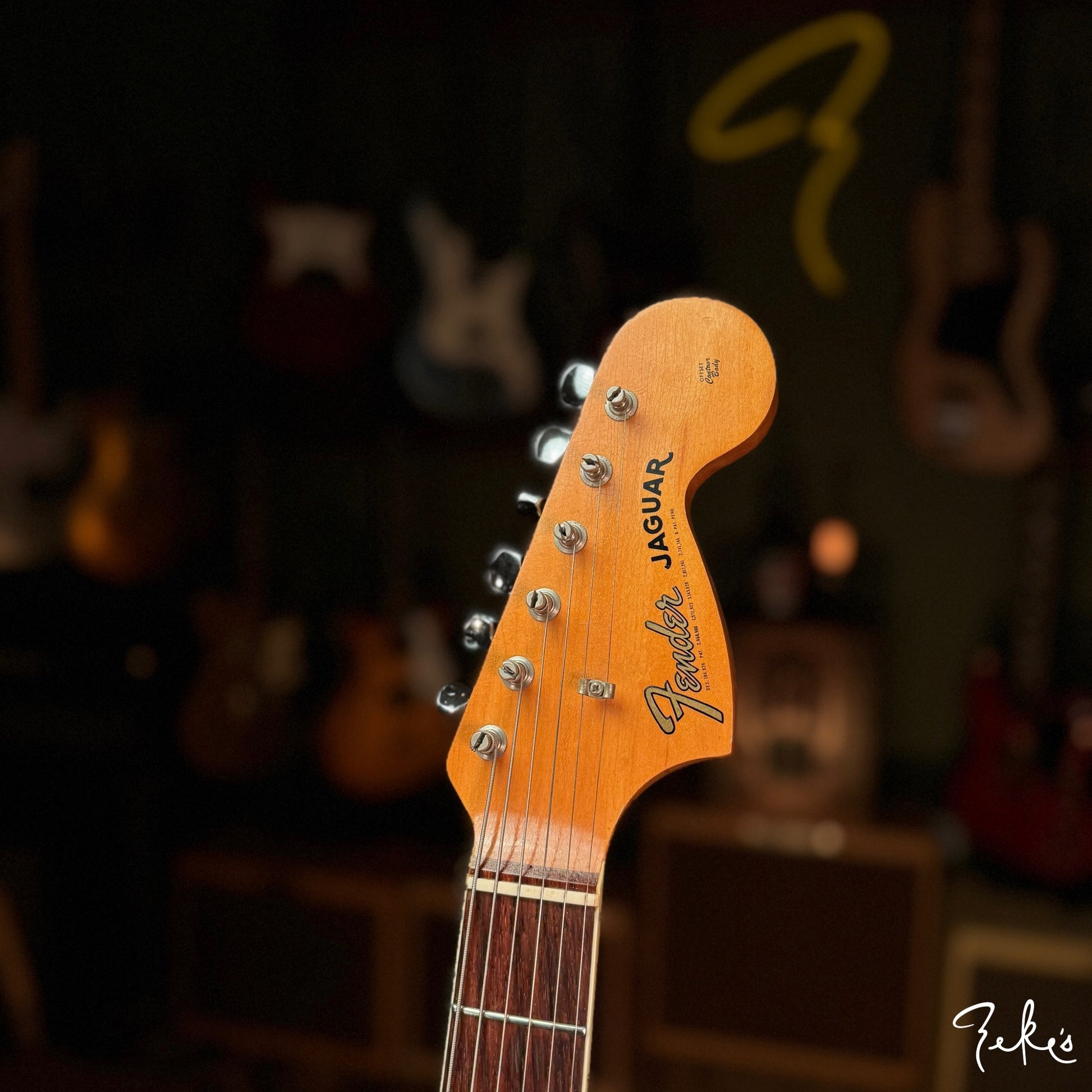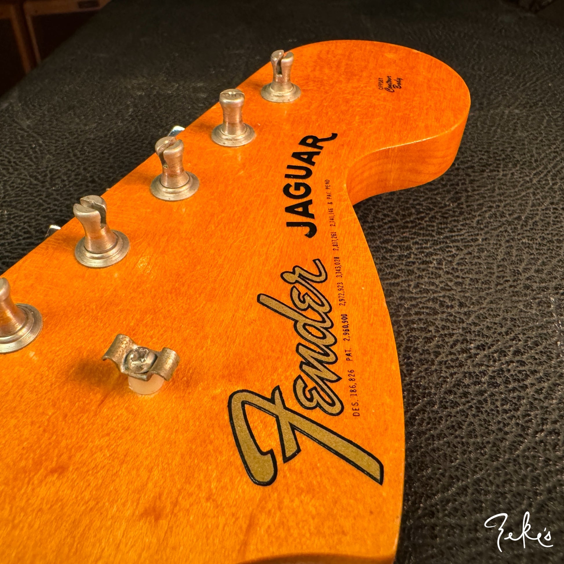 There's a little buckle rash on the back, finish only. The first few frets have some minimal signs of wear on the beautiful rosewood board. A couple of lines of finish are missing on the back of the neck. Someone really babied this Jag but still played it a lot. There is gorgeous checking throughout the neck and headstock. The electronics seem untouched and function great. The case logo is missing the "F" but otherwise is in great shape. Plus there is a strap, Fender cloth, and CBS Fender Medium White Celluloid pick.