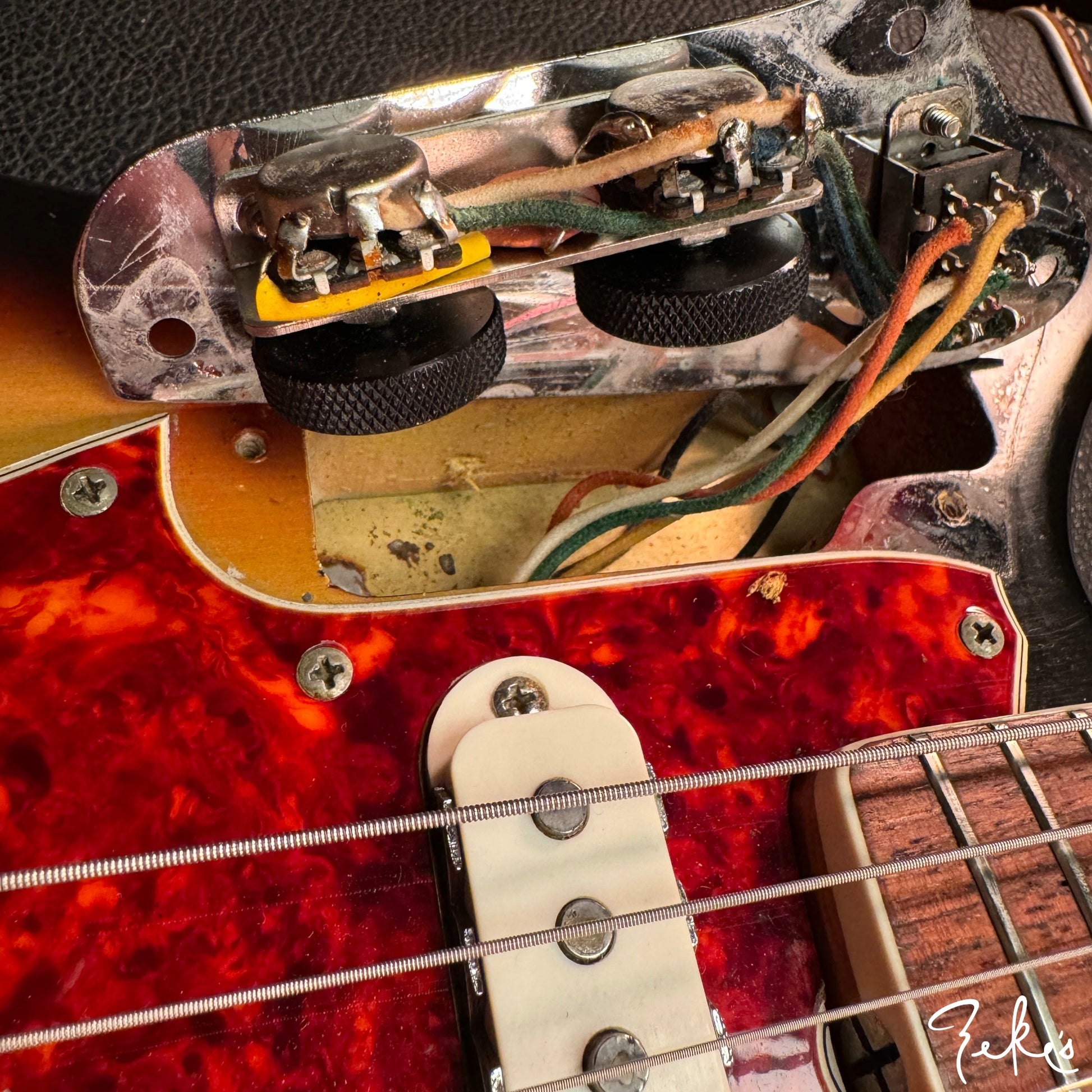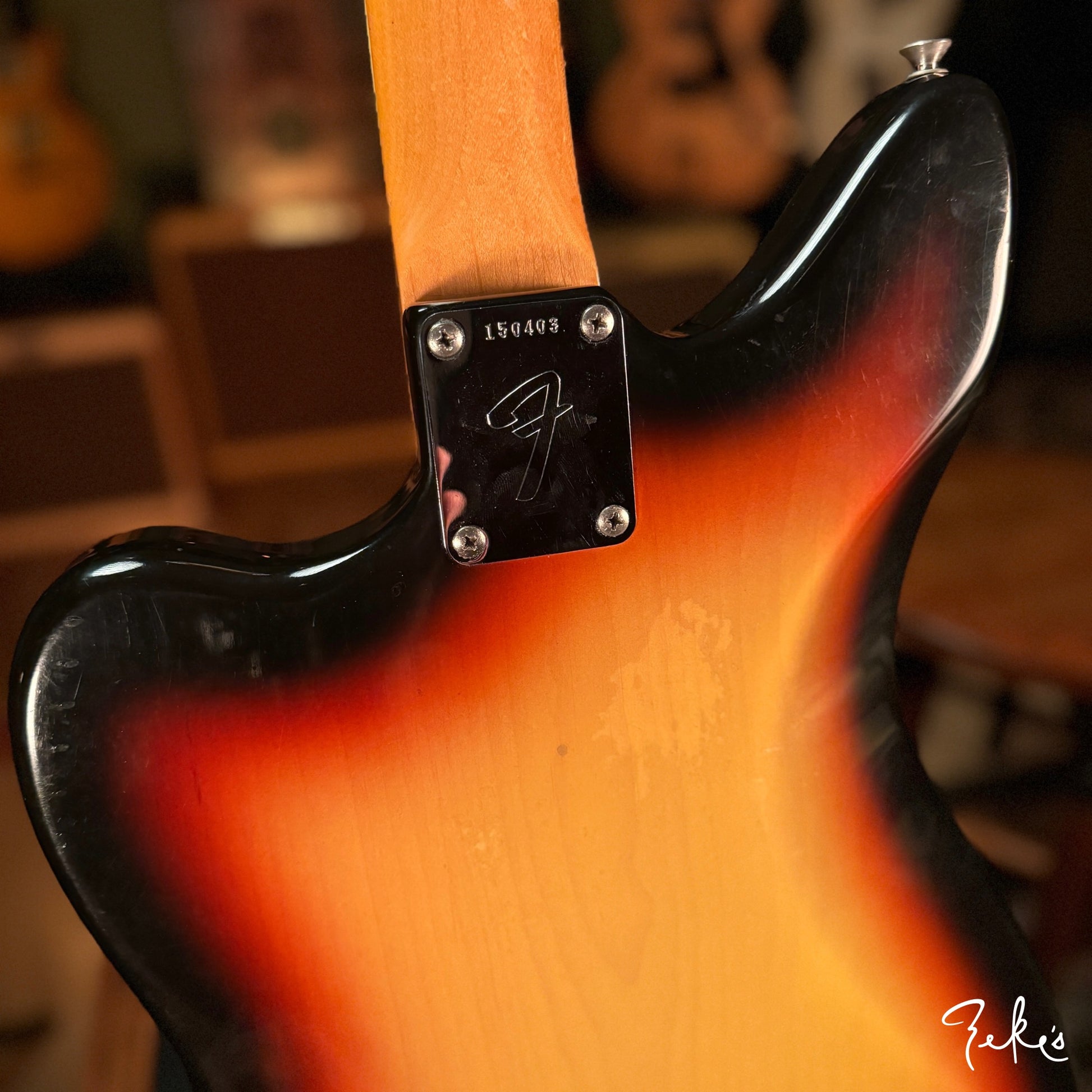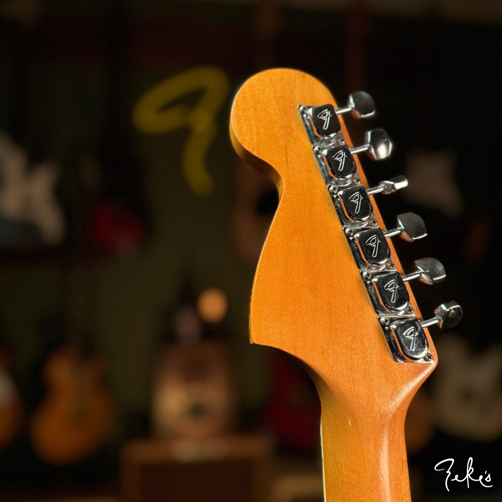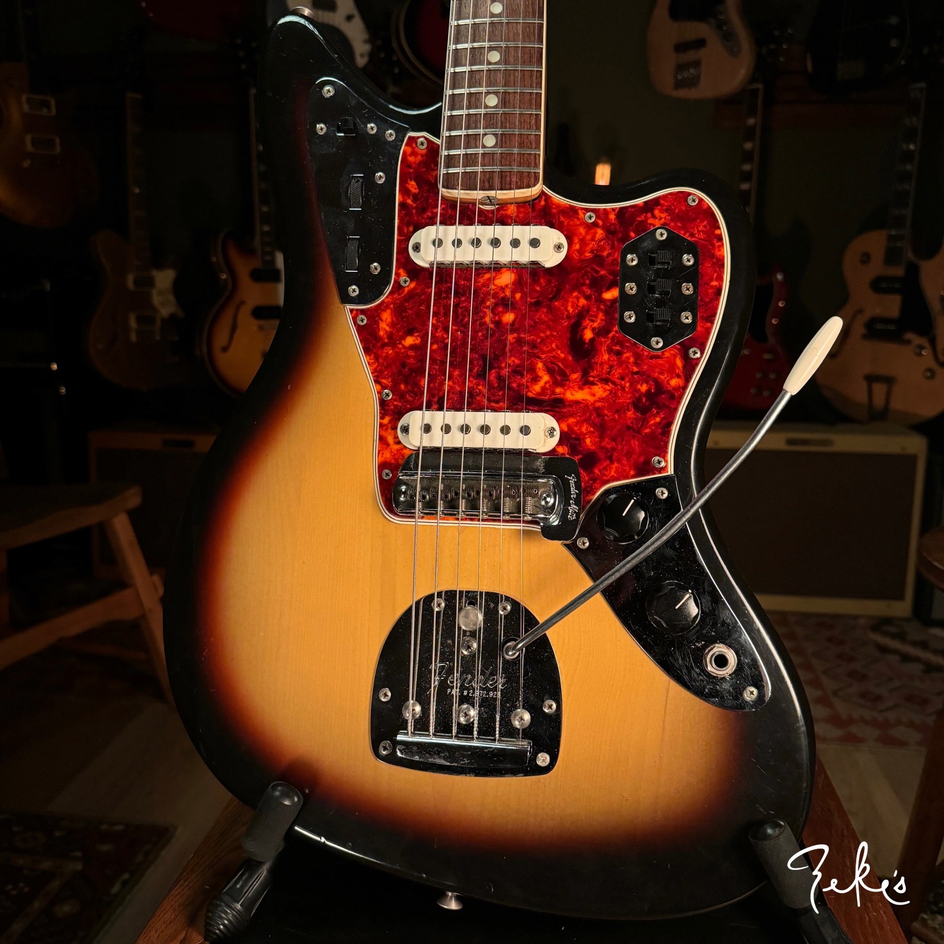 There's a little buckle rash on the back, finish only. The first few frets have some minimal signs of wear on the beautiful rosewood board. A couple of lines of finish are missing on the back of the neck. Someone really babied this Jag but still played it a lot. There is gorgeous checking throughout the neck and headstock. The electronics seem untouched and function great. The case logo is missing the "F" but otherwise is in great shape. Plus there is a strap, Fender cloth, and CBS Fender Medium White Celluloid pick.