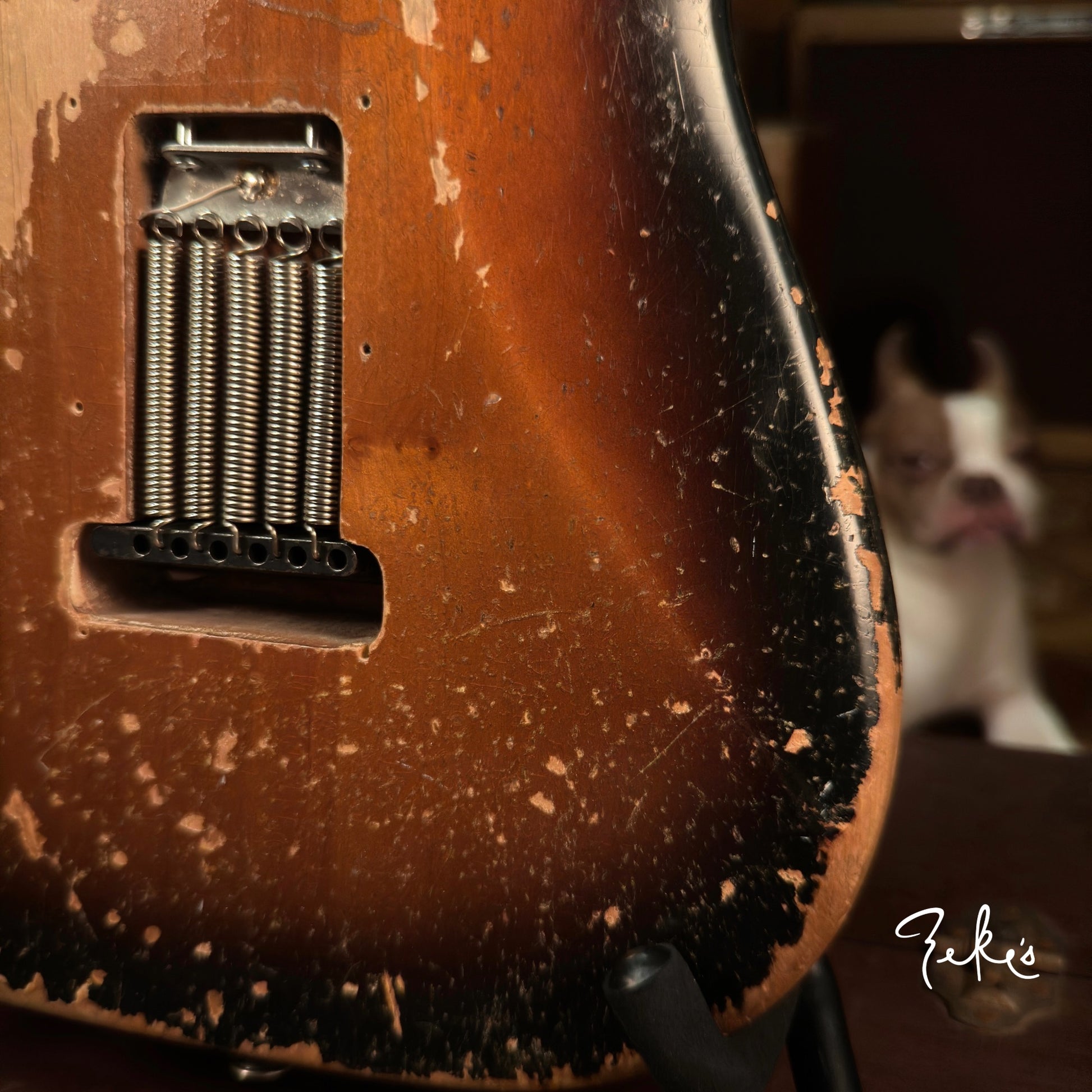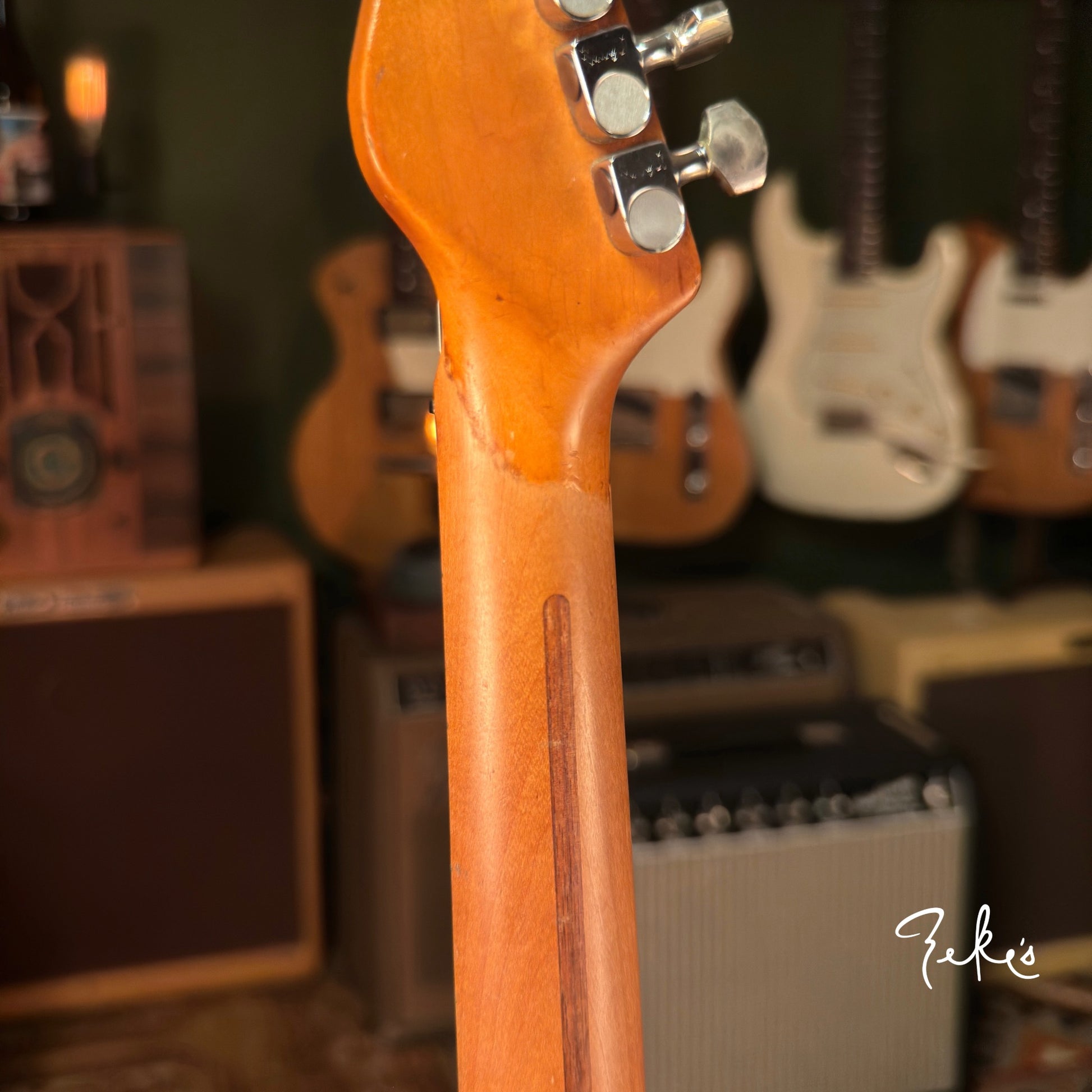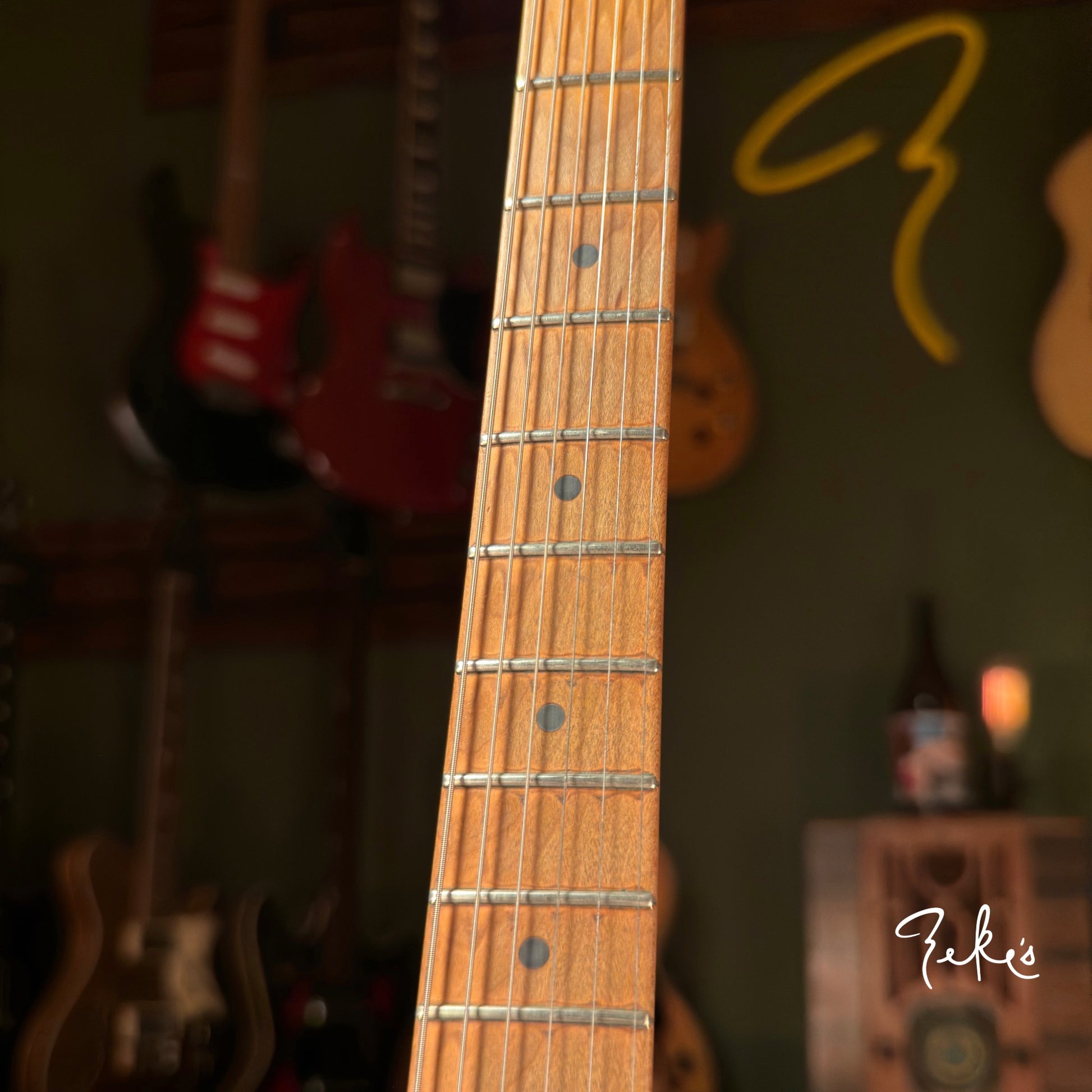 Besides re-frets, he had the 2 pivot Fender bridge installed. (original vintage style Wilkinson is included). He also changed the pickups to a Seymour Duncan "Cool Rail" in the bridge that pair nicely with the Fender Noiseless Middle and Neck. Even though the guitar plays and sounds great, some of the jumbo frets on the slim but fast neck could be pressed in or reseated at some point. The neck profile has been played/worn into sort of a really soft "V", but not really haha! Just comfortable! Especially for those that love a slim fast neck.