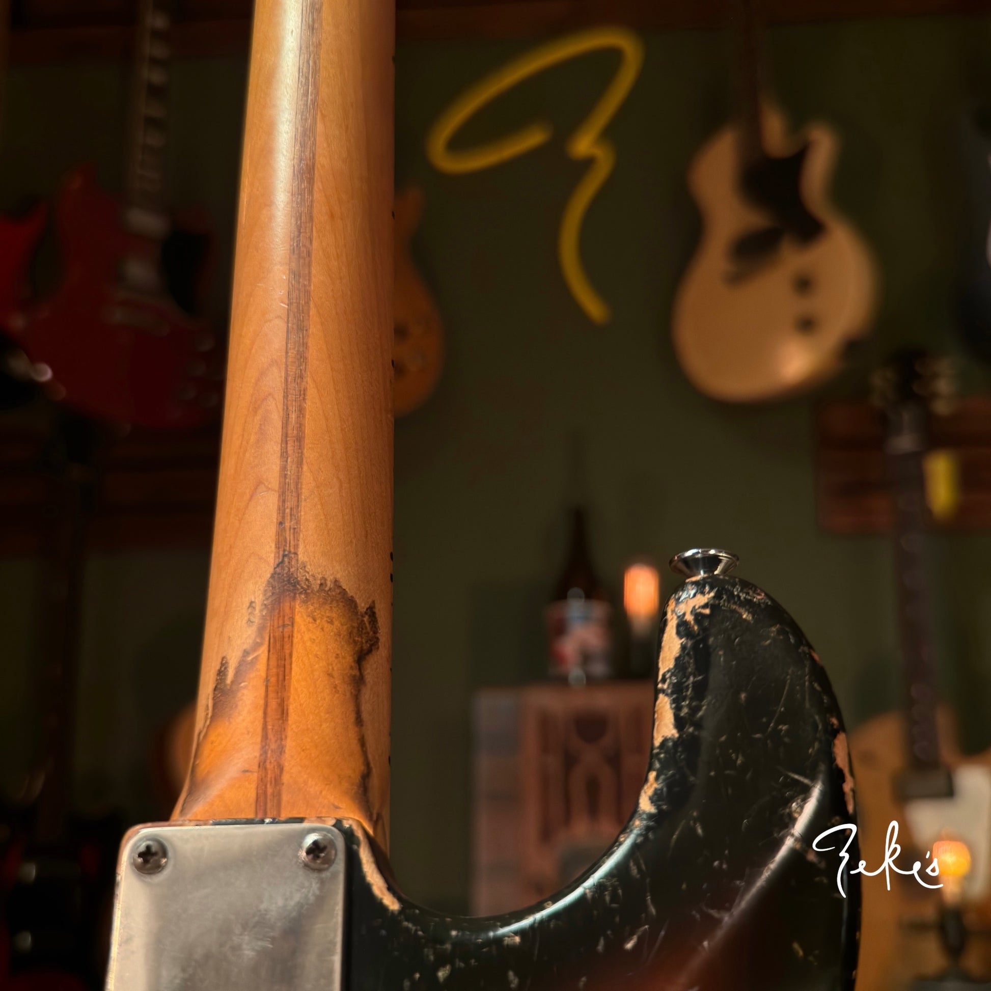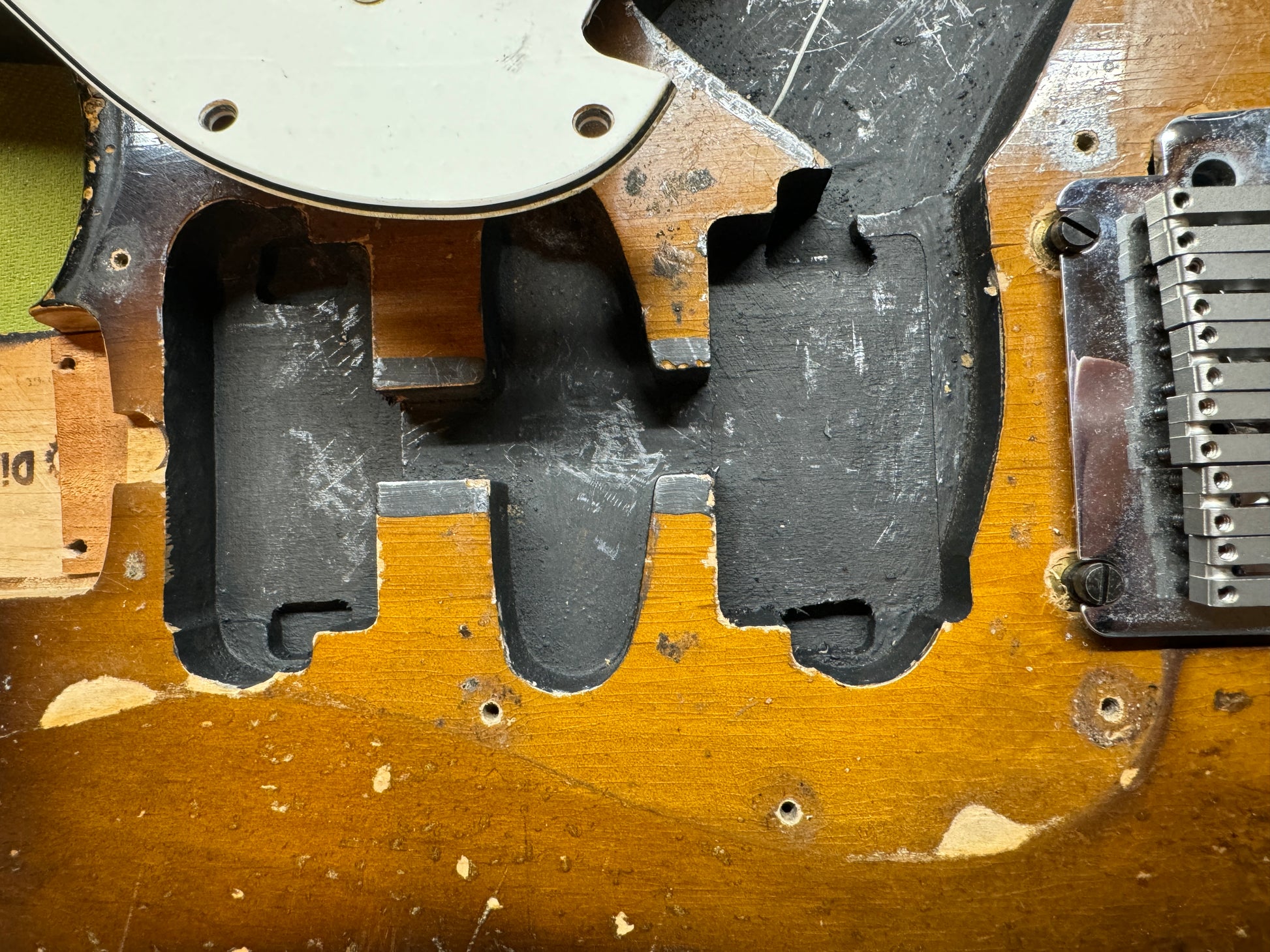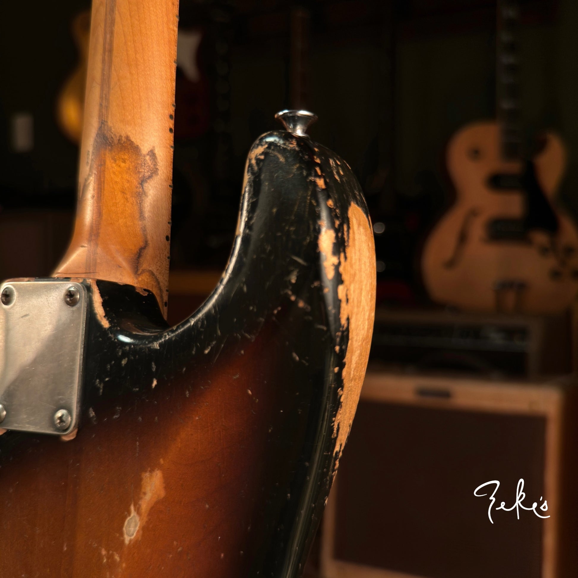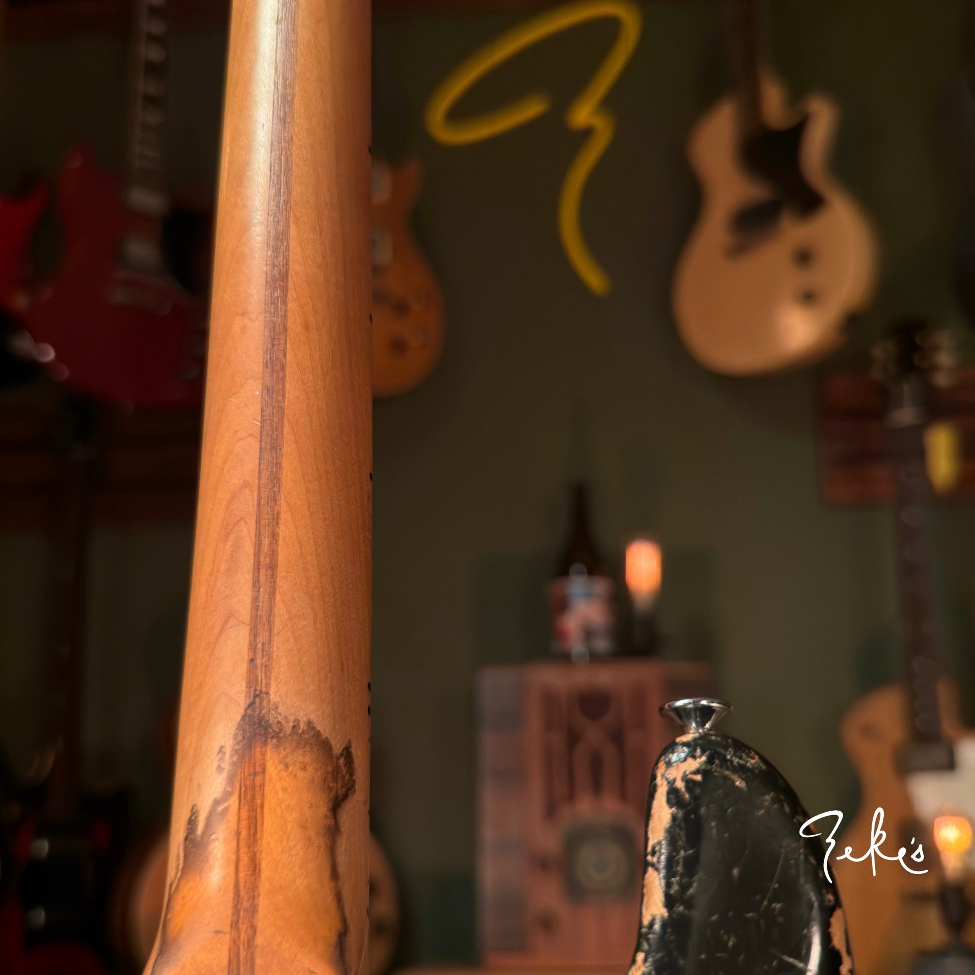 Besides re-frets, he had the 2 pivot Fender bridge installed. (original vintage style Wilkinson is included). He also changed the pickups to a Seymour Duncan "Cool Rail" in the bridge that pair nicely with the Fender Noiseless Middle and Neck. Even though the guitar plays and sounds great, some of the jumbo frets on the slim but fast neck could be pressed in or reseated at some point. The neck profile has been played/worn into sort of a really soft "V", but not really haha! Just comfortable! Especially for those that love a slim fast neck.