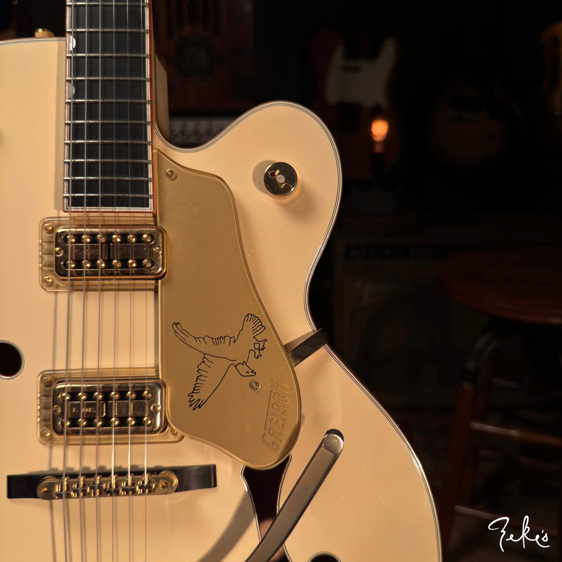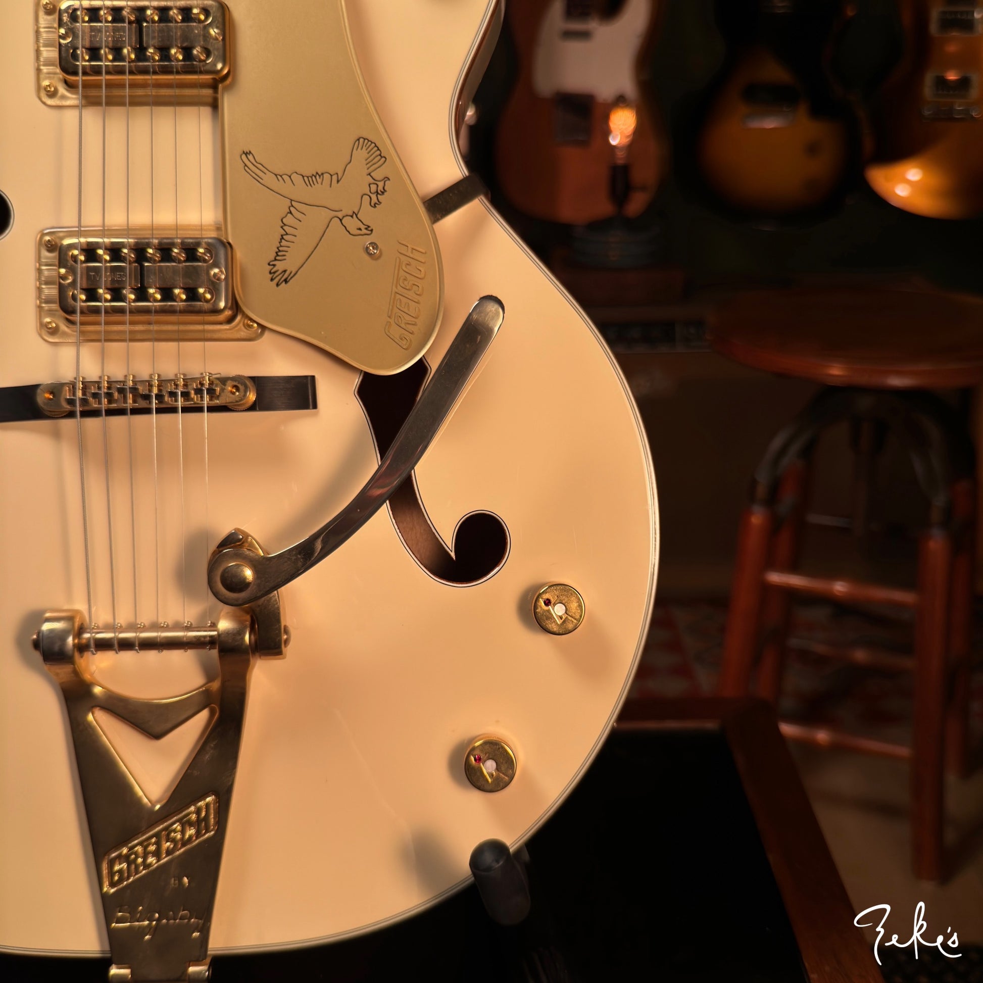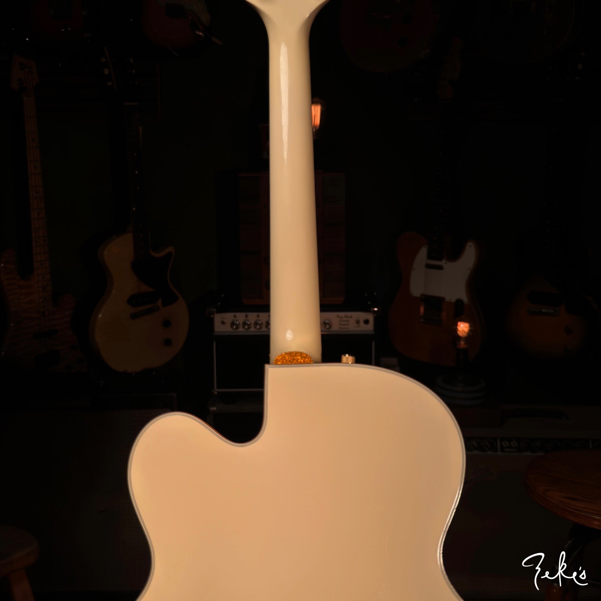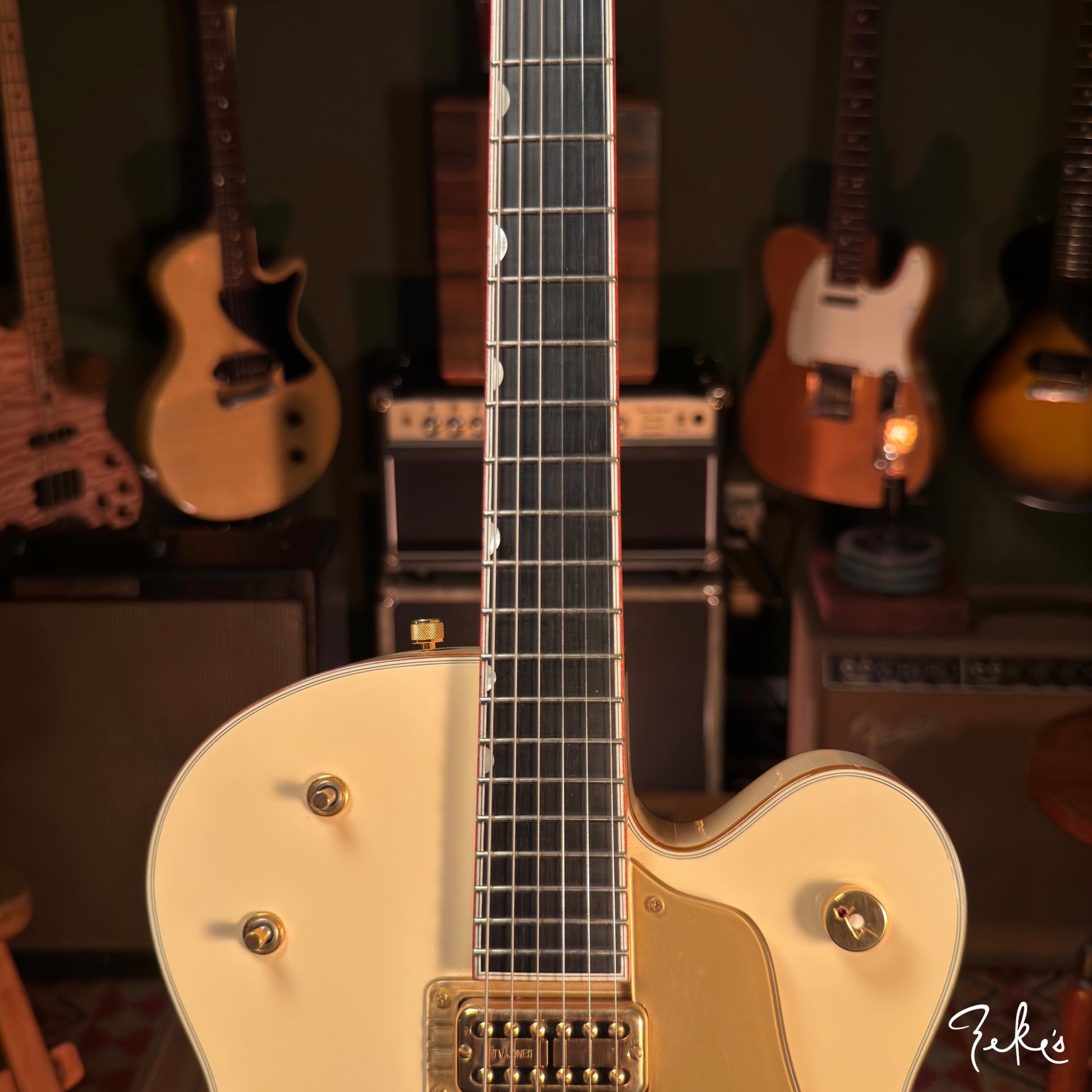 Here we have a really clean 2014 White Falcon featuring the desirable TV Jones TV Classic pickups. Set up with Stringjoy Balanced tension 10's. It stays and "PLAYS" in tune, unlike some of the originals...no offense...ha!