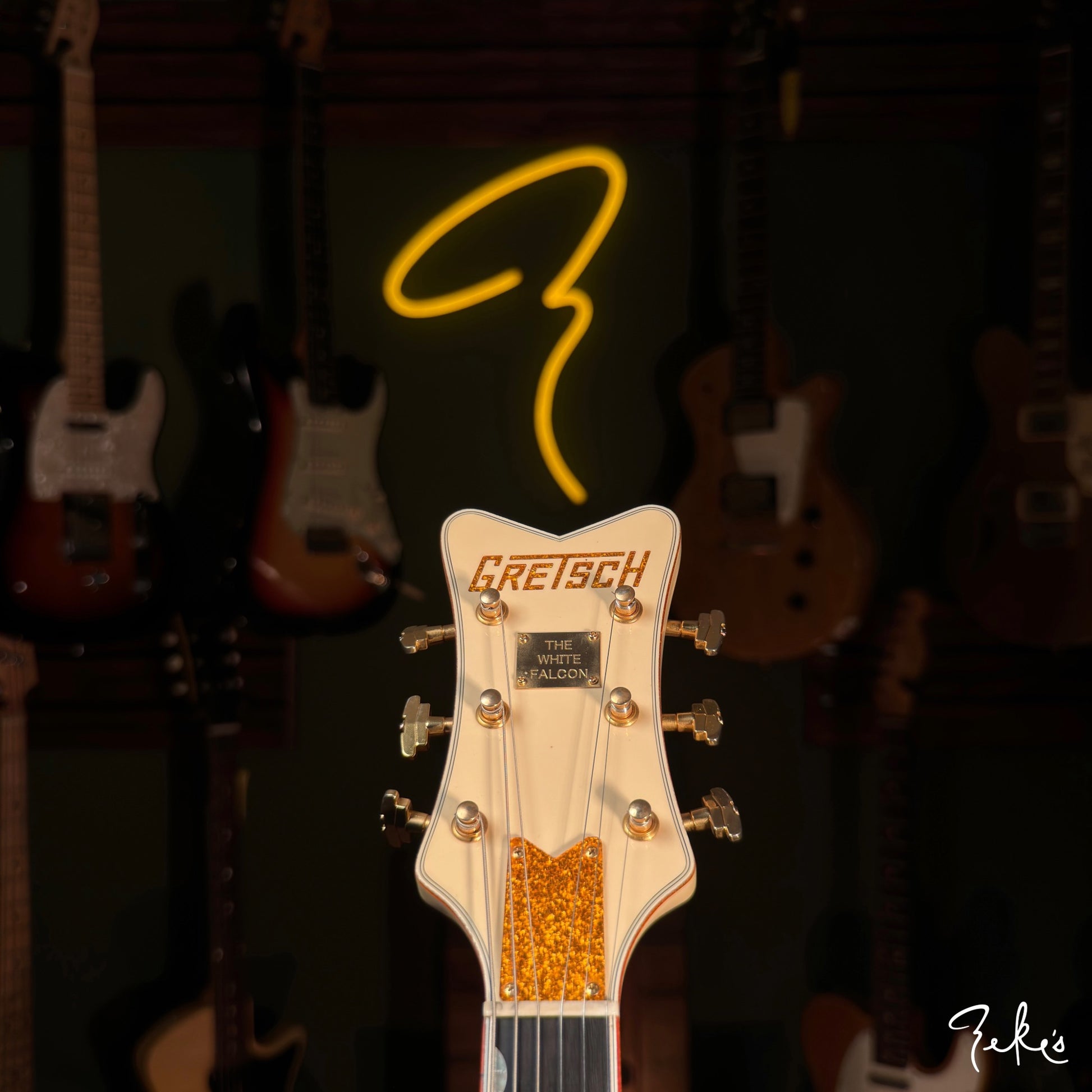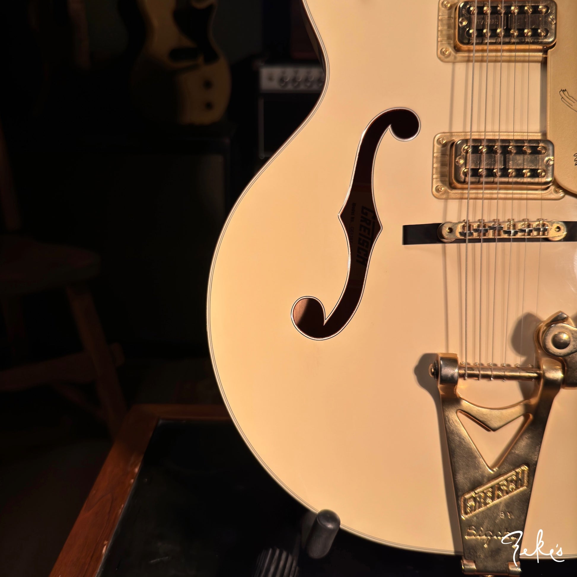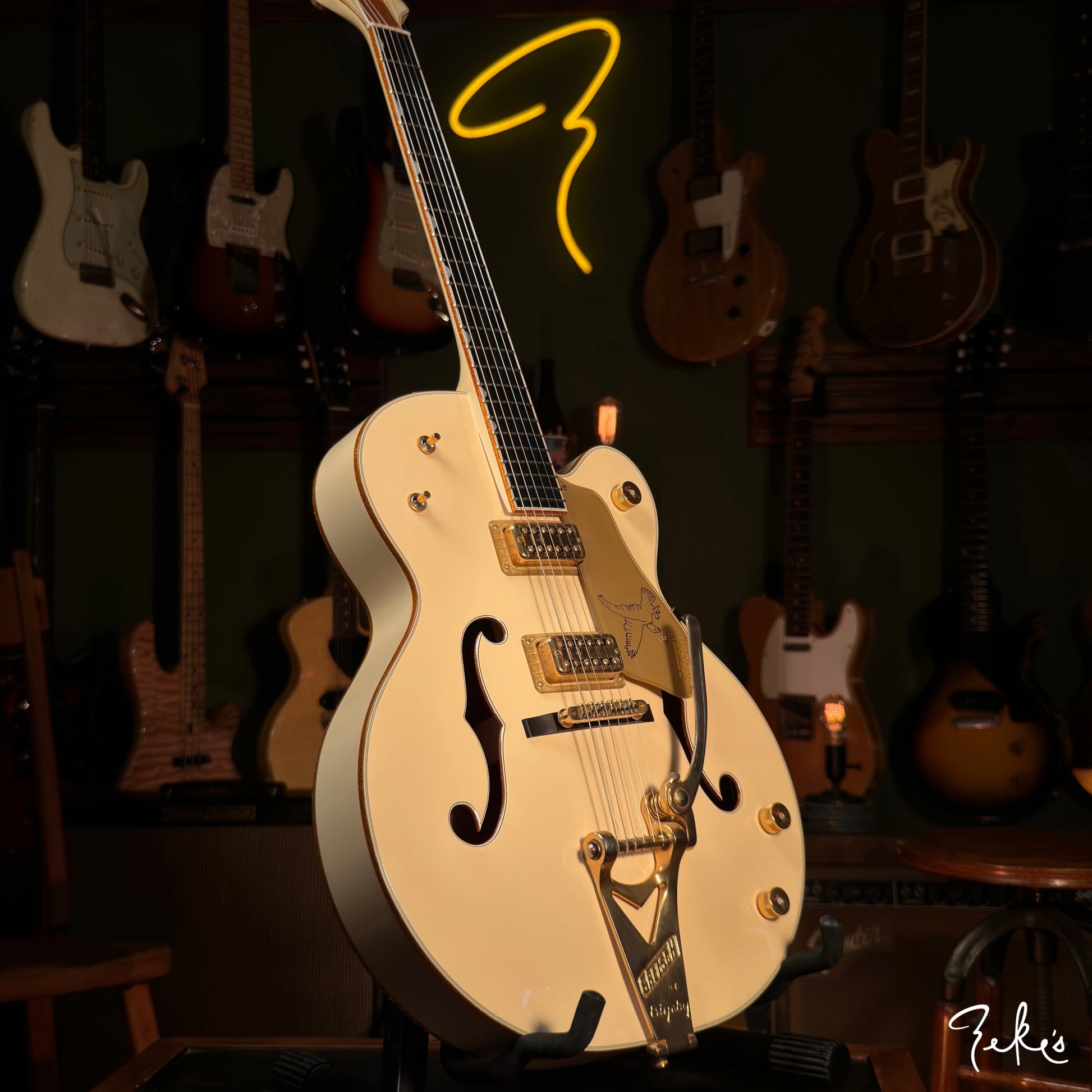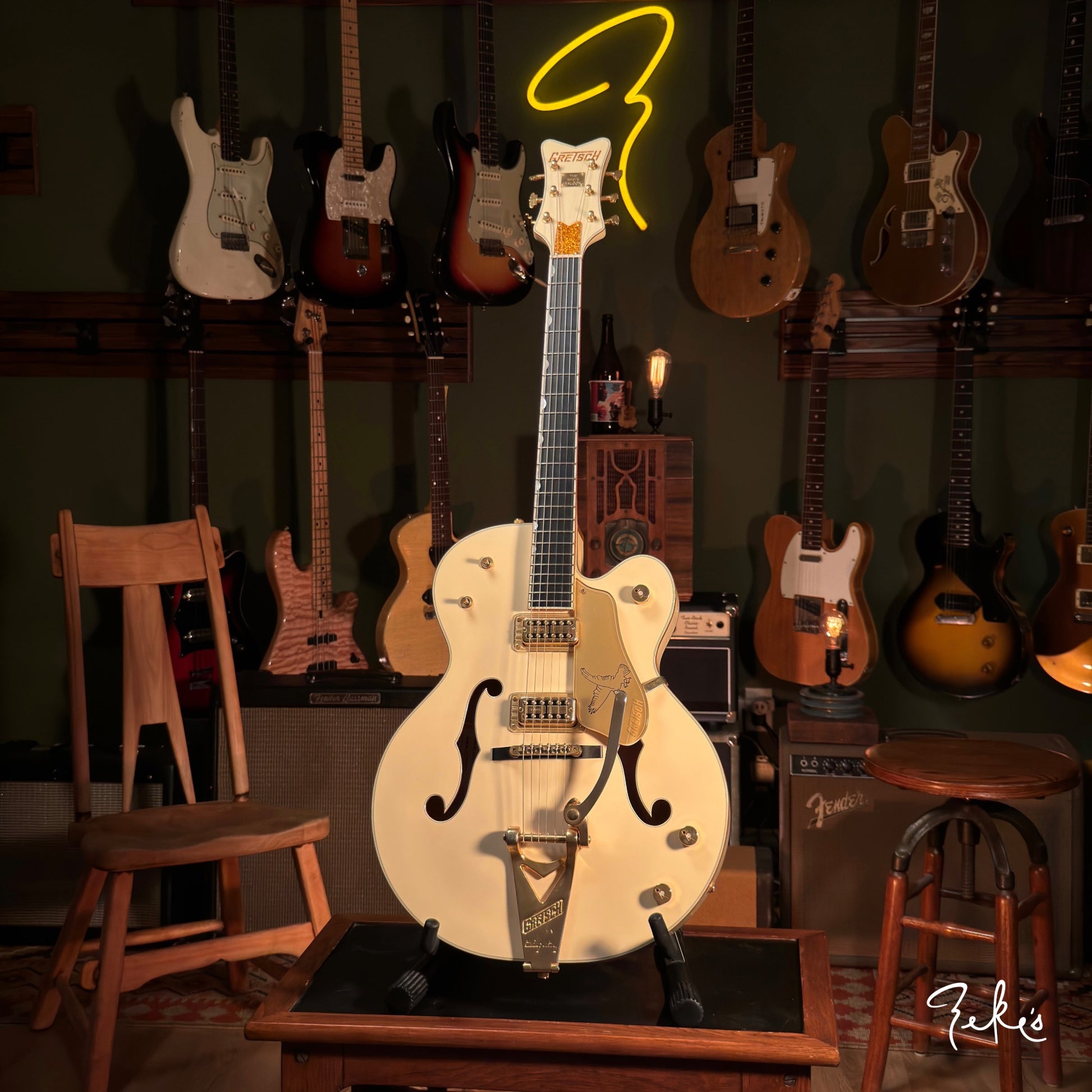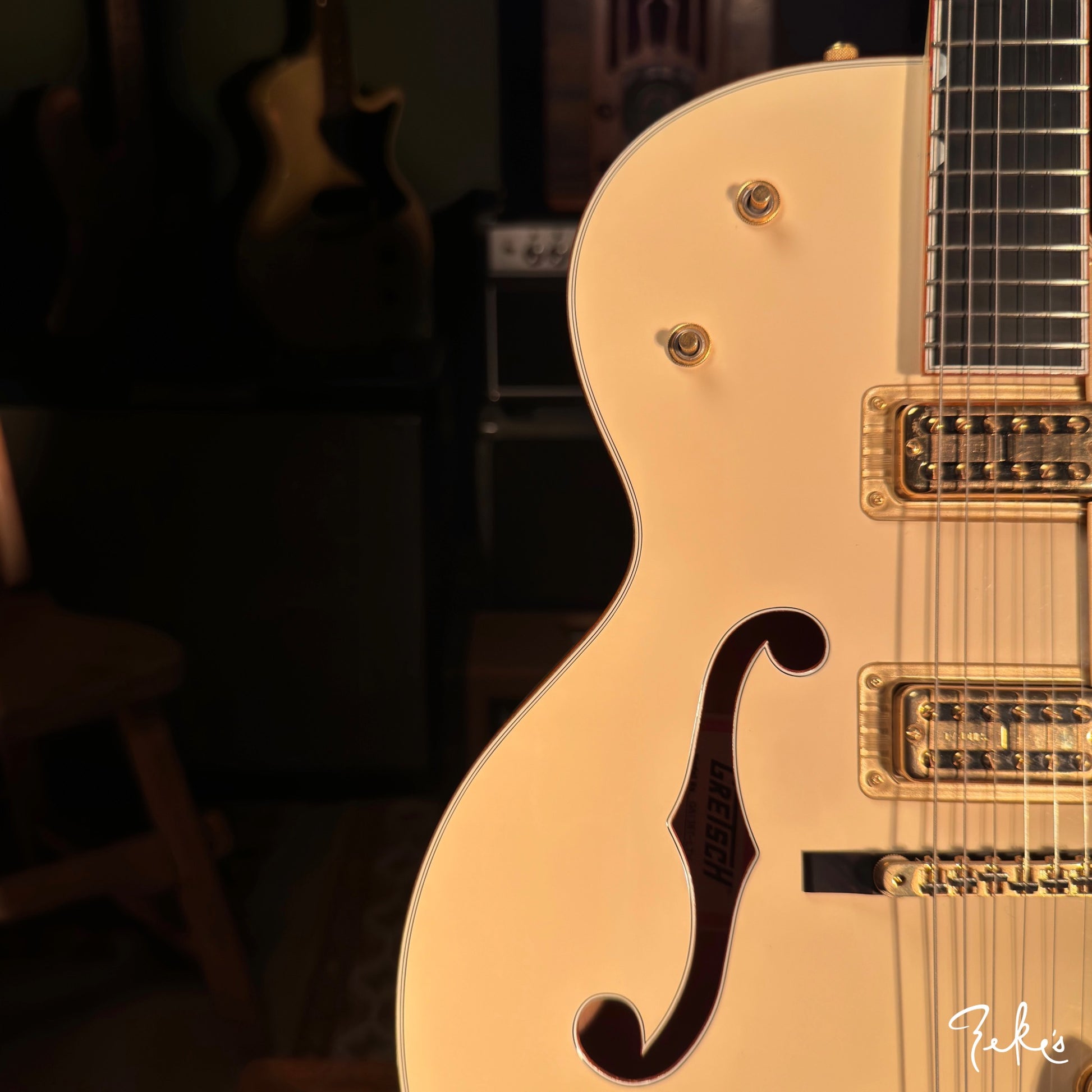 Here we have a really clean 2014 White Falcon featuring the desirable TV Jones TV Classic pickups. Set up with Stringjoy Balanced tension 10's. It stays and "PLAYS" in tune, unlike some of the originals...no offense...ha!
