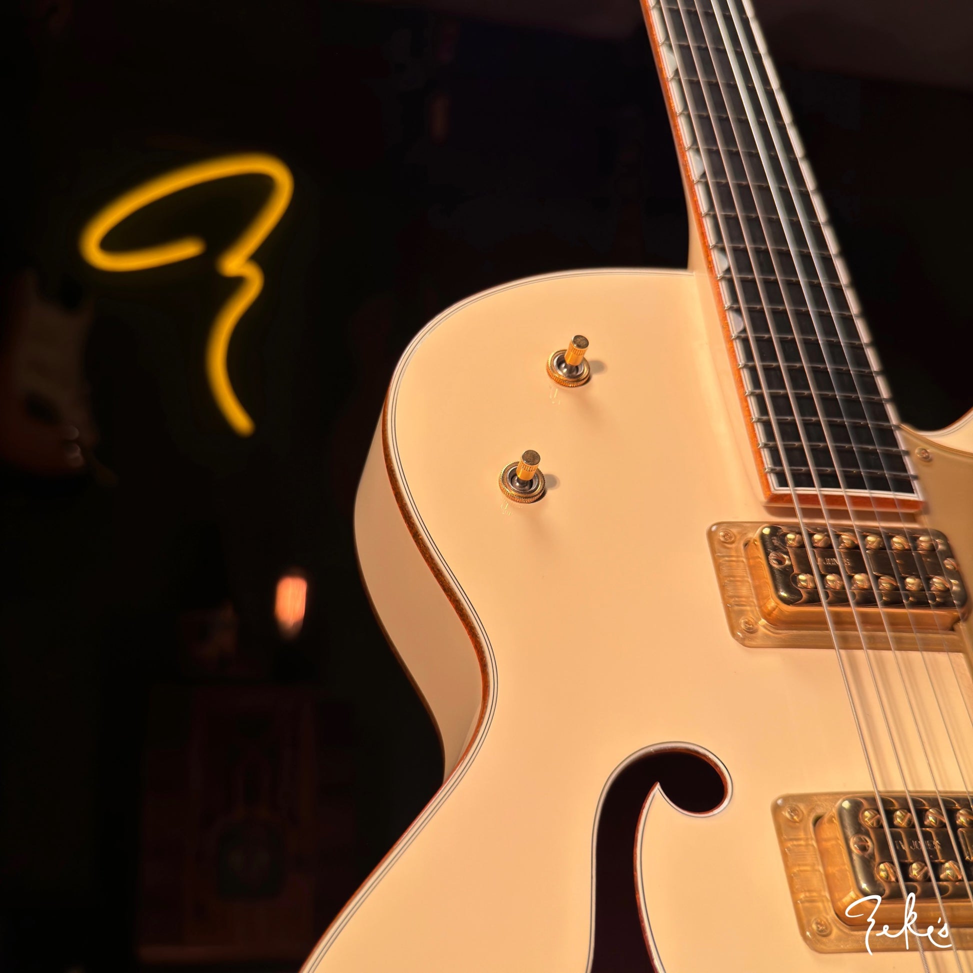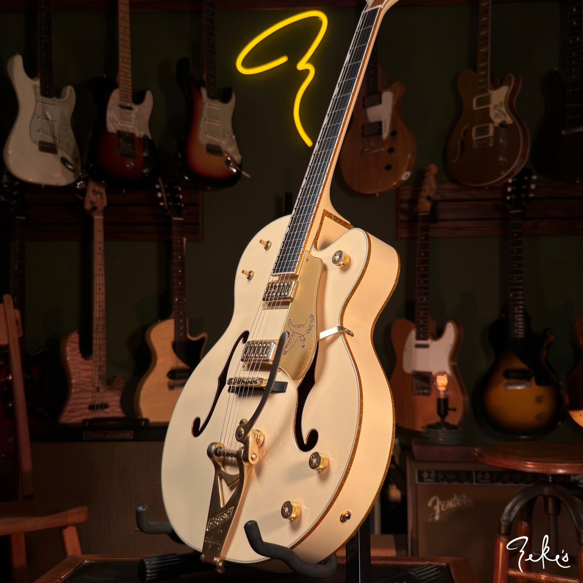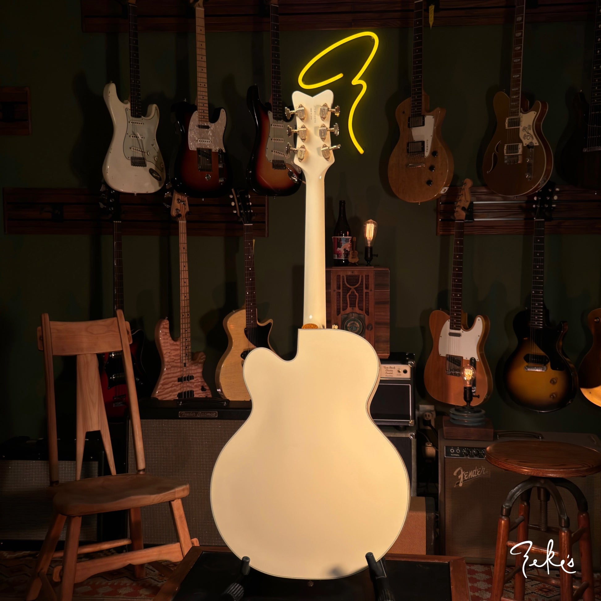 We dig the neck position that only a Gretsch can do. There's a little bit of player wear on hardware and or pickups. The frets have hardly any wear. This one is red2go!