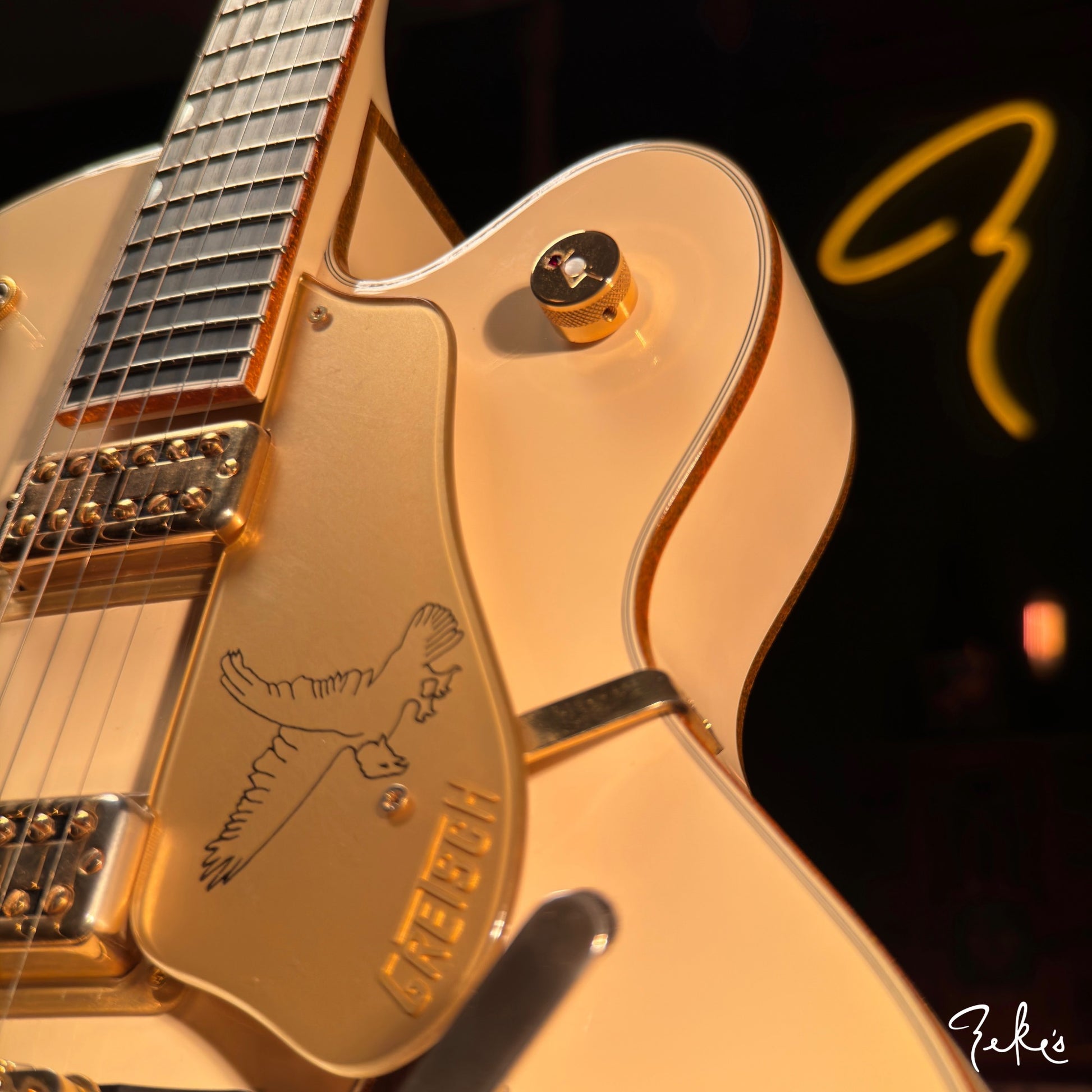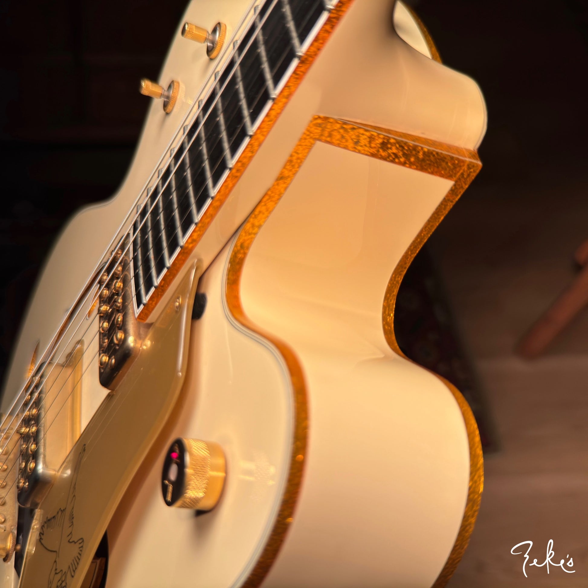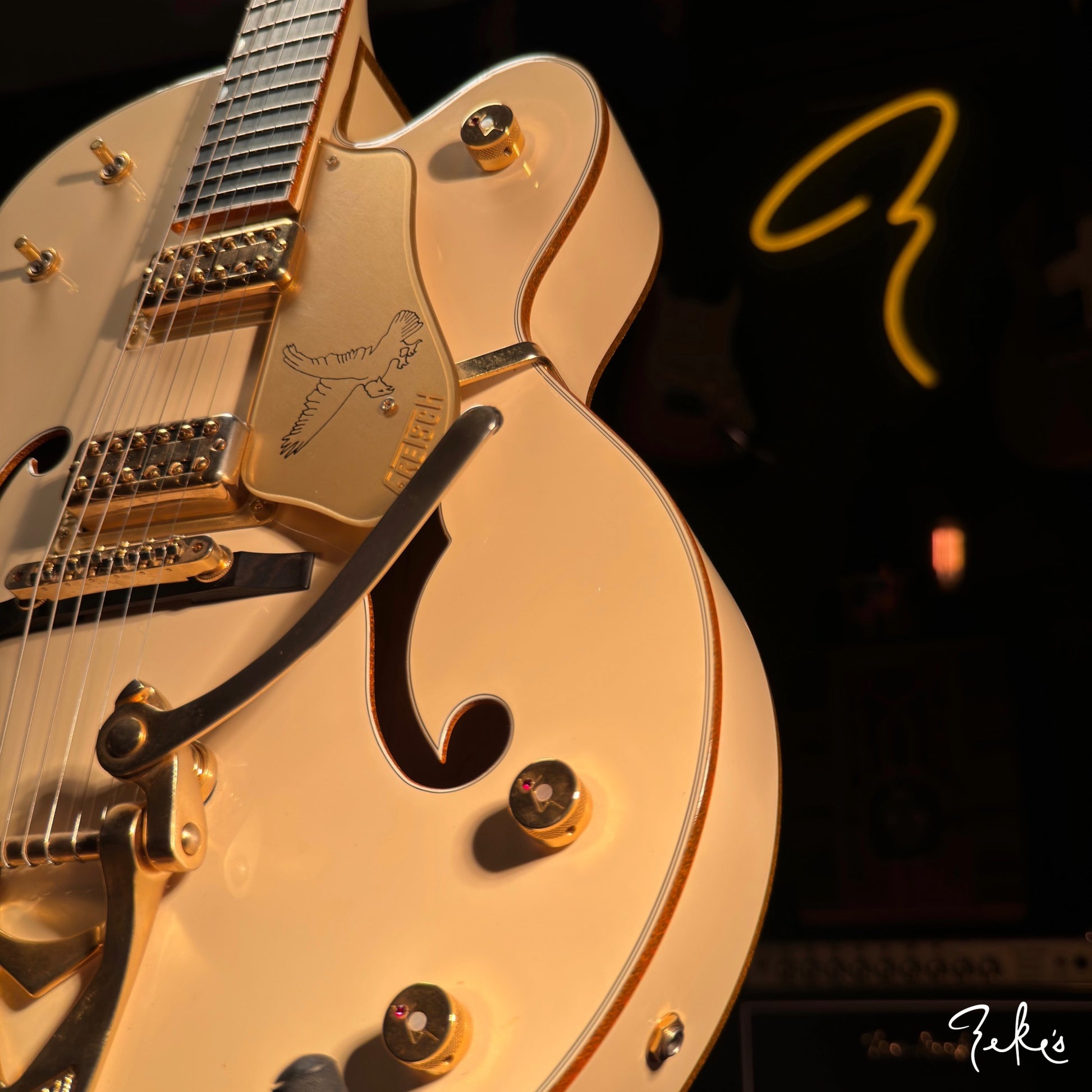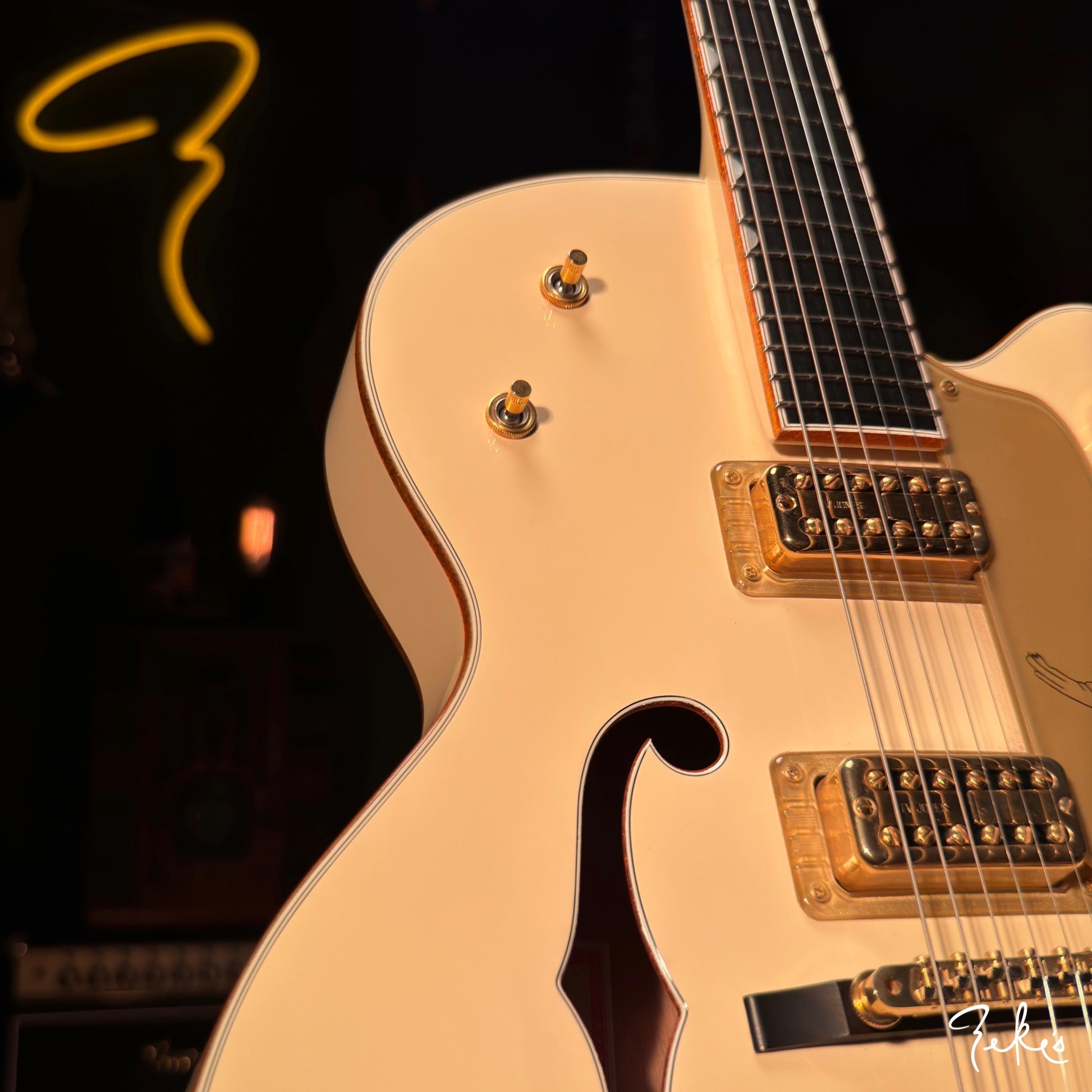 We dig the neck position that only a Gretsch can do. There's a little bit of player wear on hardware and or pickups. The frets have hardly any wear. This one is red2go!