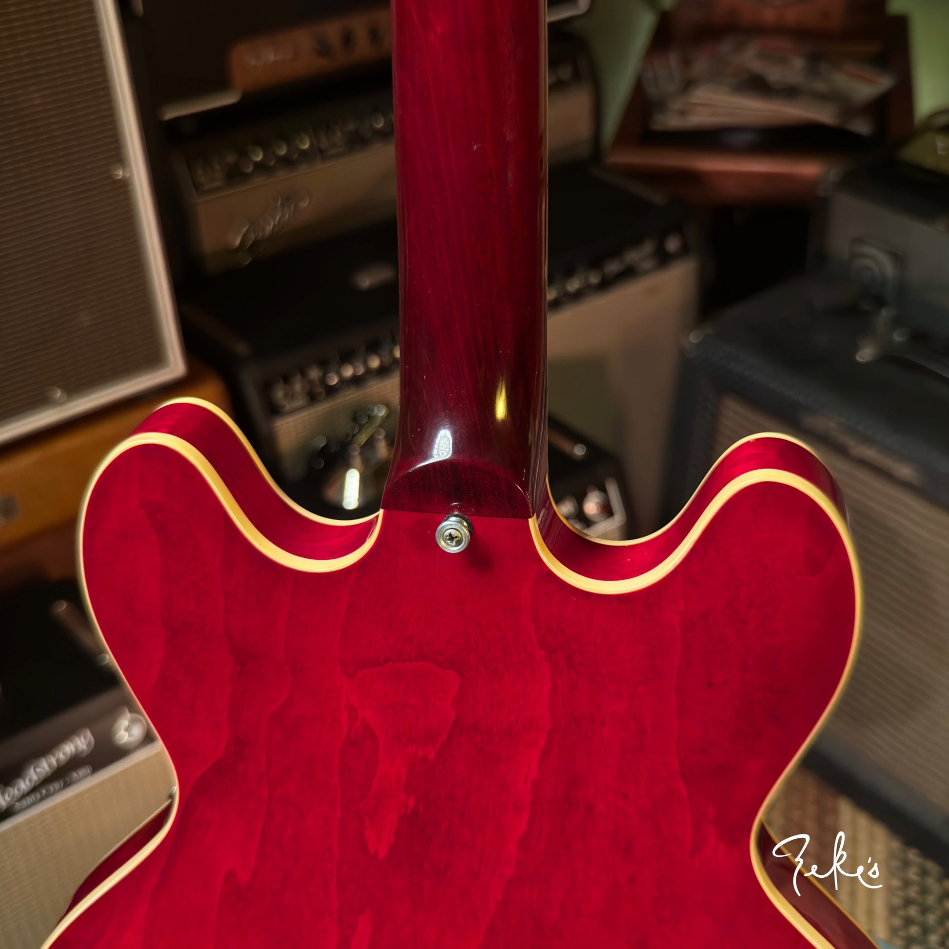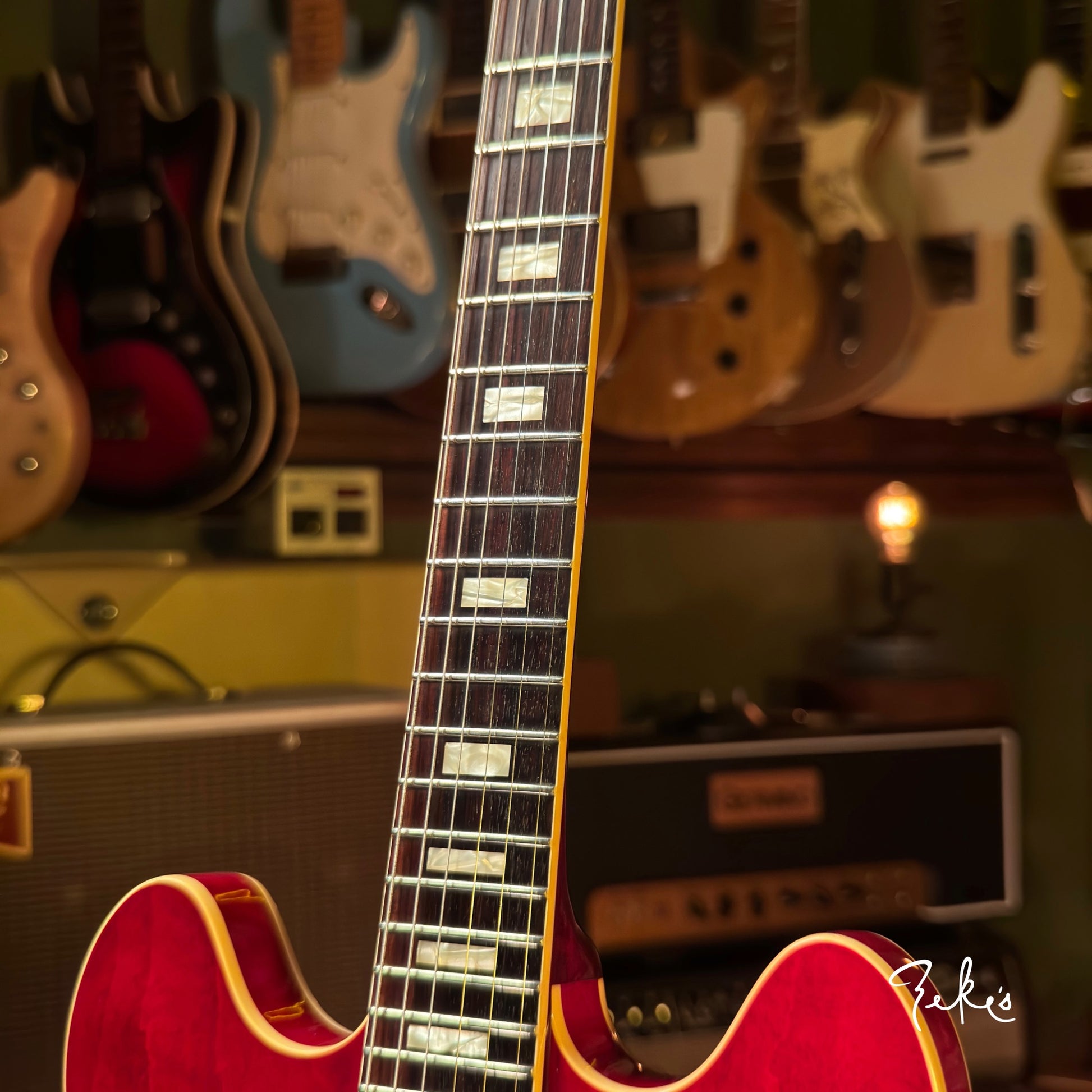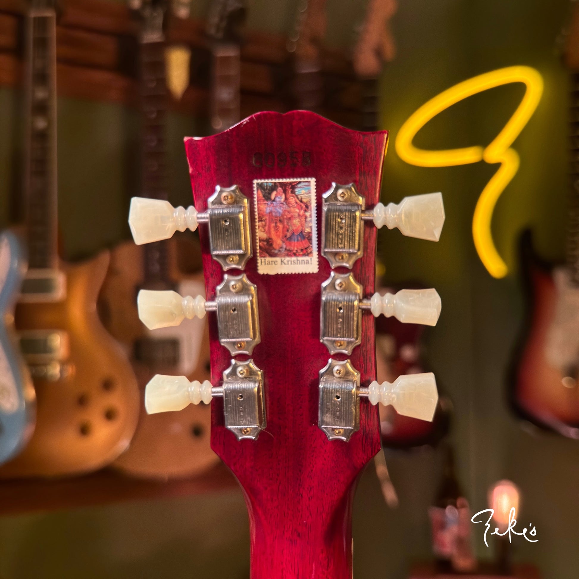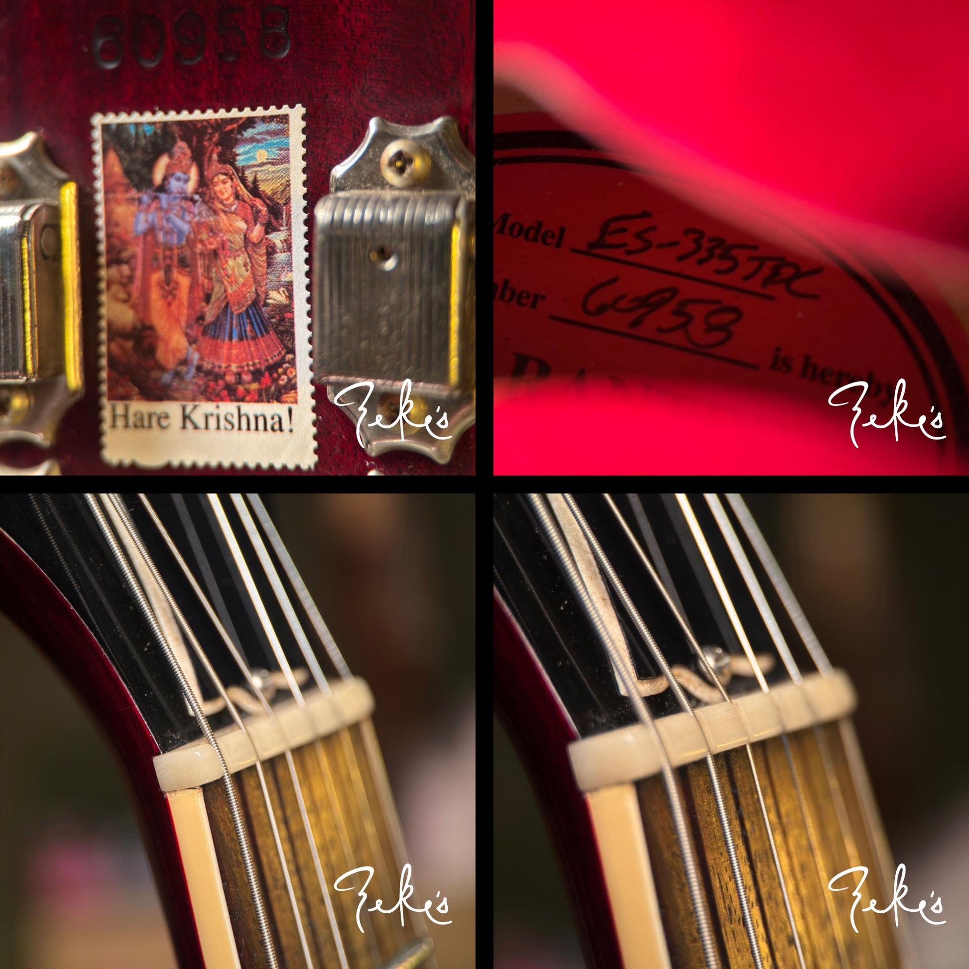 This one is in really great shape with normal player wear. It has had a bone nut added, and saddles replaced to the common nickel/brass (originals in the case with extra intonation screws). There's a Hare Krishna sticker on the headstock. A clear knod to Eric Clapton and his famous Cream era 335. Love that tone! At seven and a half pounds with a slim taper neck up to chunky this one feels great!
