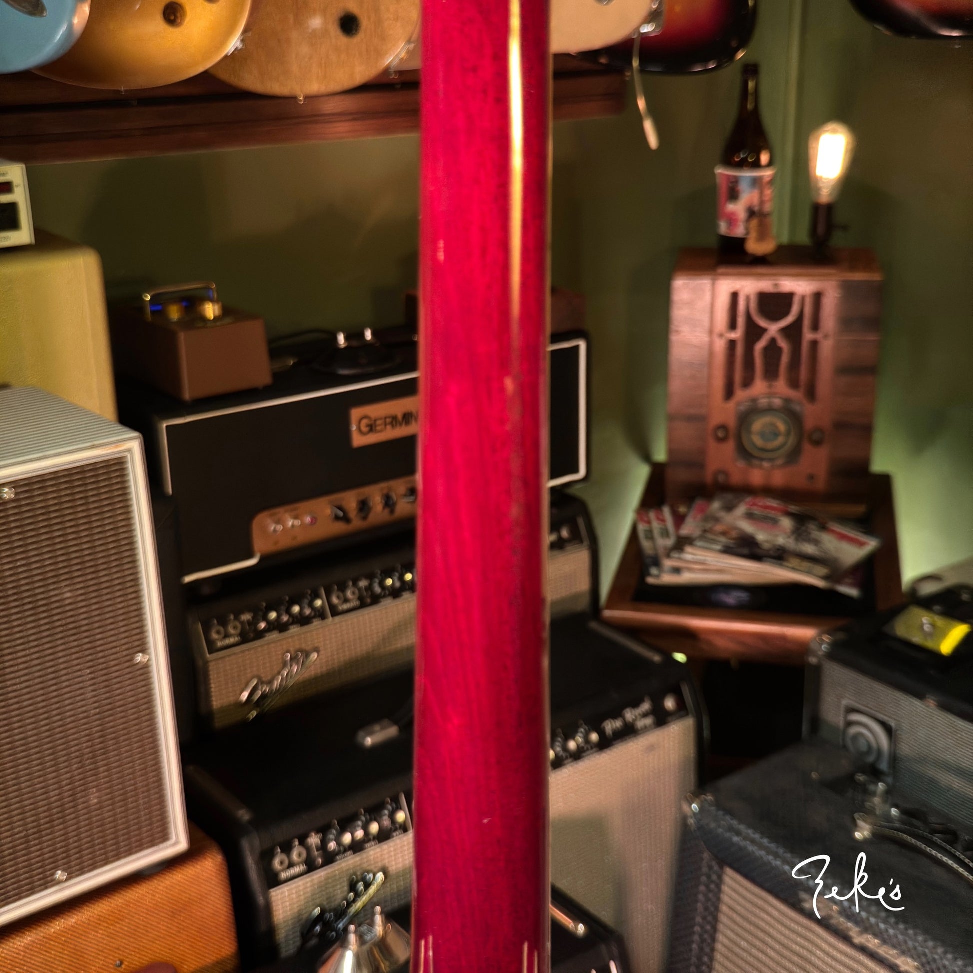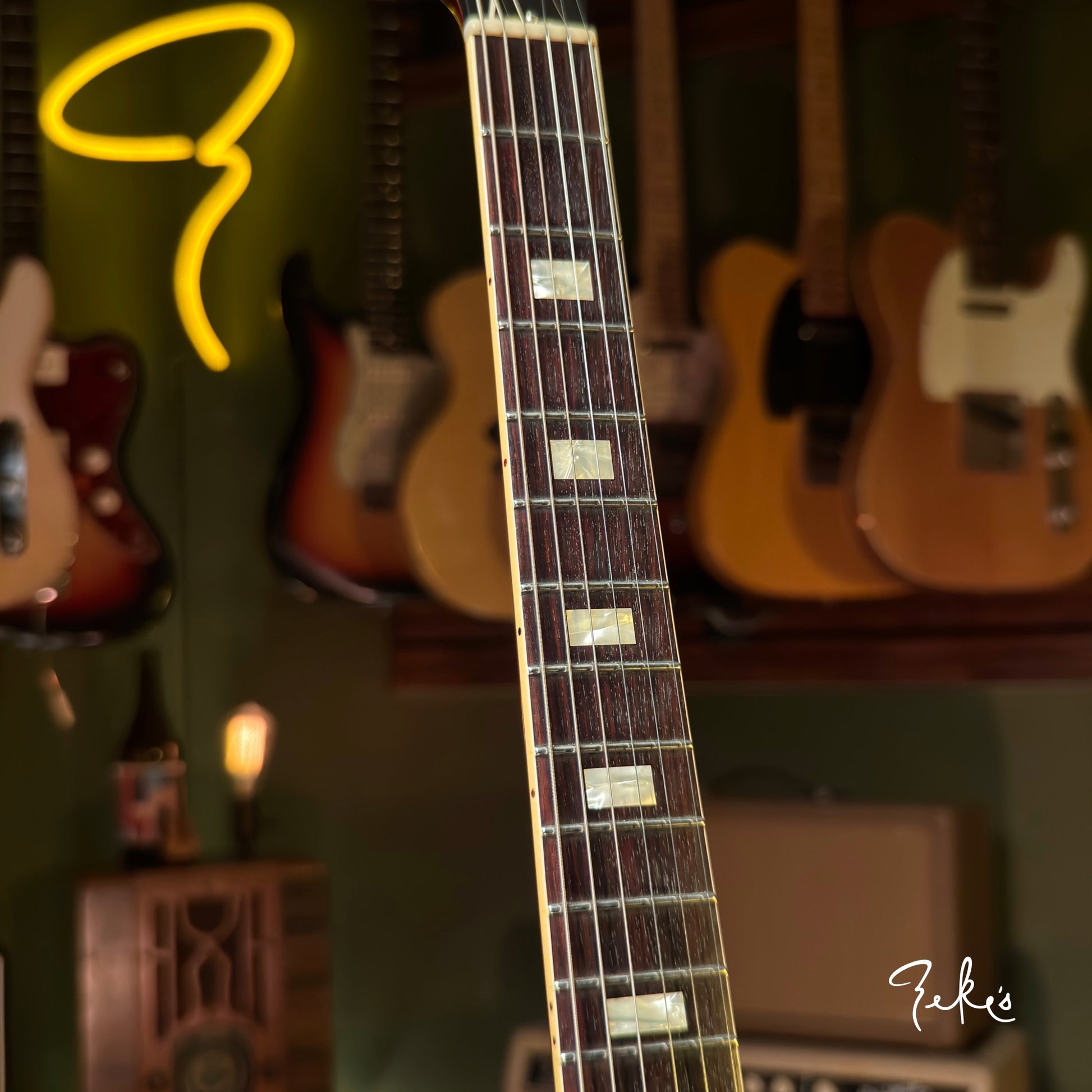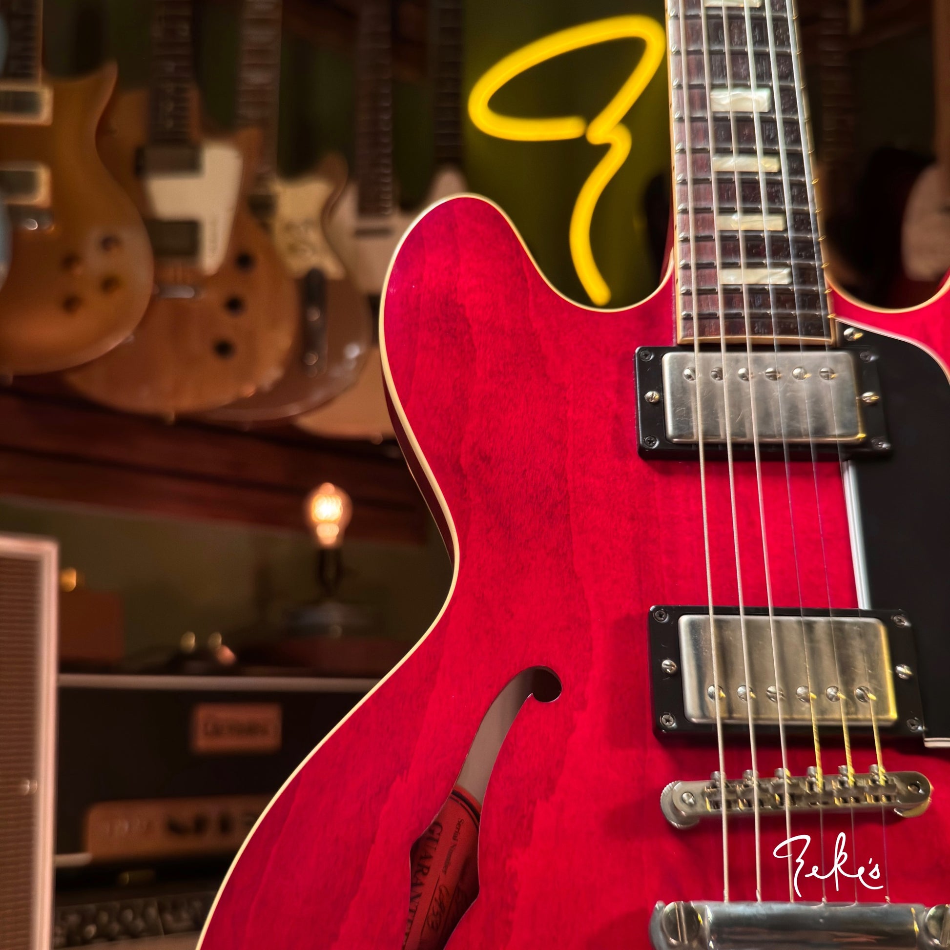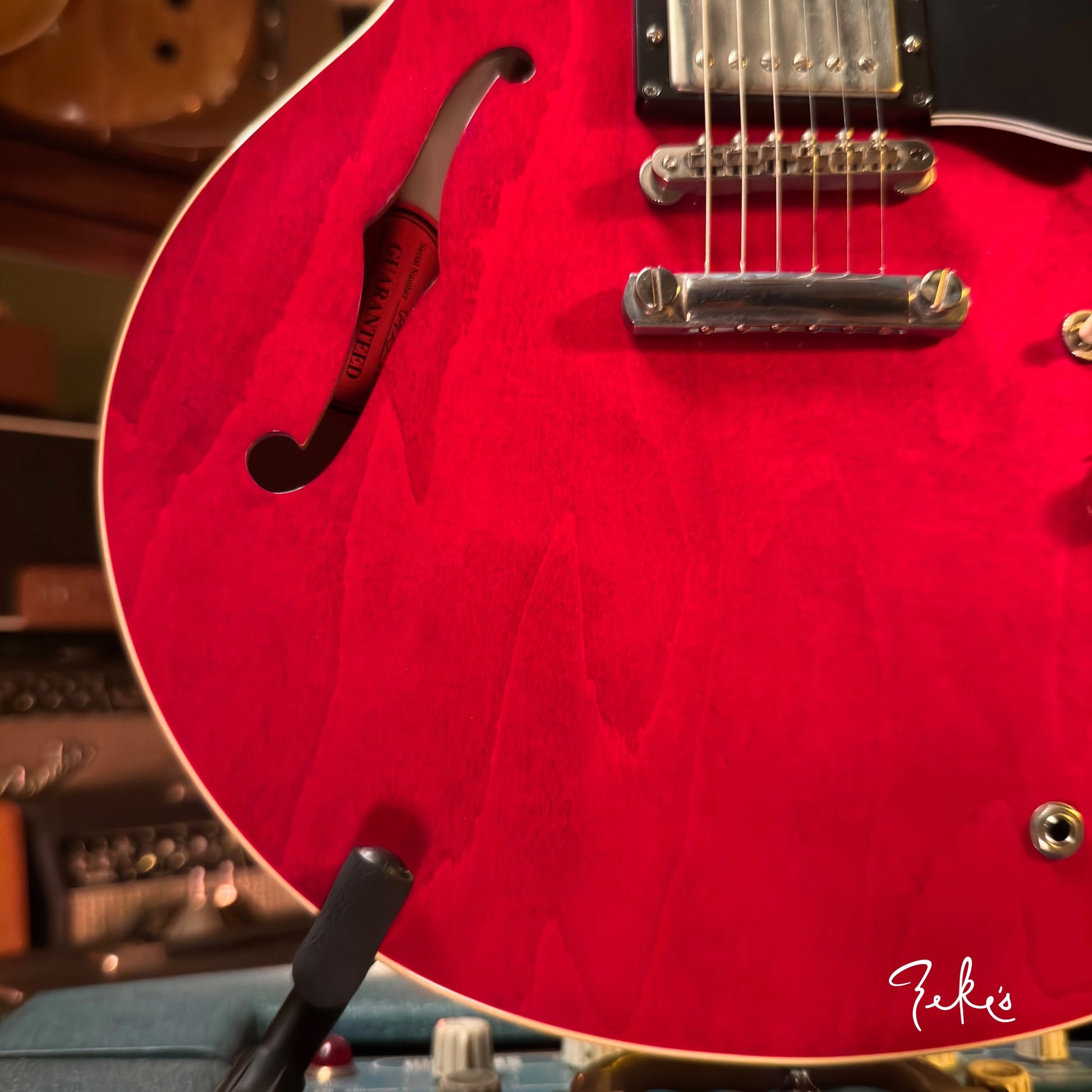 This one is in really great shape with normal player wear. It has had a bone nut added, and saddles replaced to the common nickel/brass (originals in the case with extra intonation screws). There's a Hare Krishna sticker on the headstock. A clear knod to Eric Clapton and his famous Cream era 335. Love that tone! At seven and a half pounds with a slim taper neck up to chunky this one feels great!