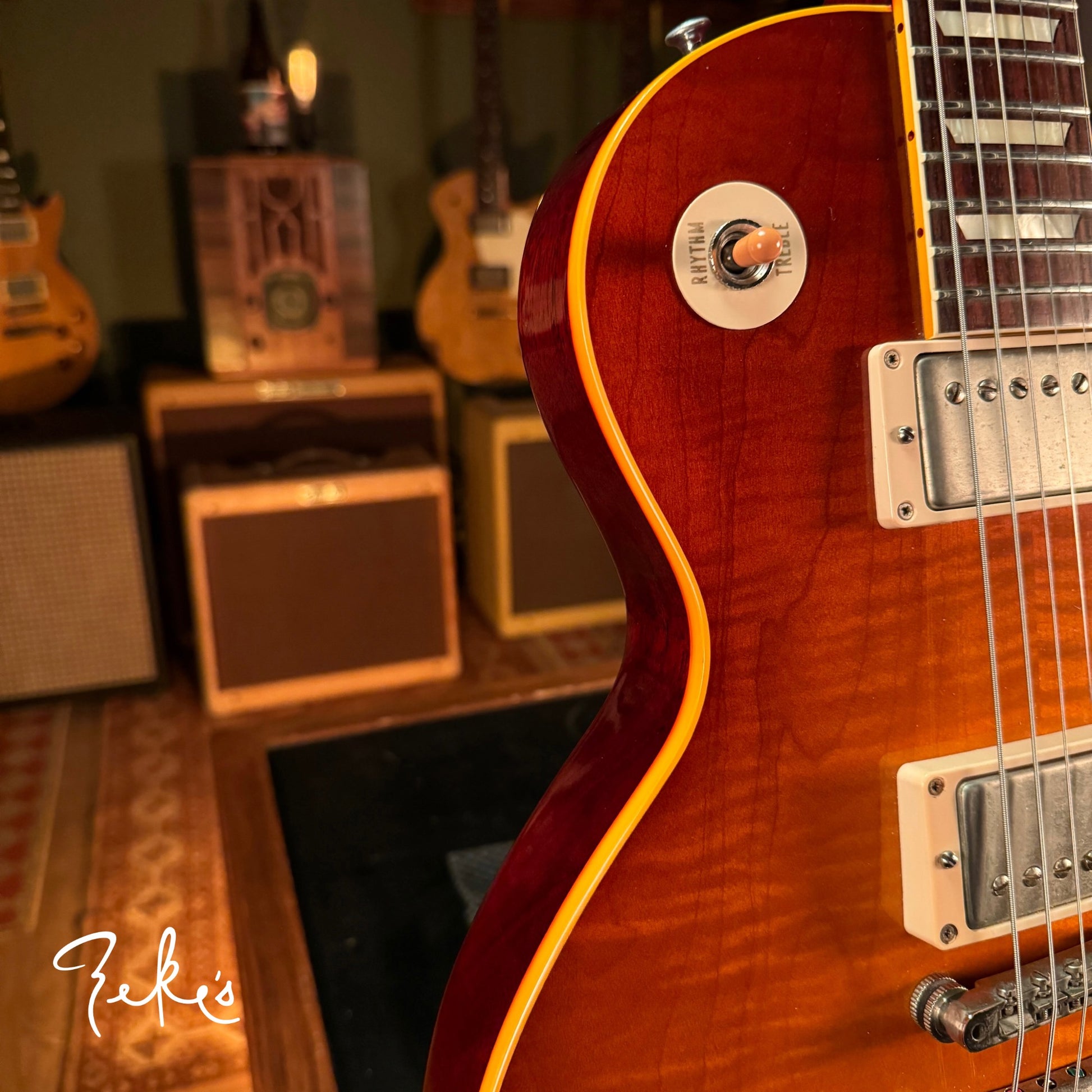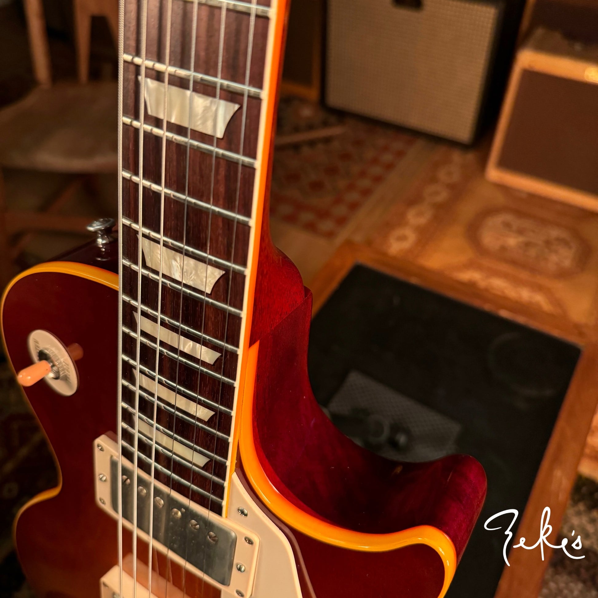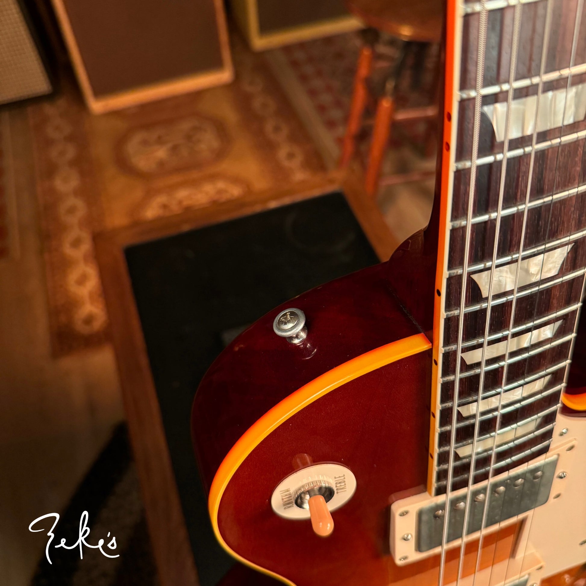 Anyway, we're stoked to have this killer LP in for a moment. It has been lovingly played a lot and still plays great. Great weight! We doubt it will be here long. This one was a part of a limited run done in 2017 and sold through Wildwood Guitars. (Definitely one of the BEST places to get a new Gibson). The word on the street is that these may or may not have been "repurposed" Collector's Choice #29 builds. That's not able to verified. They do have an extra thumbwheel at the bridge posts and a metal output jack, and the unique faded orange burst in common.