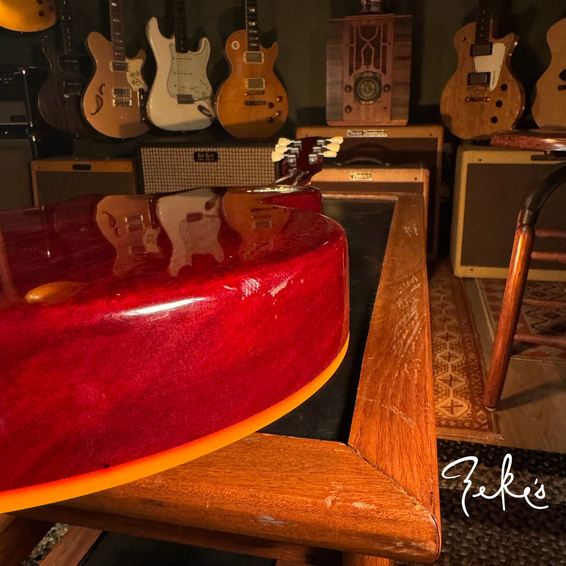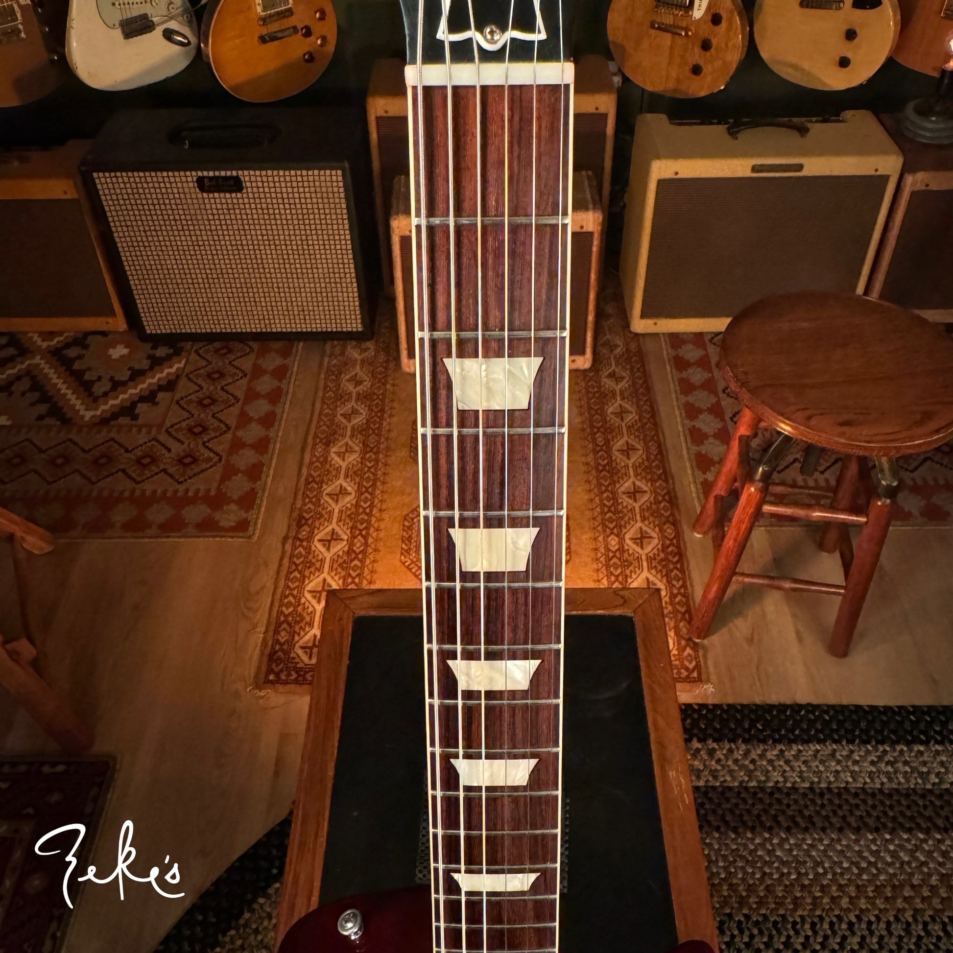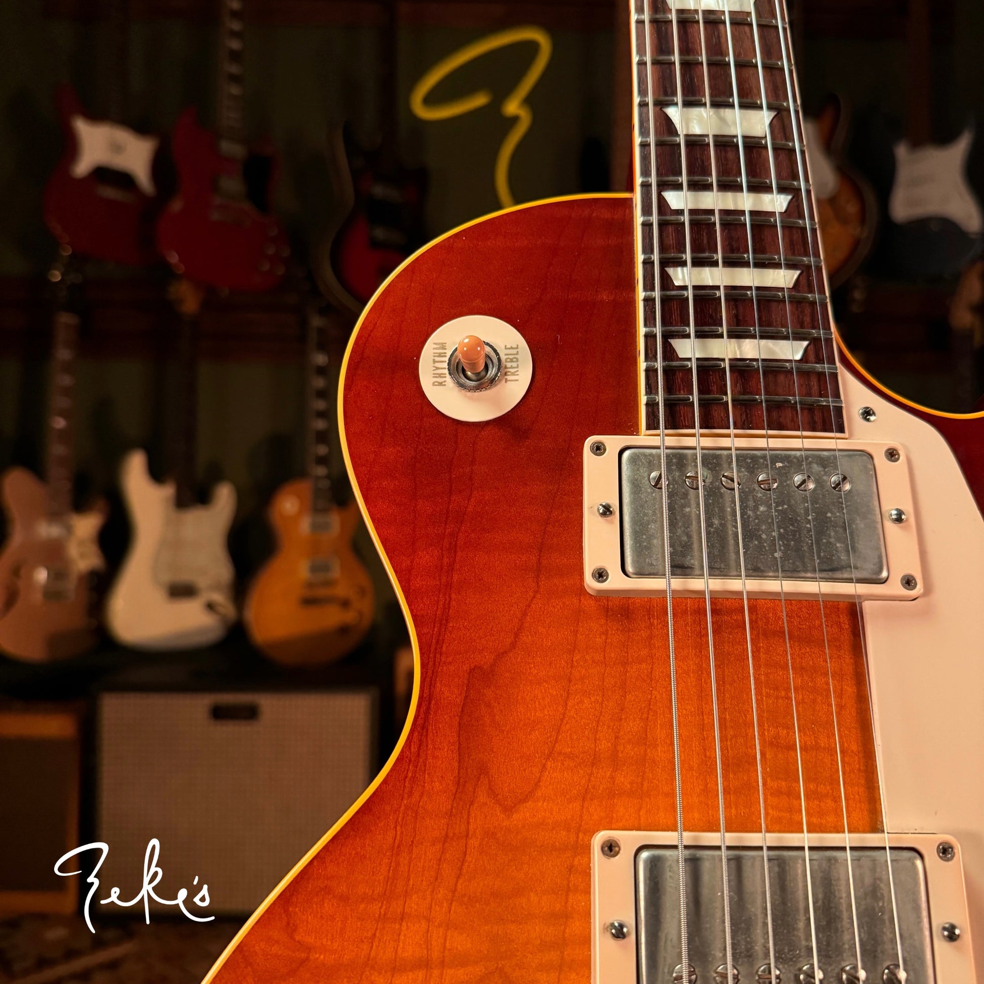 Anyway, we're stoked to have this killer LP in for a moment. It has been lovingly played a lot and still plays great. Great weight! We doubt it will be here long. This one was a part of a limited run done in 2017 and sold through Wildwood Guitars. (Definitely one of the BEST places to get a new Gibson). The word on the street is that these may or may not have been "repurposed" Collector's Choice #29 builds. That's not able to verified. They do have an extra thumbwheel at the bridge posts and a metal output jack, and the unique faded orange burst in common.