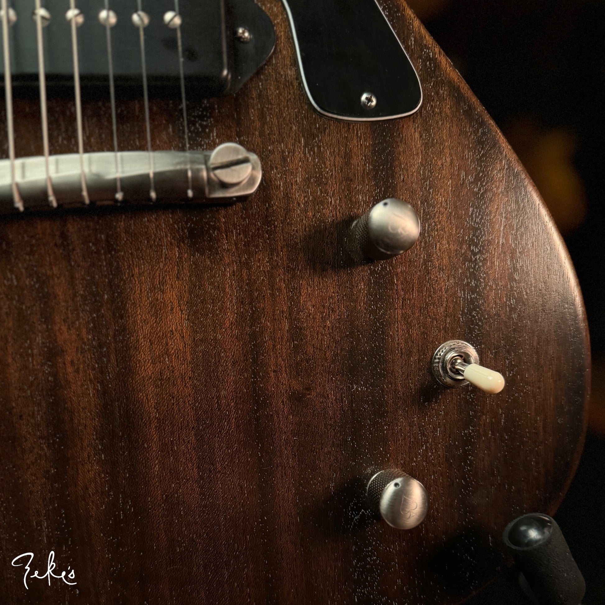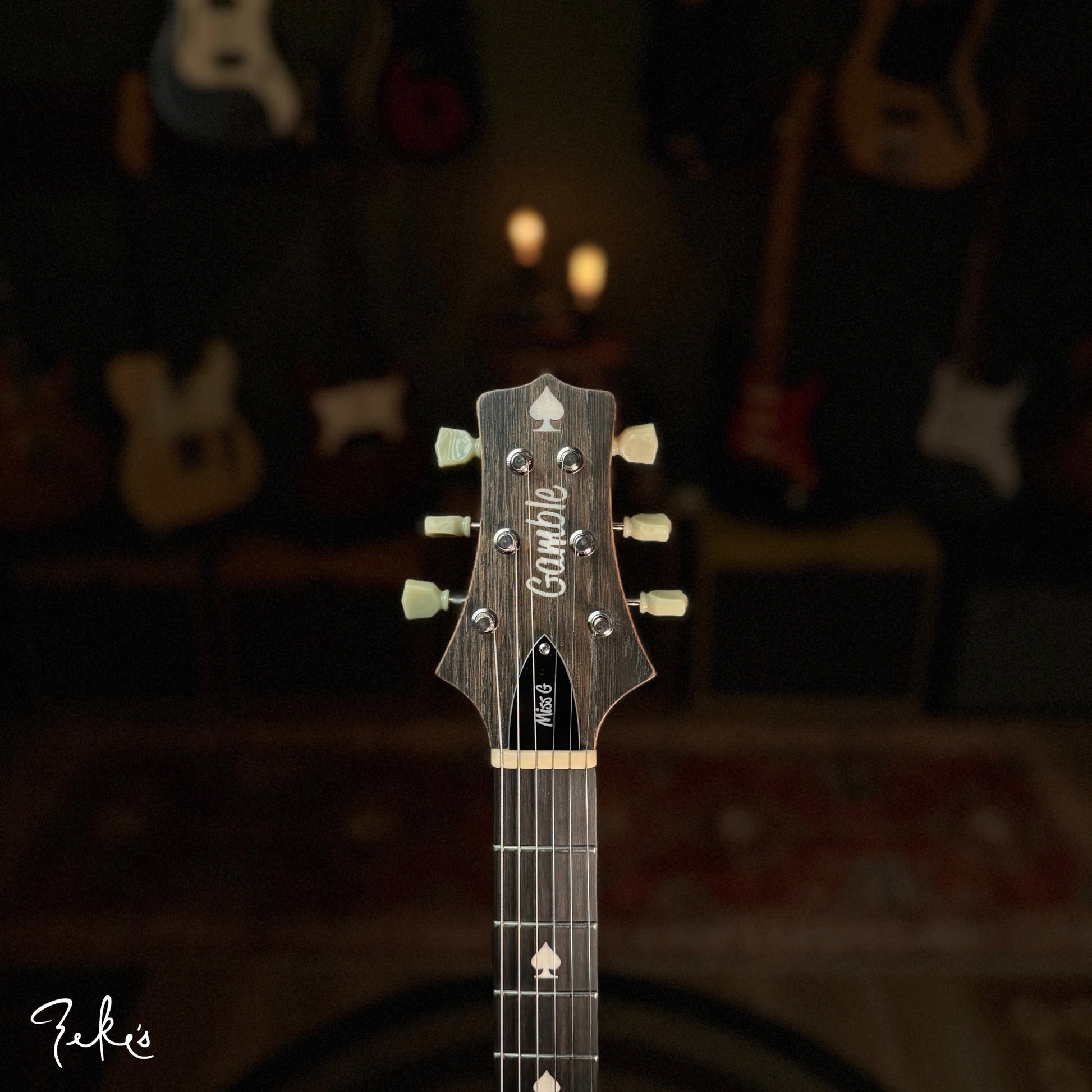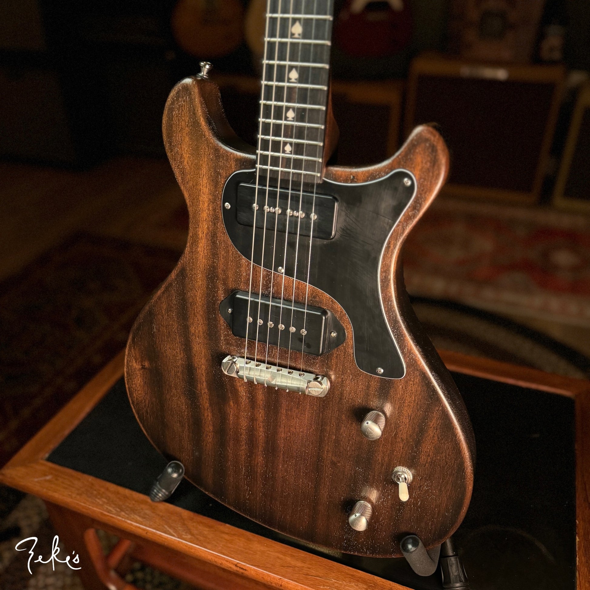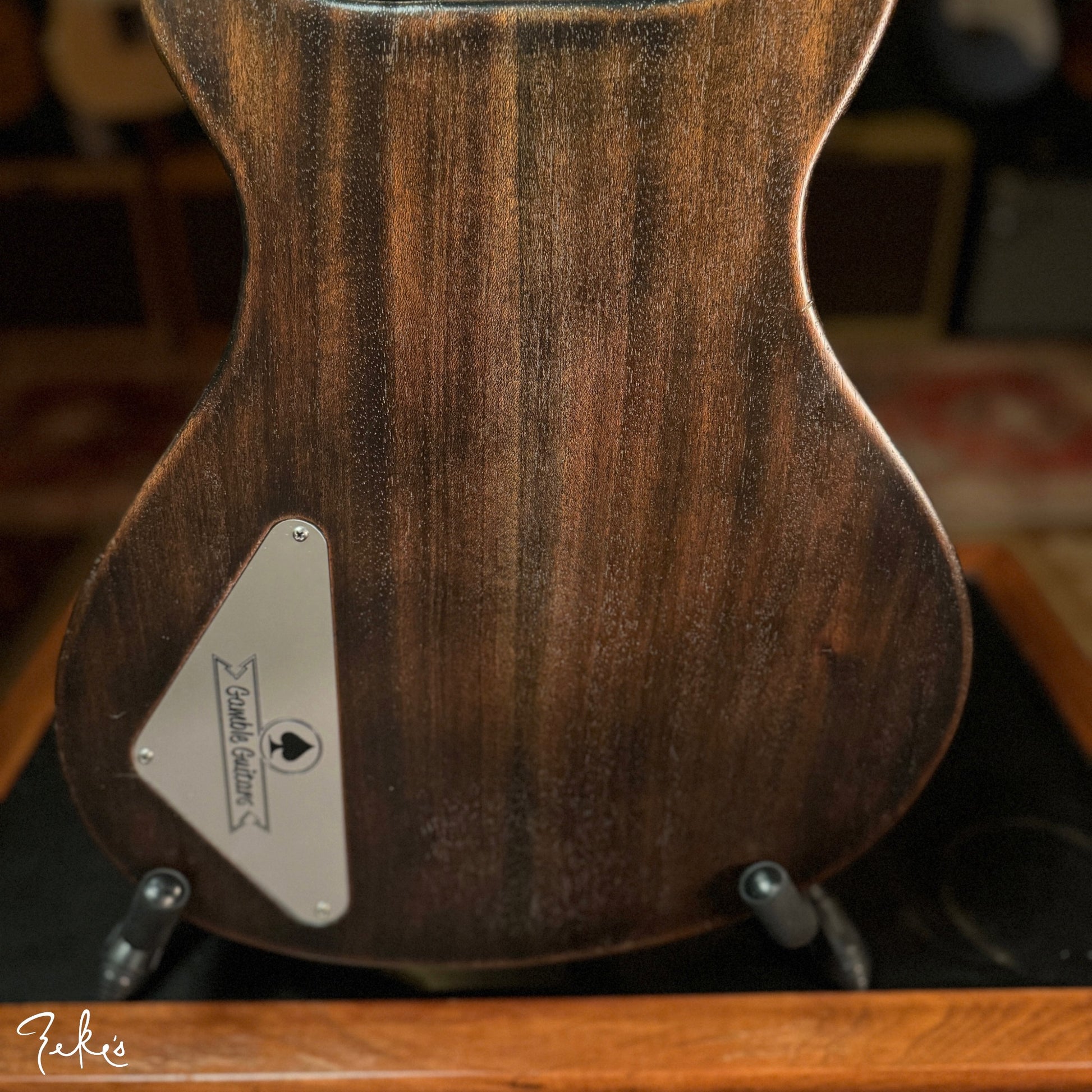 Here we have a well made double cut "Special" type with P90’s finely crafted in Germany. This Gamble made guitar came in to the shop unknown to us but has quickly made friends. Everything is there. The craftsmanship. The extremely well balanced neck to body weight with a lot of acoustic sustain. The pickups have what you’d want from great P90’s. Constant clarity, whether it’s loud and proud or quiet and always touch sensitive.