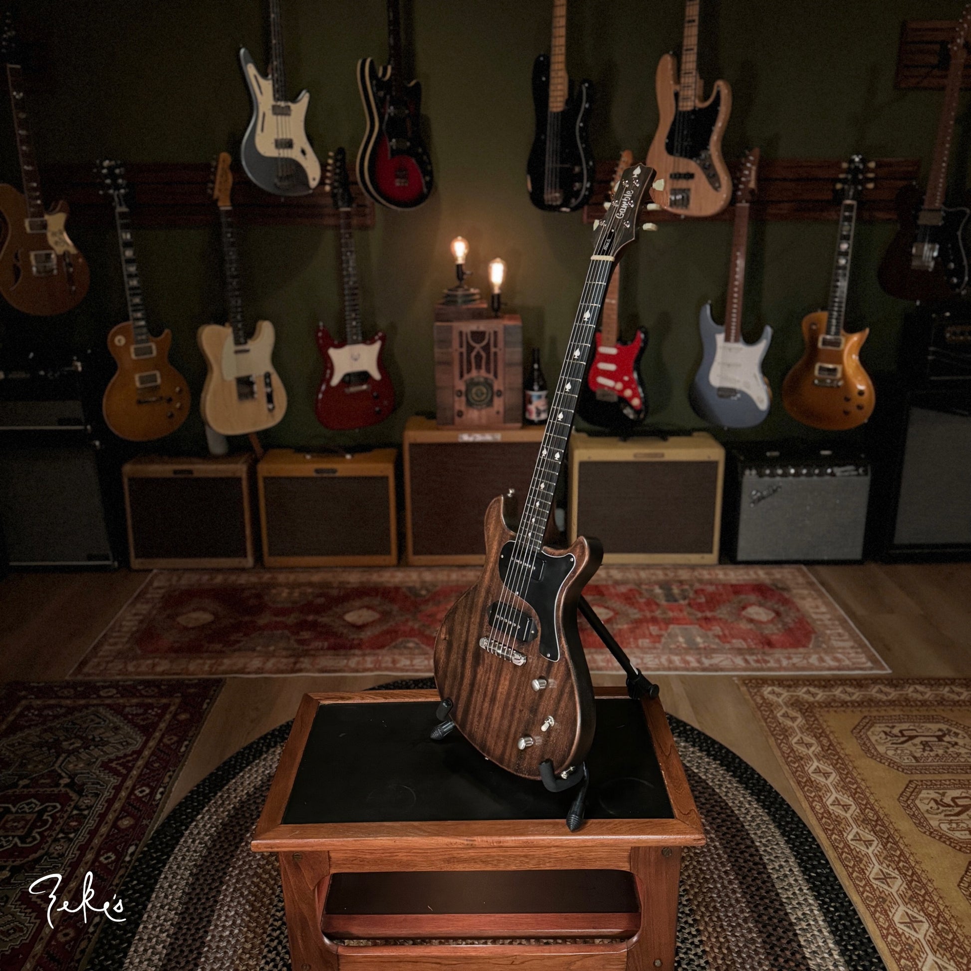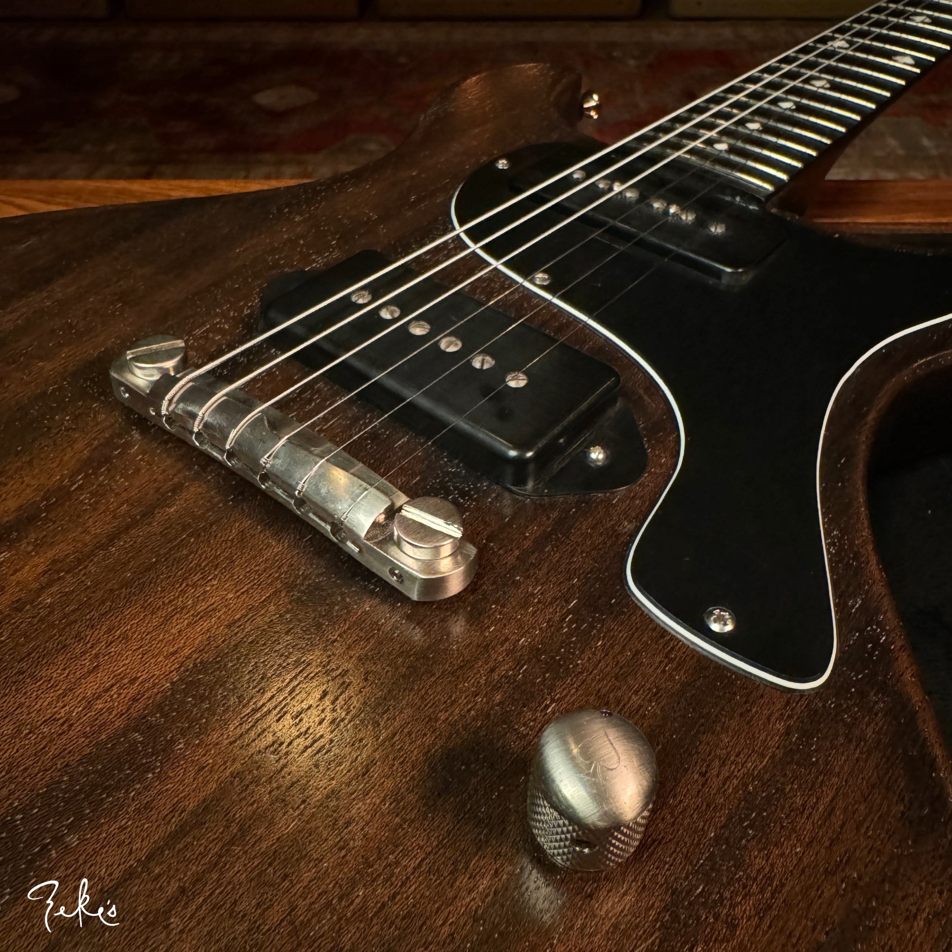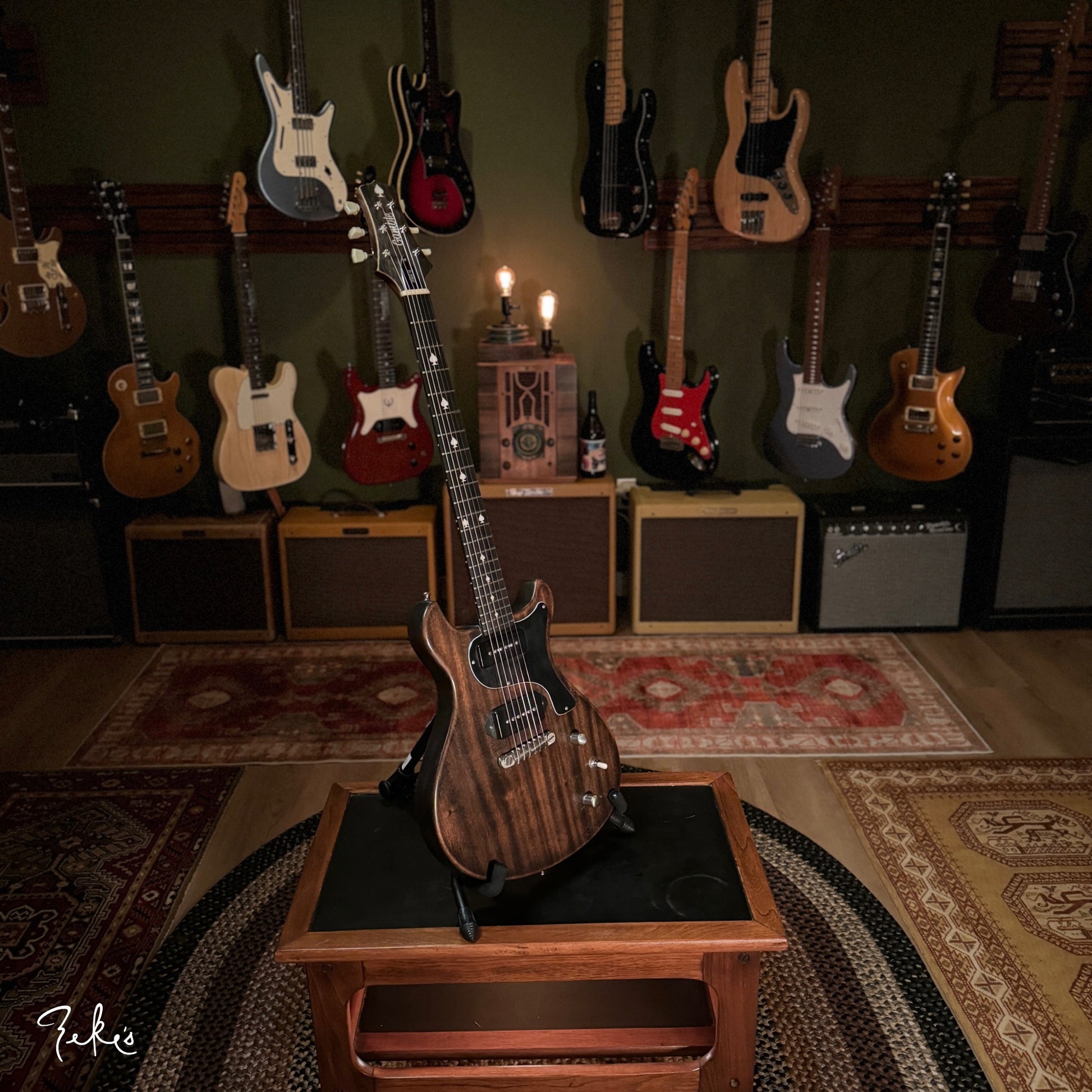 Here we have a well made double cut "Special" type with P90’s finely crafted in Germany. This Gamble made guitar came in to the shop unknown to us but has quickly made friends. Everything is there. The craftsmanship. The extremely well balanced neck to body weight with a lot of acoustic sustain. The pickups have what you’d want from great P90’s. Constant clarity, whether it’s loud and proud or quiet and always touch sensitive.