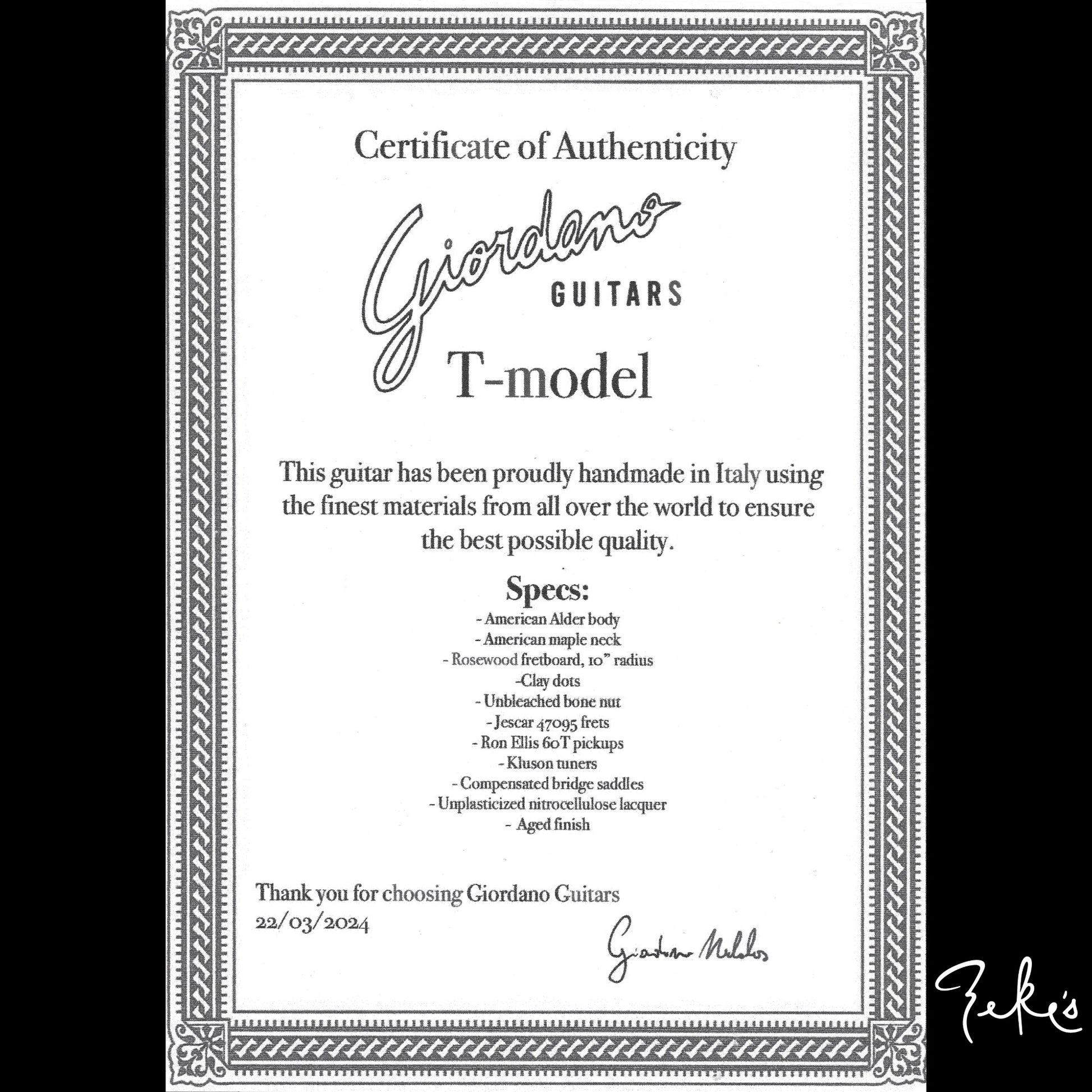 Here we have a handmade T Style double bound instrument built by Nicholas Giordano; a young man in Reggio Emilia, Italy who is proving to be an incredible guitar builder way beyond his age. We are happy to carry his fantastic guitars. Nicholas has been very accommodating to the specifics Zeke's Guitars & Mercantile has requested based on my own playing experiences and tastes. As a result, this is one of many more to come from Giordano Guitars with a few "Zeke" requests.