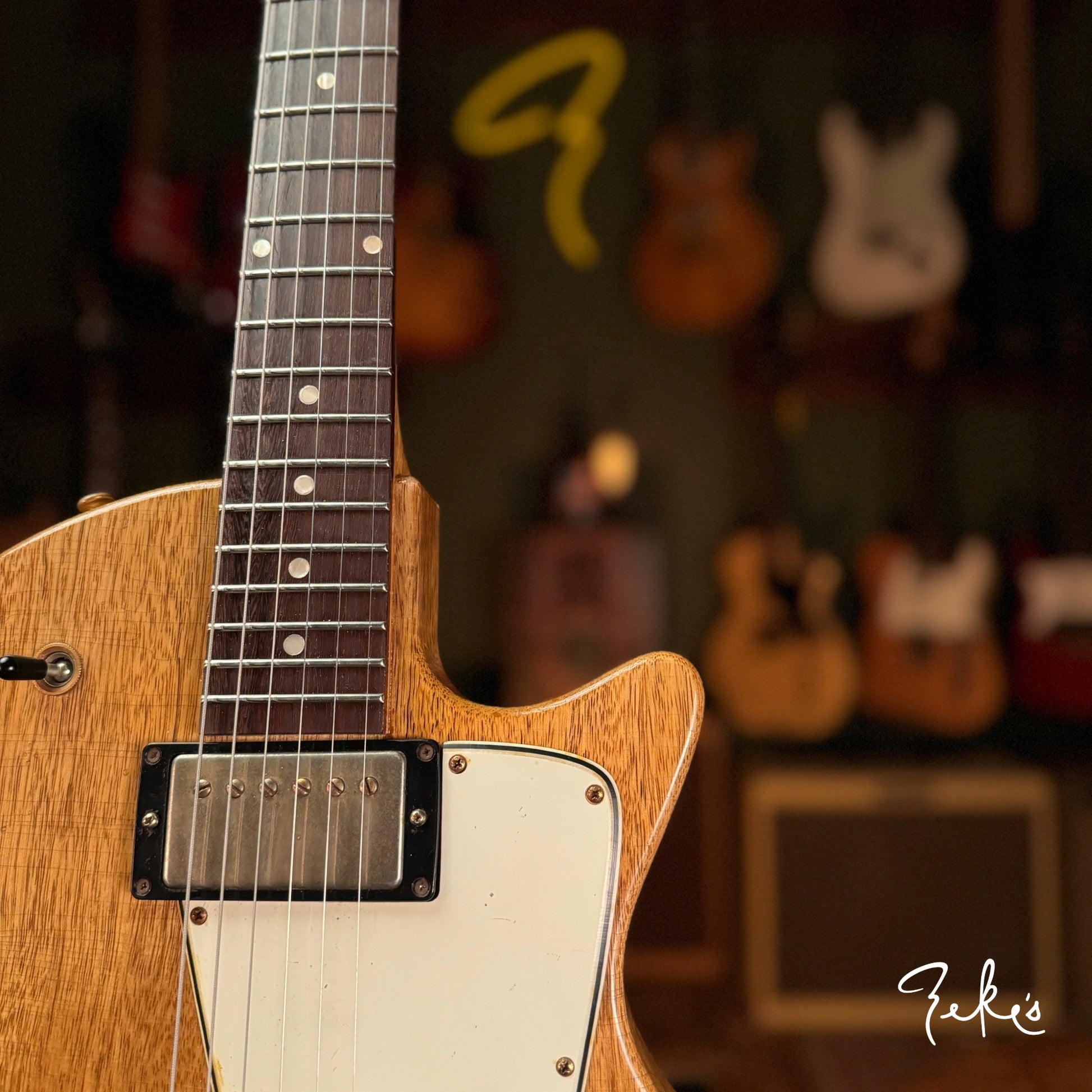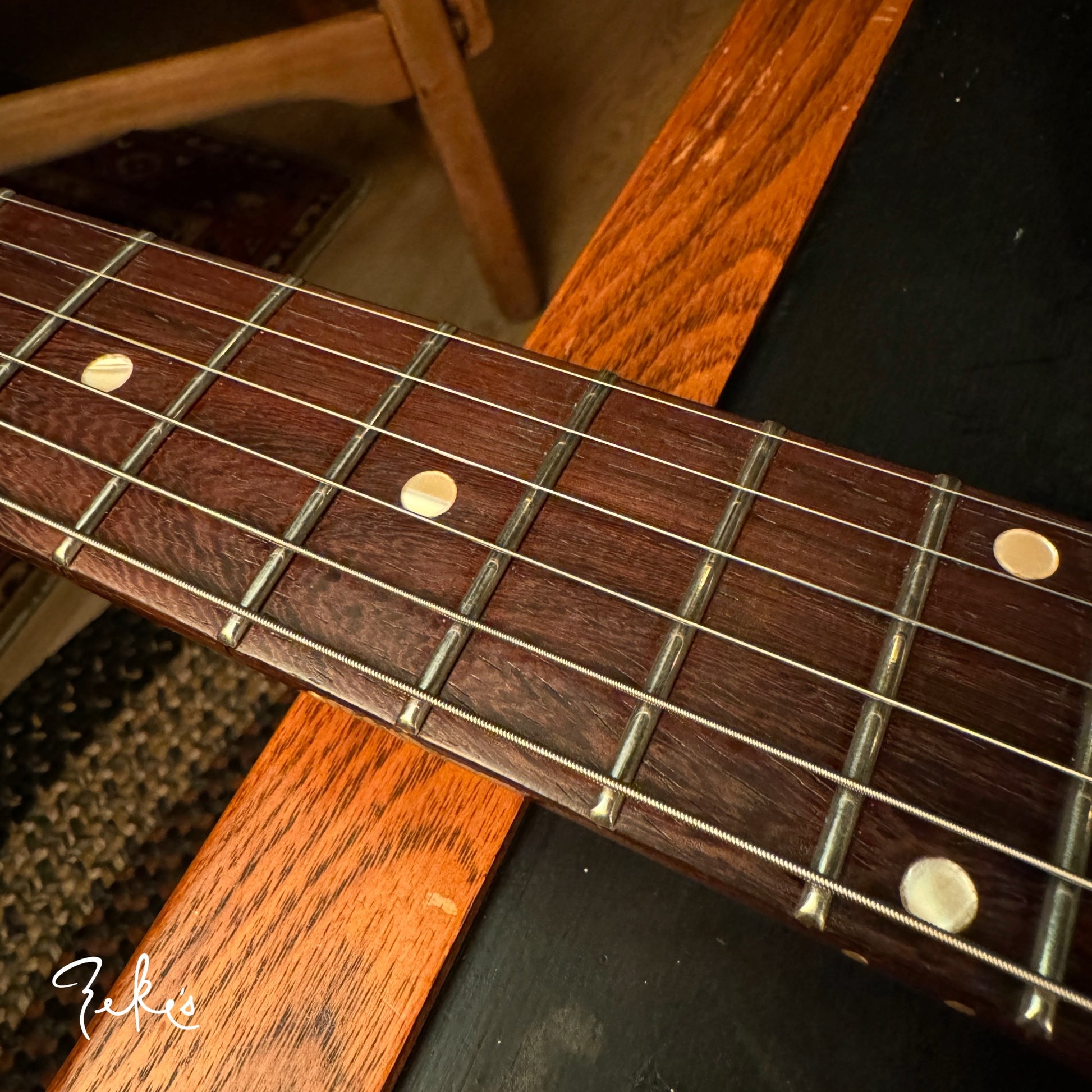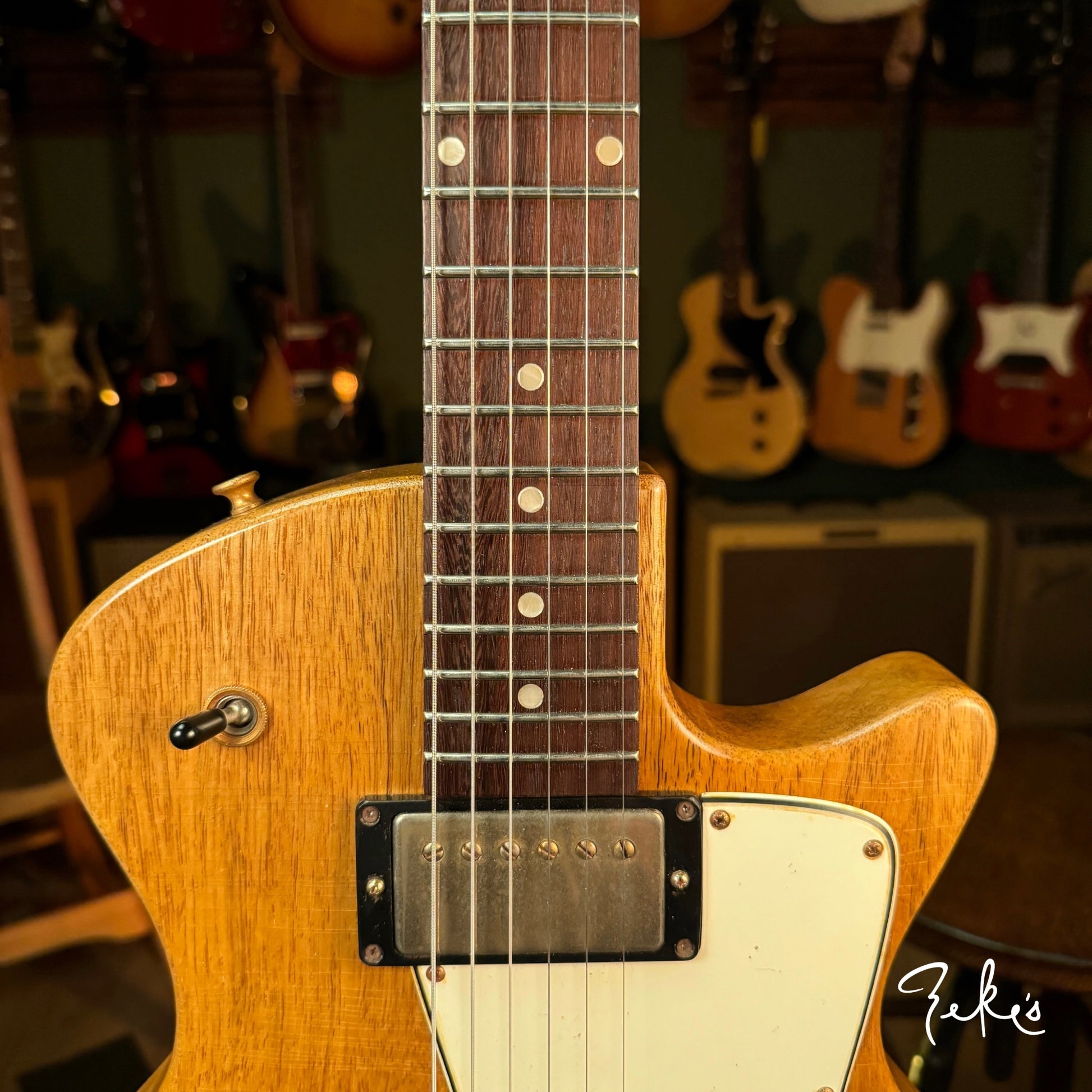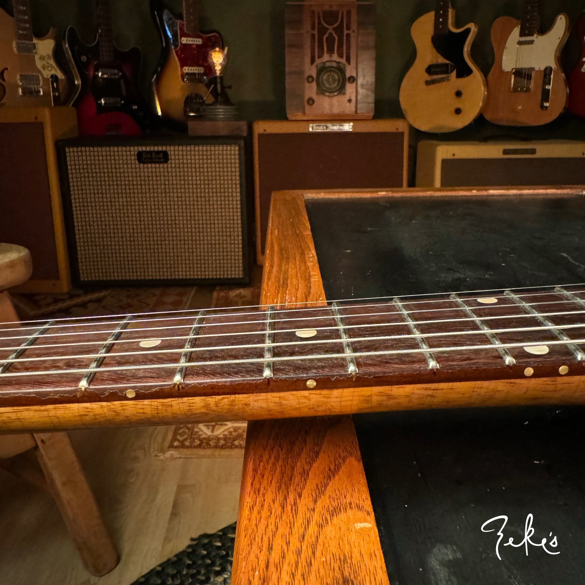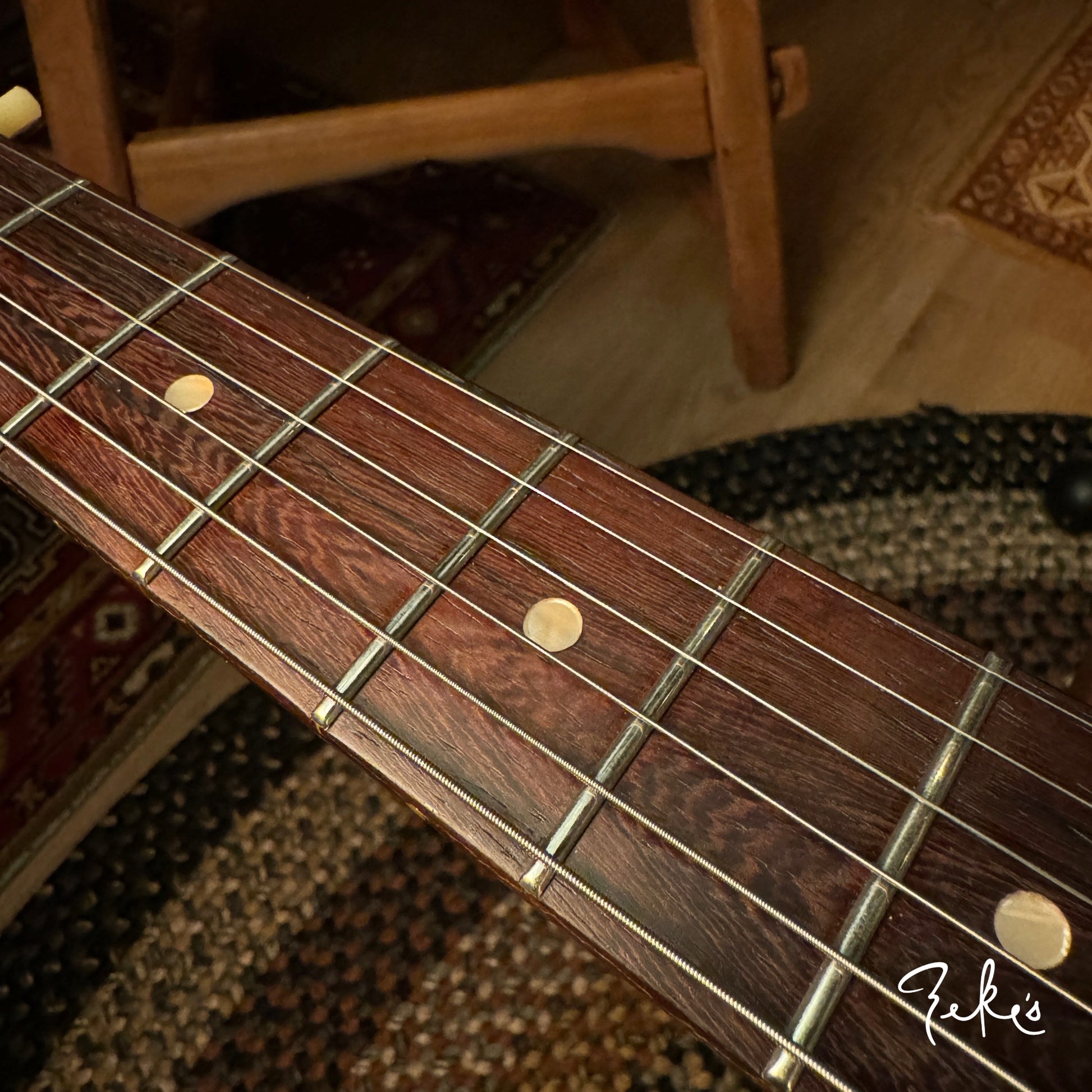 We love his creative take on a classic body shape and the "end of the book" headstock design. Check out the tight grains of the Rosewood fretboard. This guitar acoustically rings like crazy! What an inspiring instrument. This one and the others we have/will be receiving from Giordano, we're calling premium builds. With some of our own "Zeke" requests, that Nicholas was more than accommodating with, really make these guitars truly great. Come and check these out if you can or reach out and we will answer any questions you may have.
