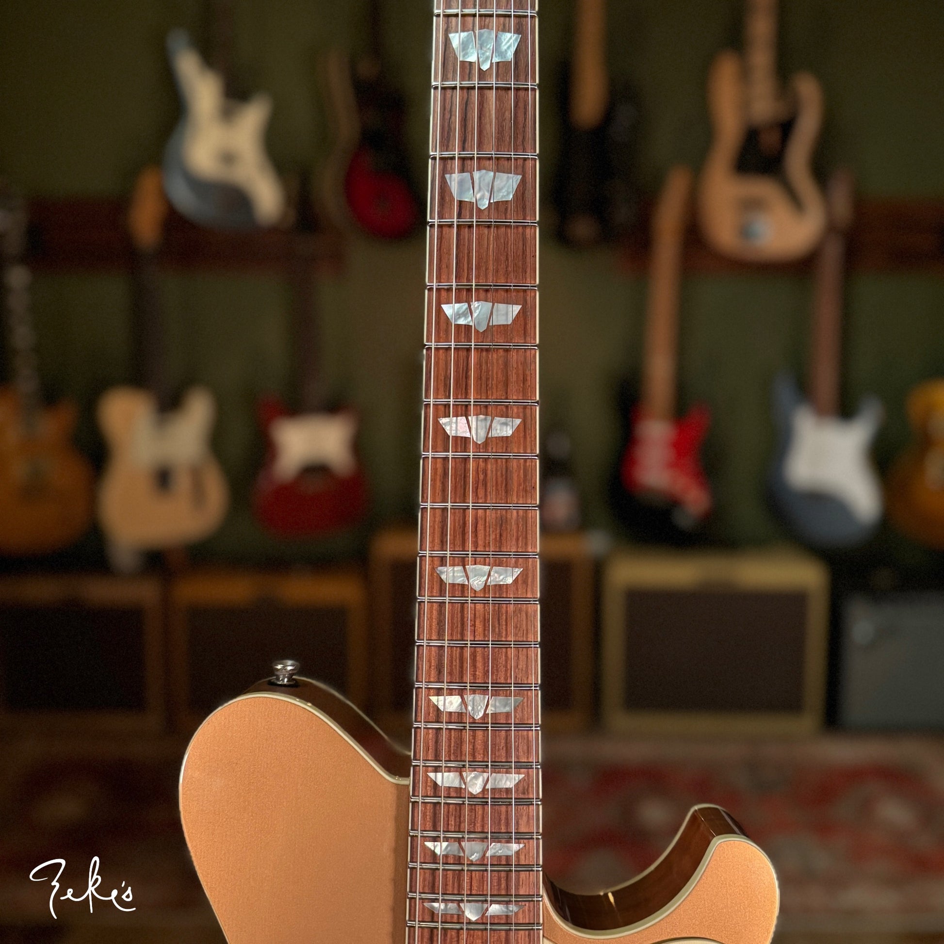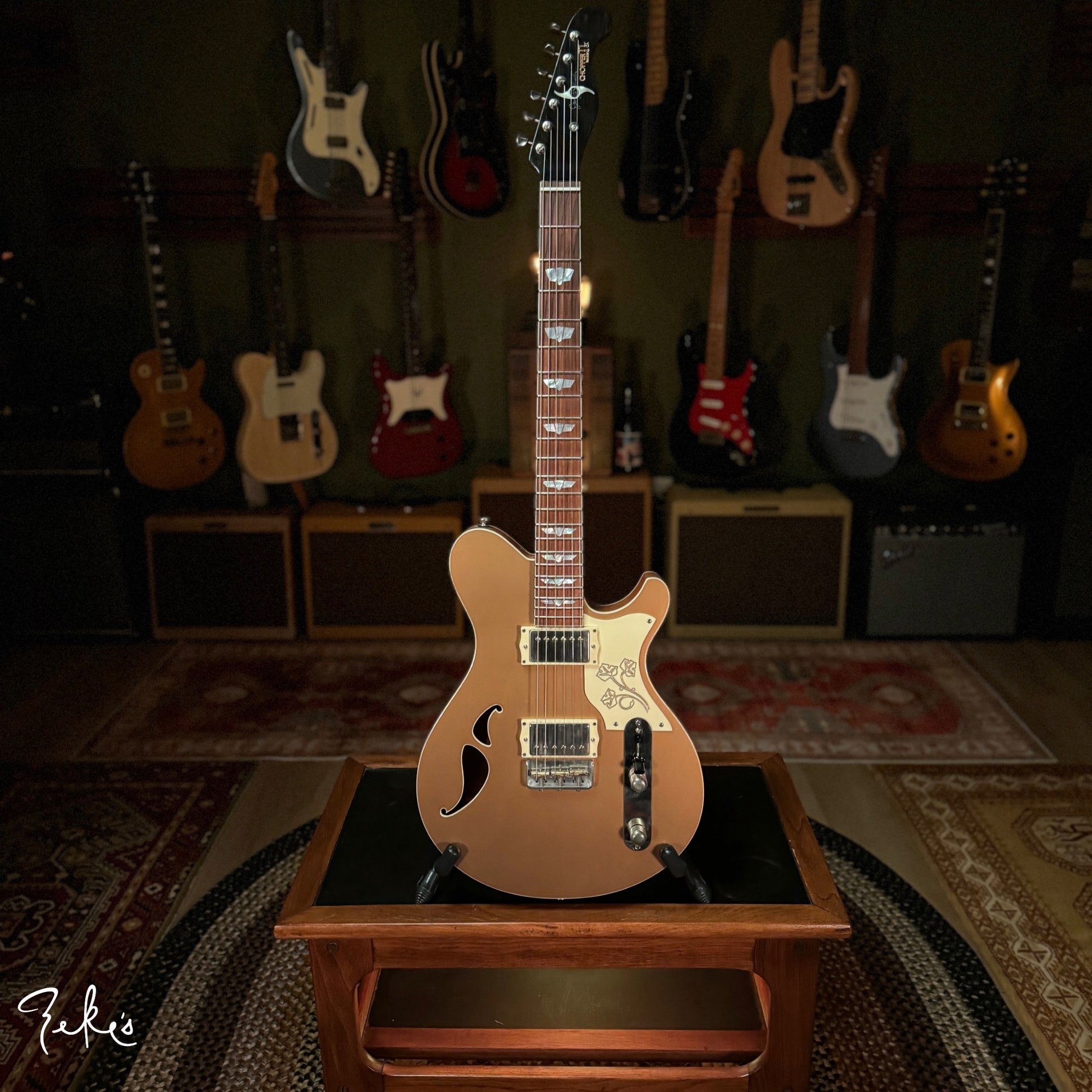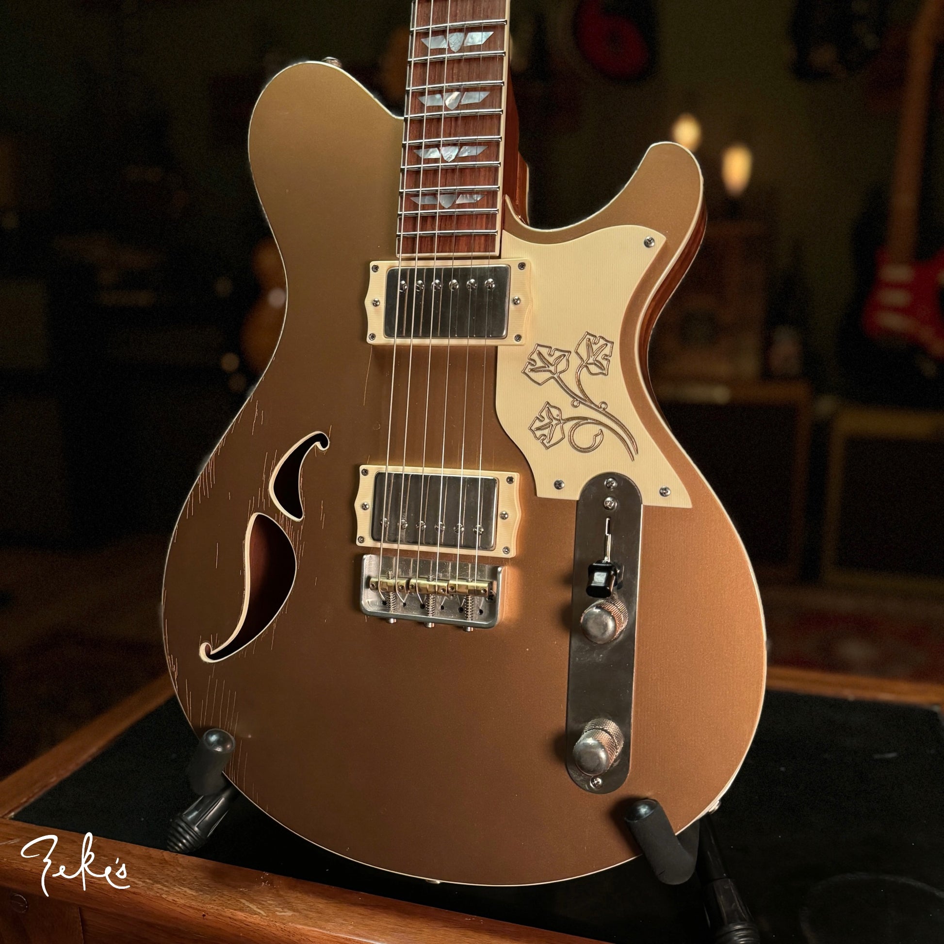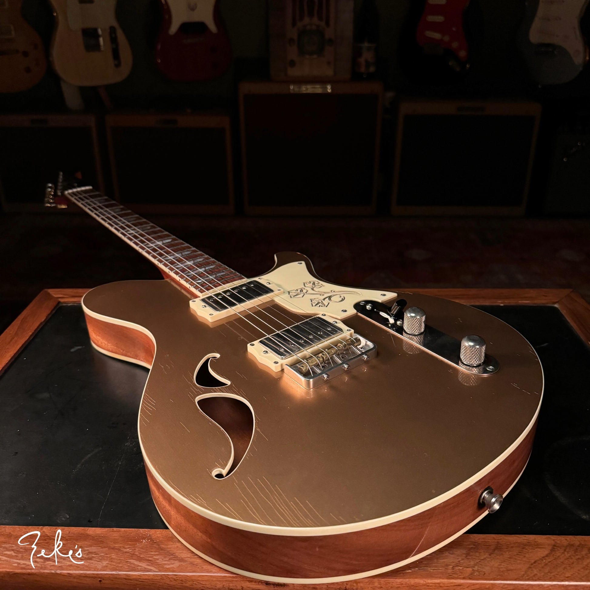 Would you like an ES meets a T? Yes please. What a really cool build from Schroeder Guitars. Authentic nitro Goldtop with Honduran mahogany back and neck. Ebony head plate veneer, stainless frets, Deco-Trap inlays, custom one-off Schroeder half-T bridge! It sounds as good as it looks.