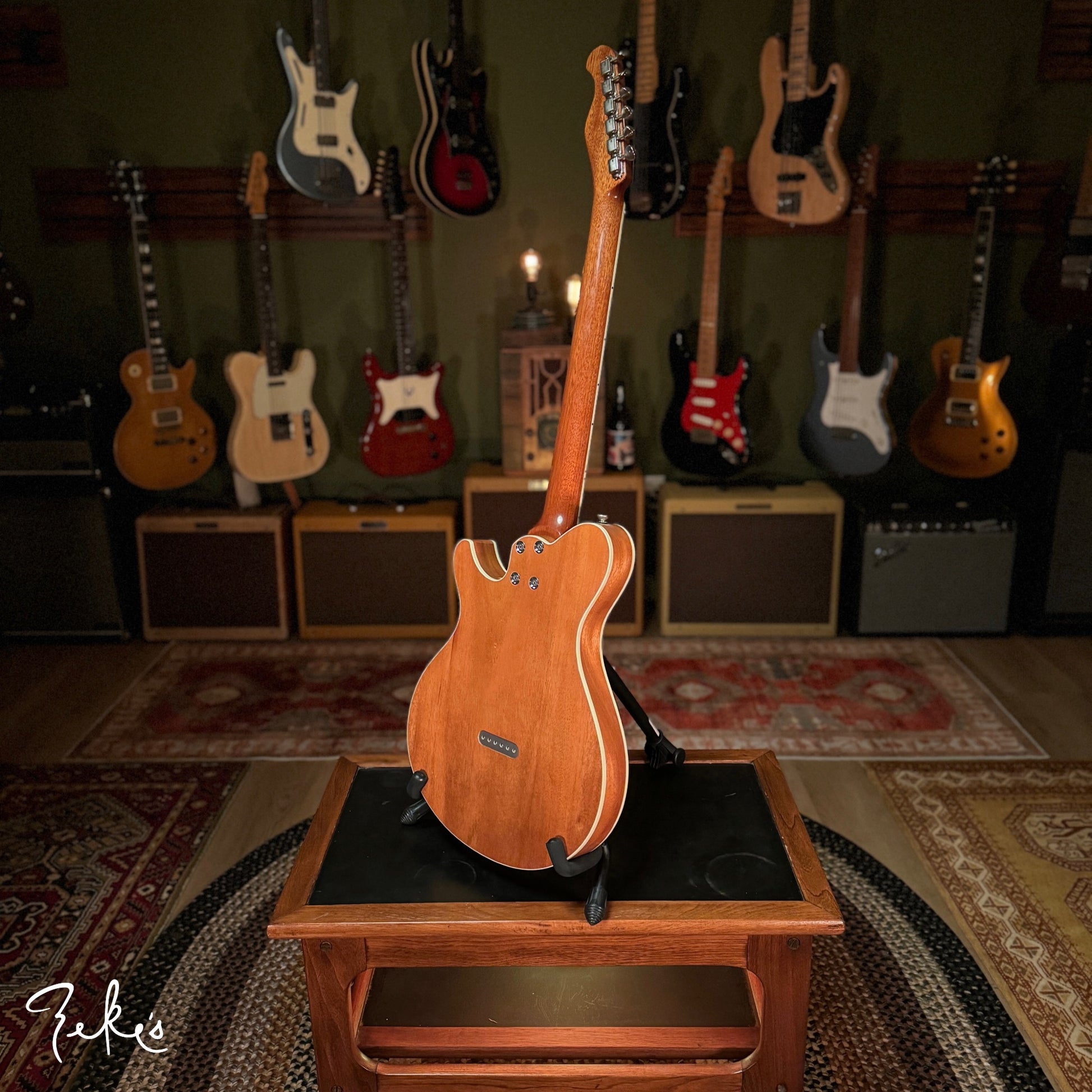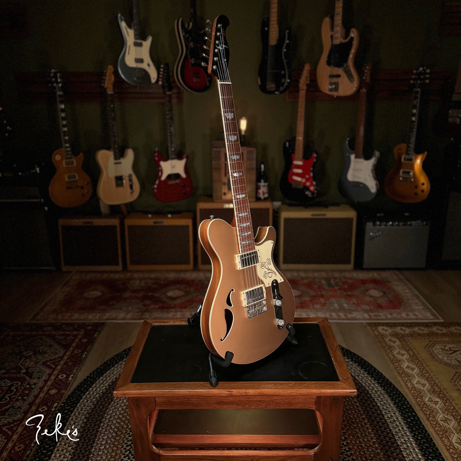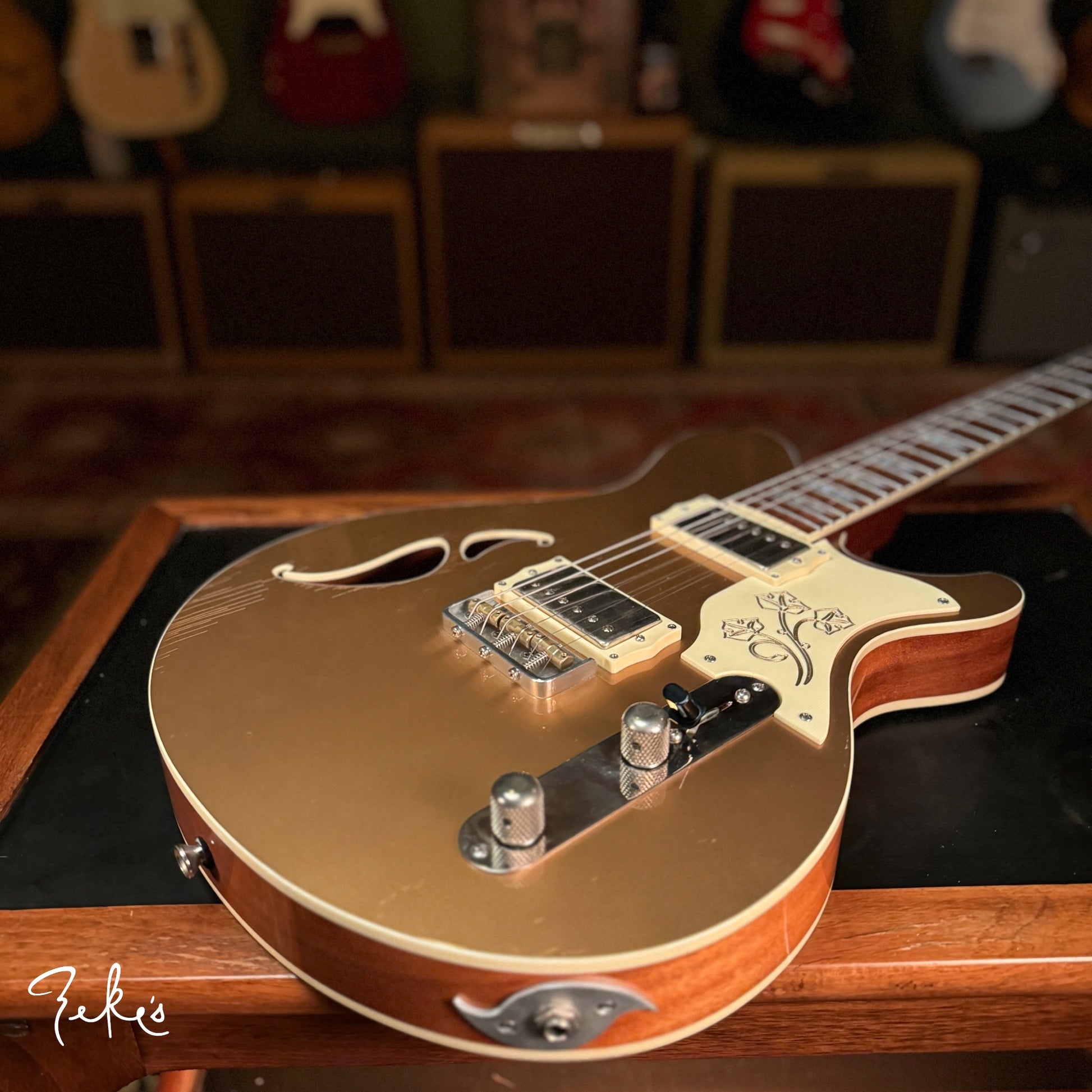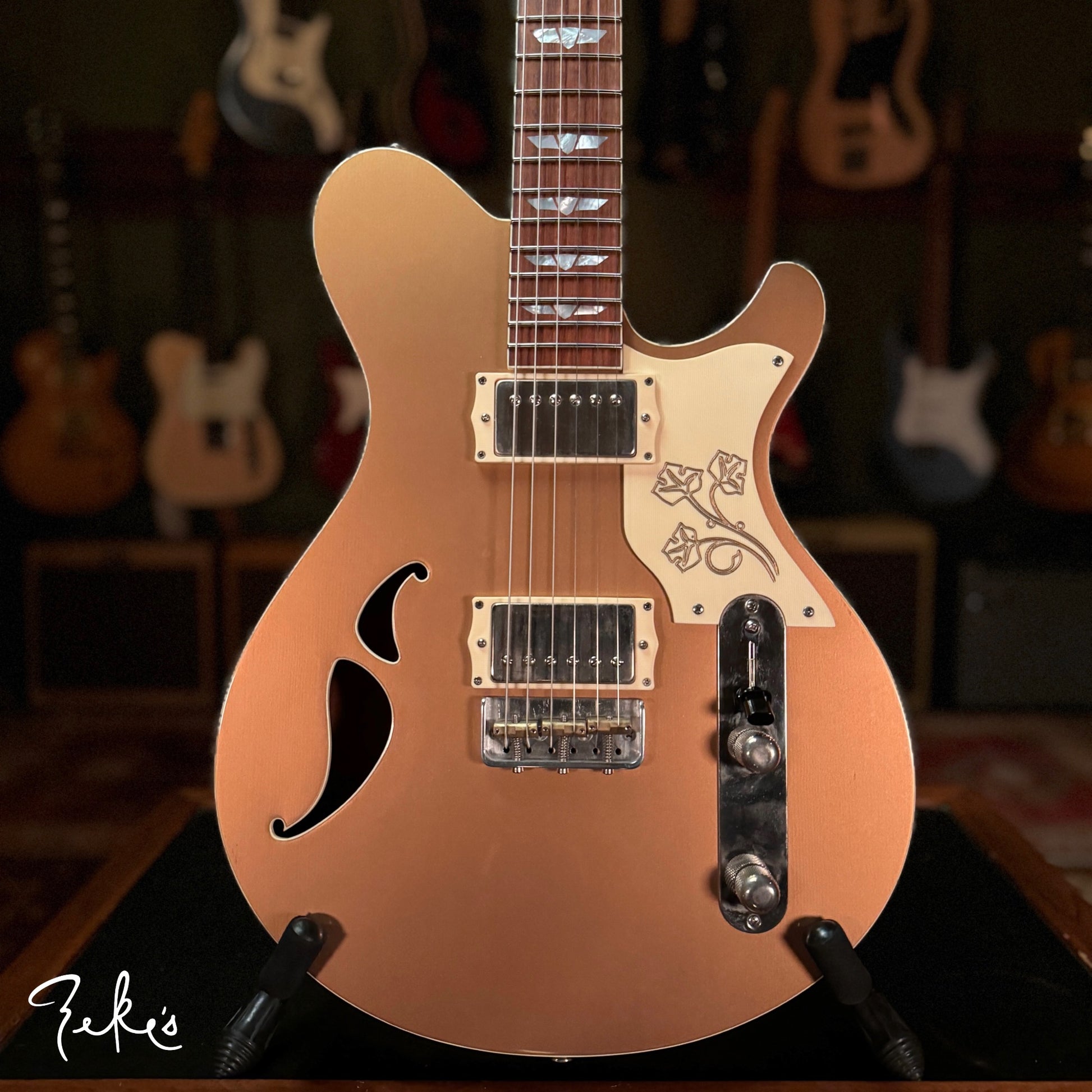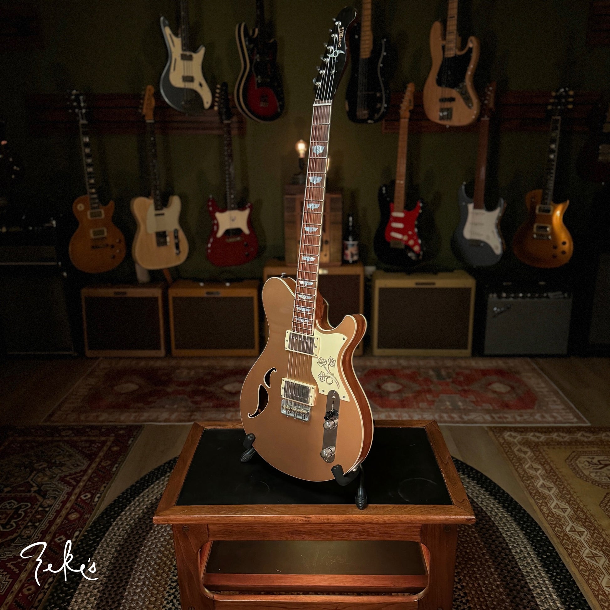 Would you like an ES meets a T? Yes please. What a really cool build from Schroeder Guitars. Authentic nitro Goldtop with Honduran mahogany back and neck. Ebony head plate veneer, stainless frets, Deco-Trap inlays, custom one-off Schroeder half-T bridge! It sounds as good as it looks.