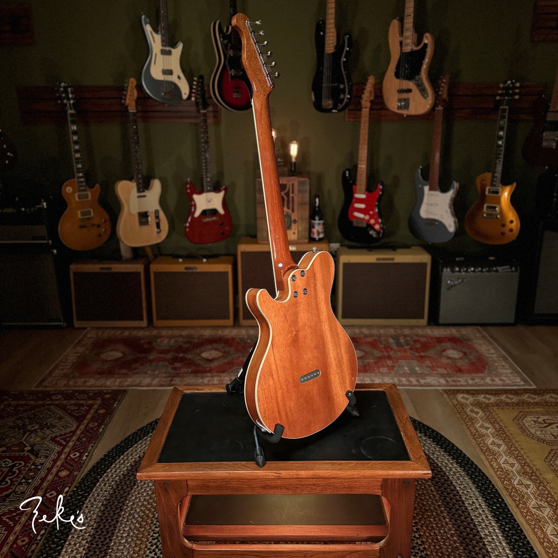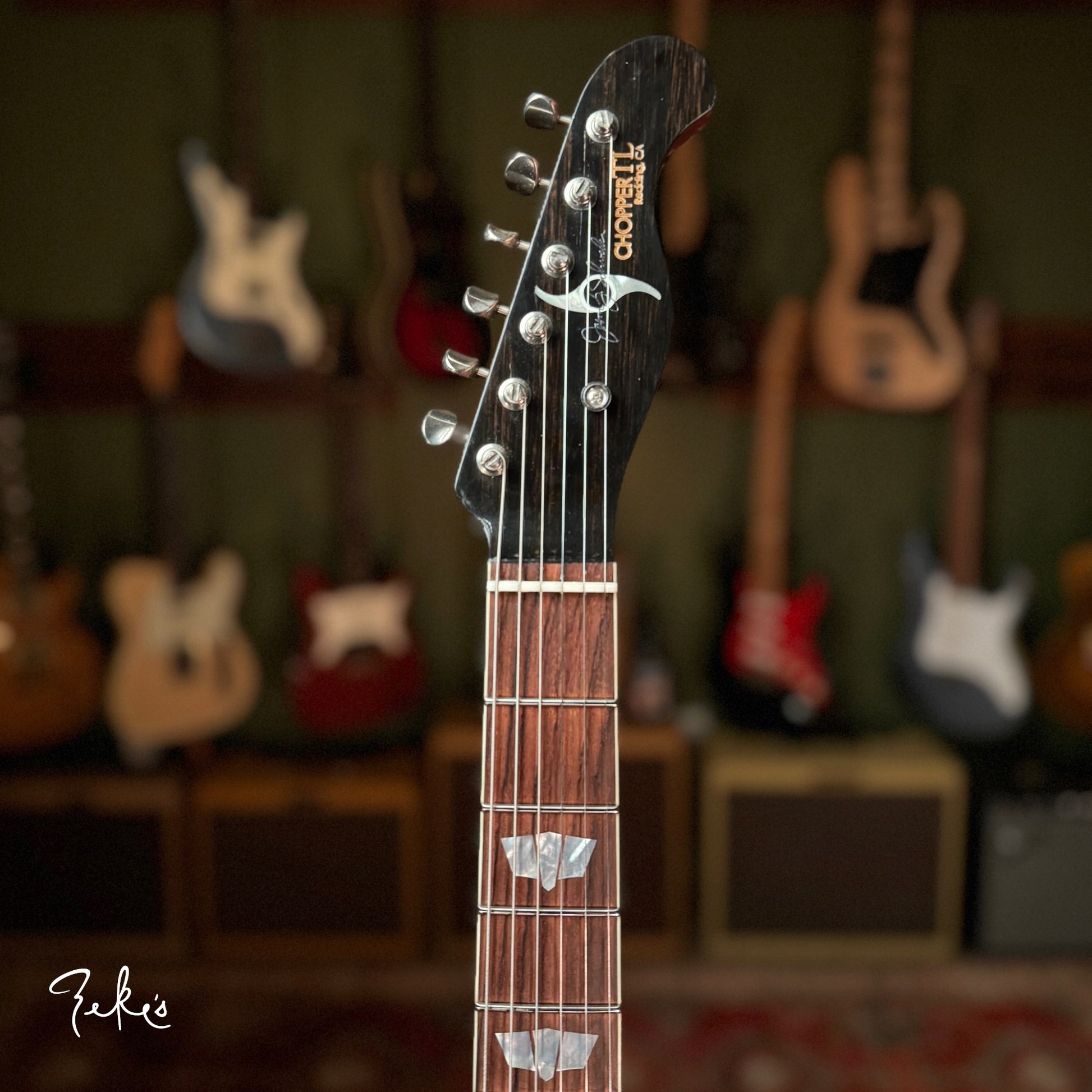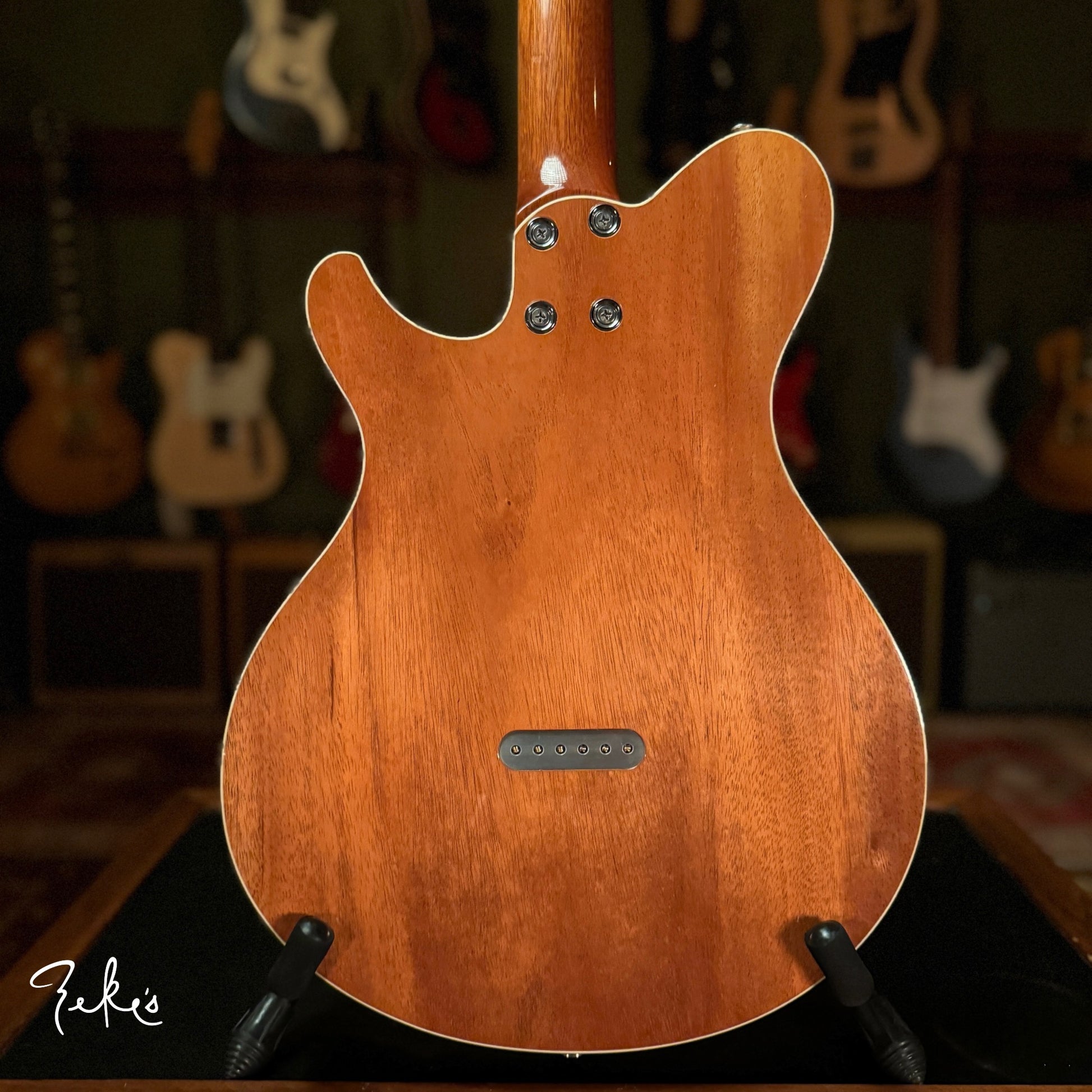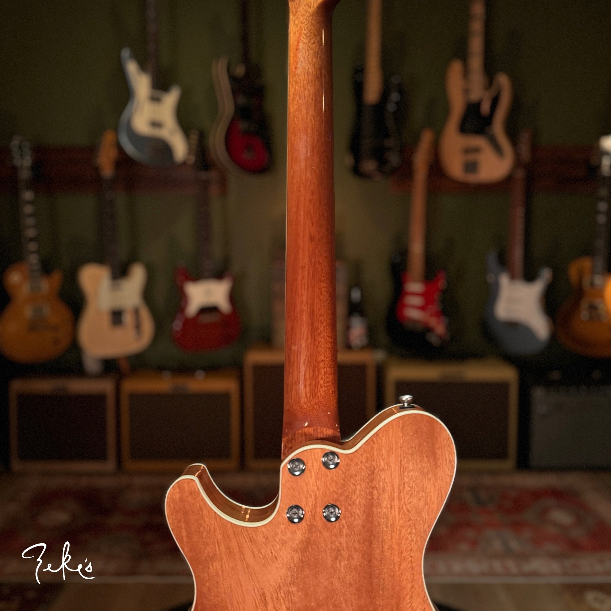 Would you like an ES meets a T? Yes please. What a really cool build from Schroeder Guitars. Authentic nitro Goldtop with Honduran mahogany back and neck. Ebony head plate veneer, stainless frets, Deco-Trap inlays, custom one-off Schroeder half-T bridge! It sounds as good as it looks.